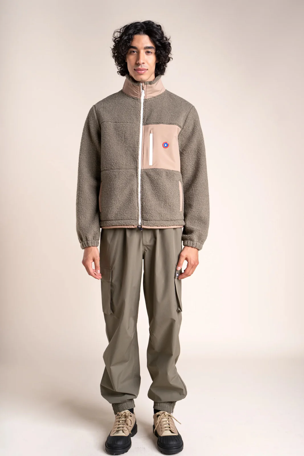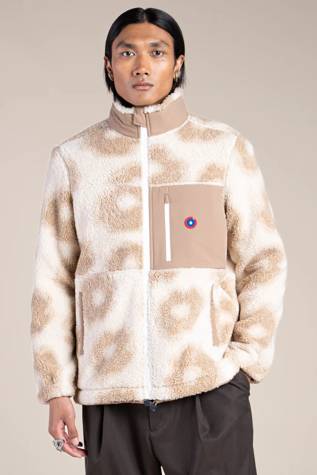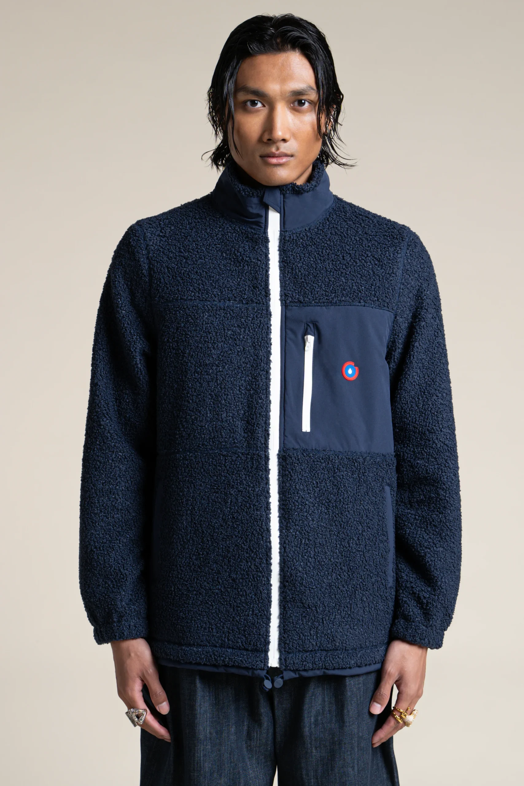 Une veste en polaire recyclé et épais effet sherpa. Ultra-chaude et confortable. Col montant. Trois poches.