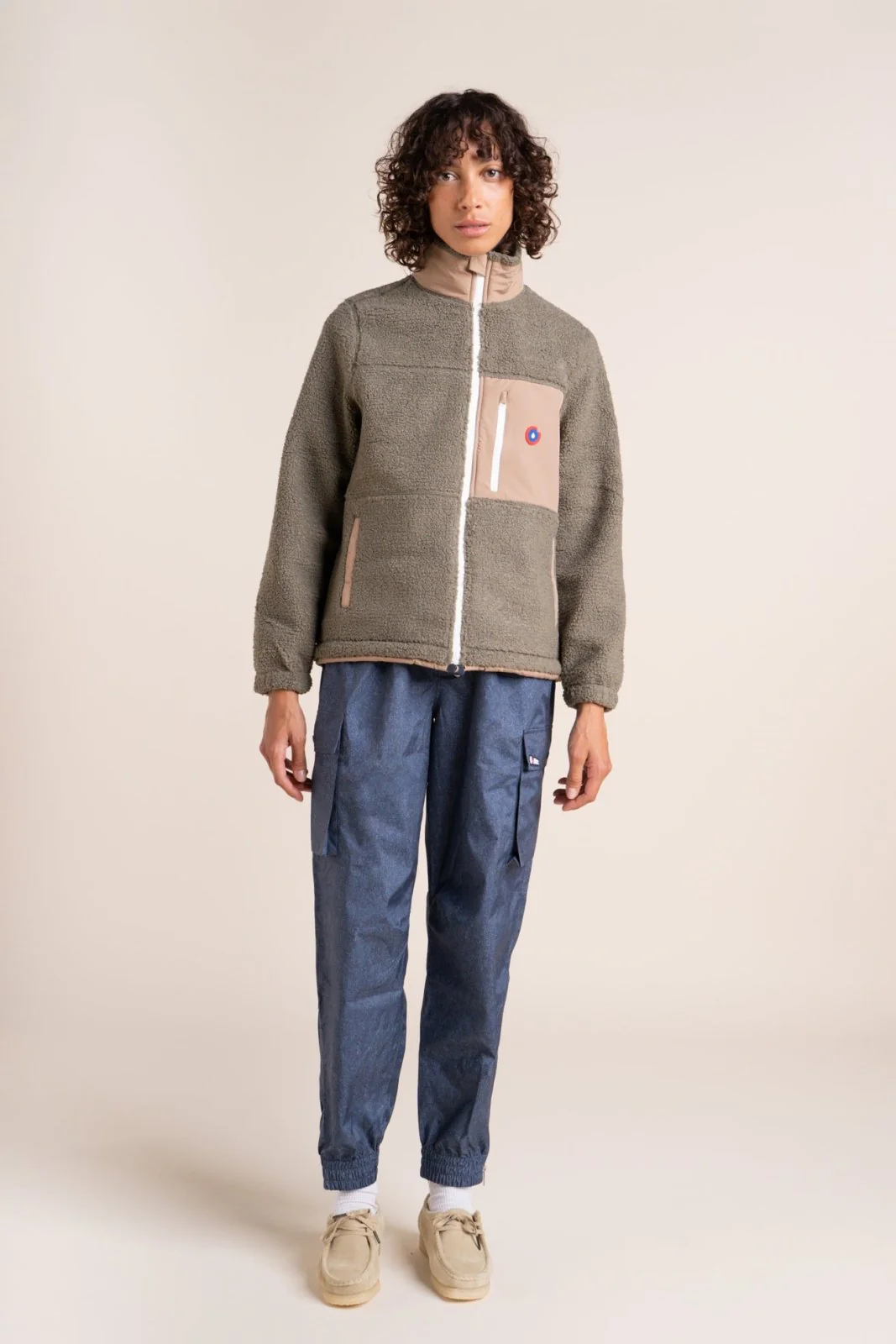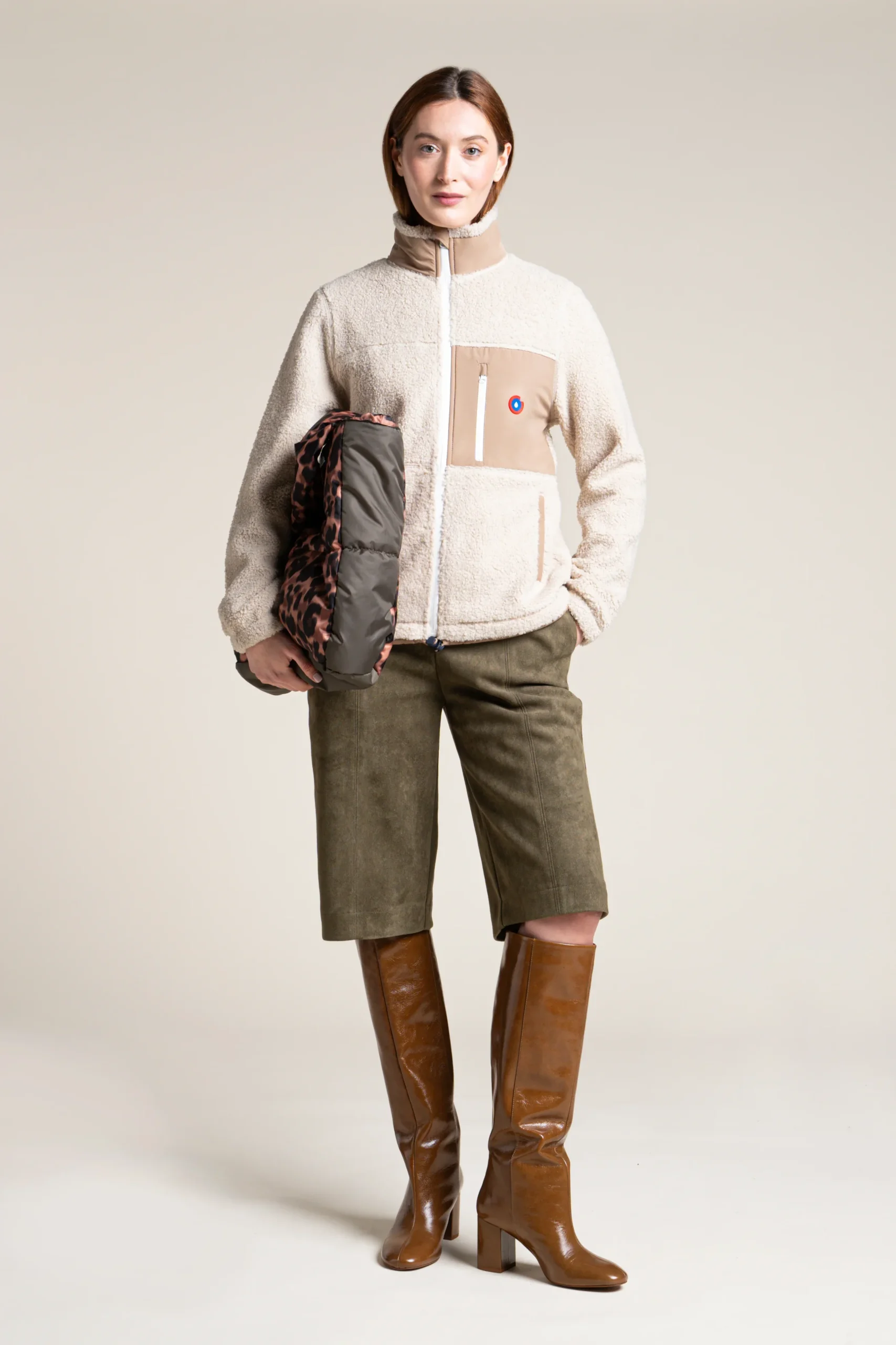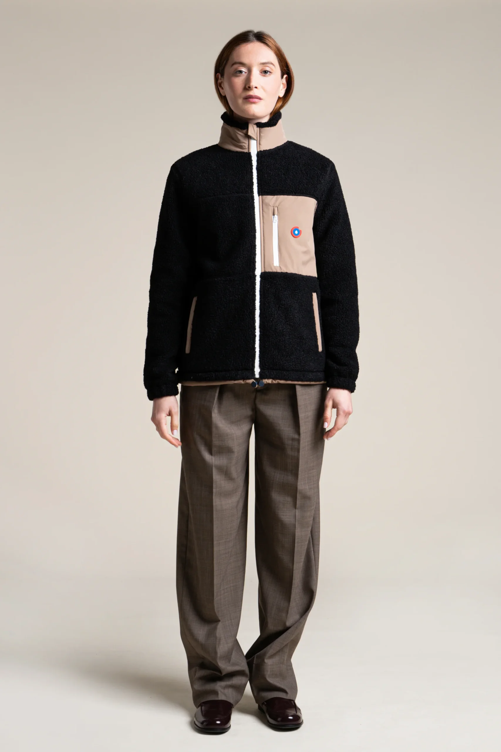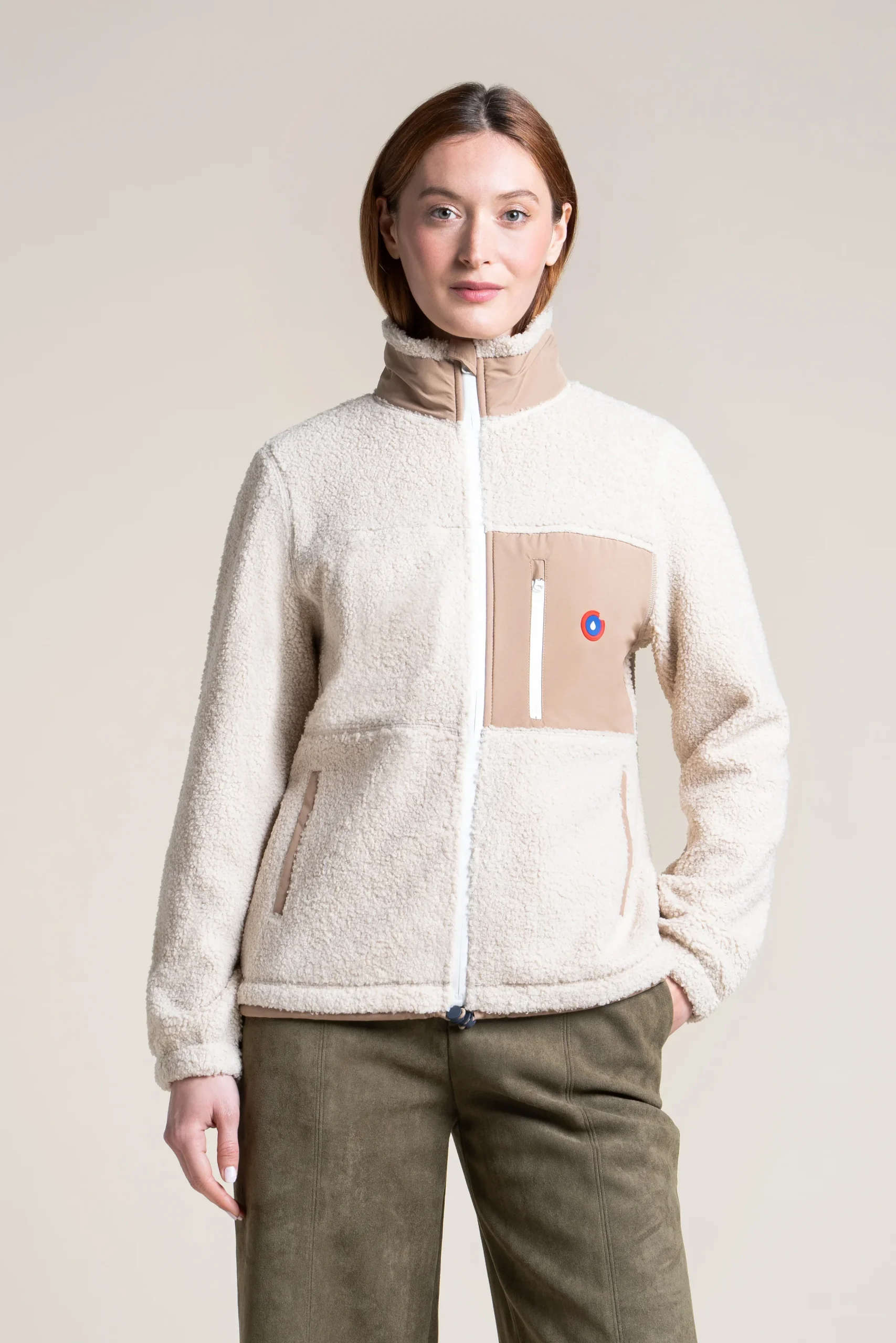 Une veste en polaire recyclé et épais effet sherpa. Ultra-chaude et confortable. Col montant. Trois poches.