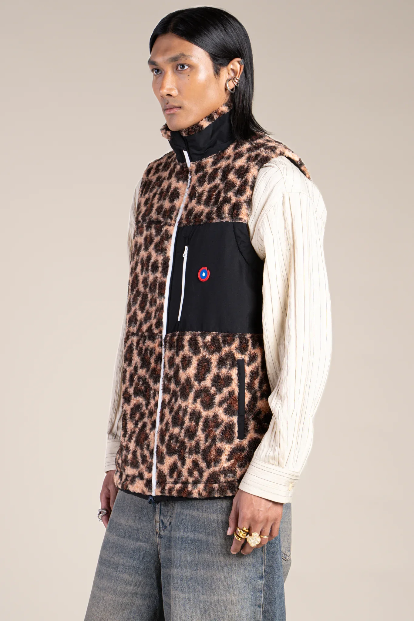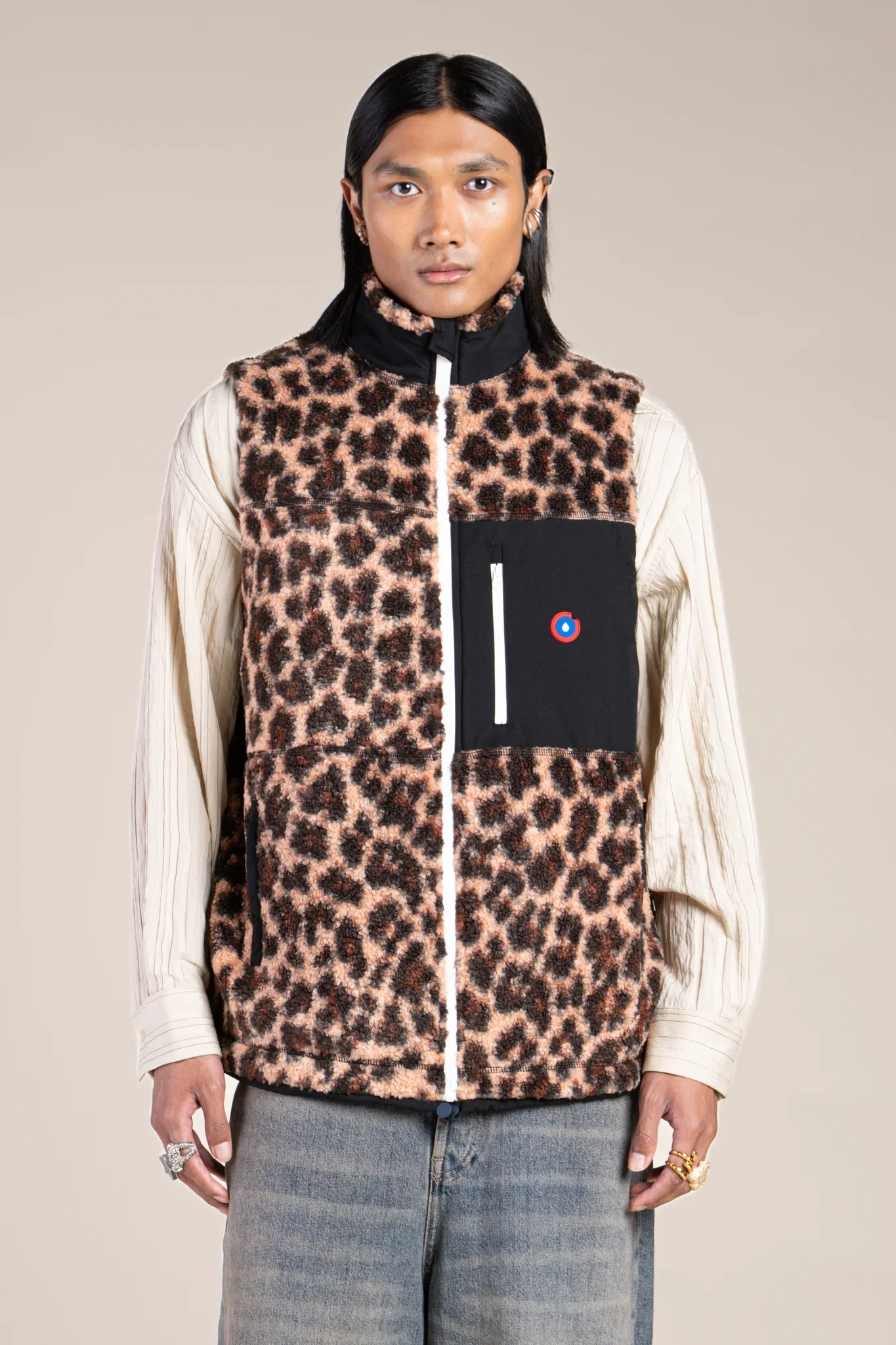 Une veste sans manches en polaire recyclé et épais effet sherpa. Ultra-chaude et confortable. Col montant. Trois poches.