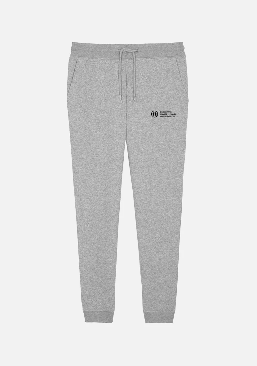 Pantalon de jogging gris chiné en coton bio avec imprimé « THE LABEL » sur le bas de la poche. Restez confortable et élégant grâce à ce pantalon de jogging qui a été conçu pour allier parfaitement style et fonctionnalité