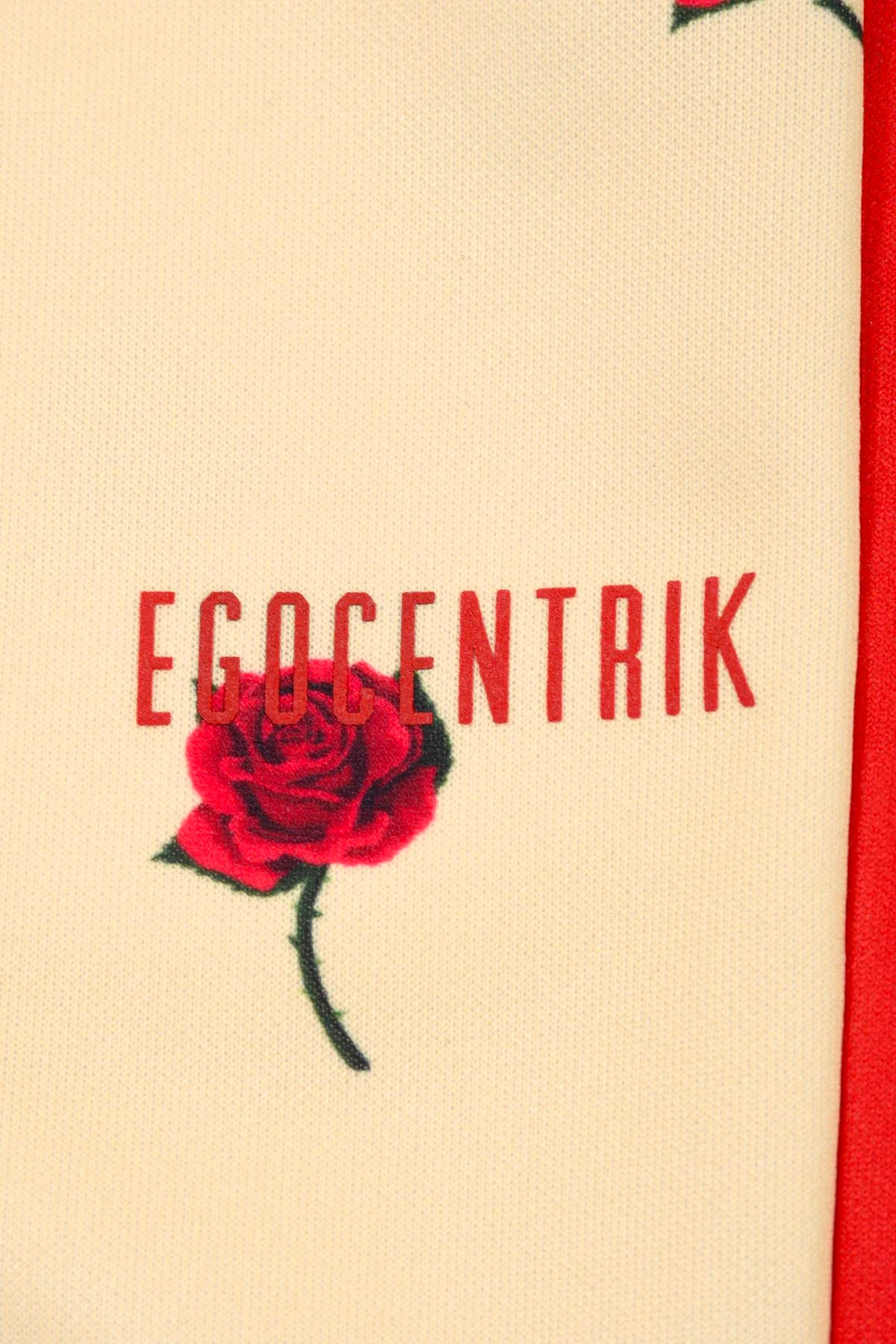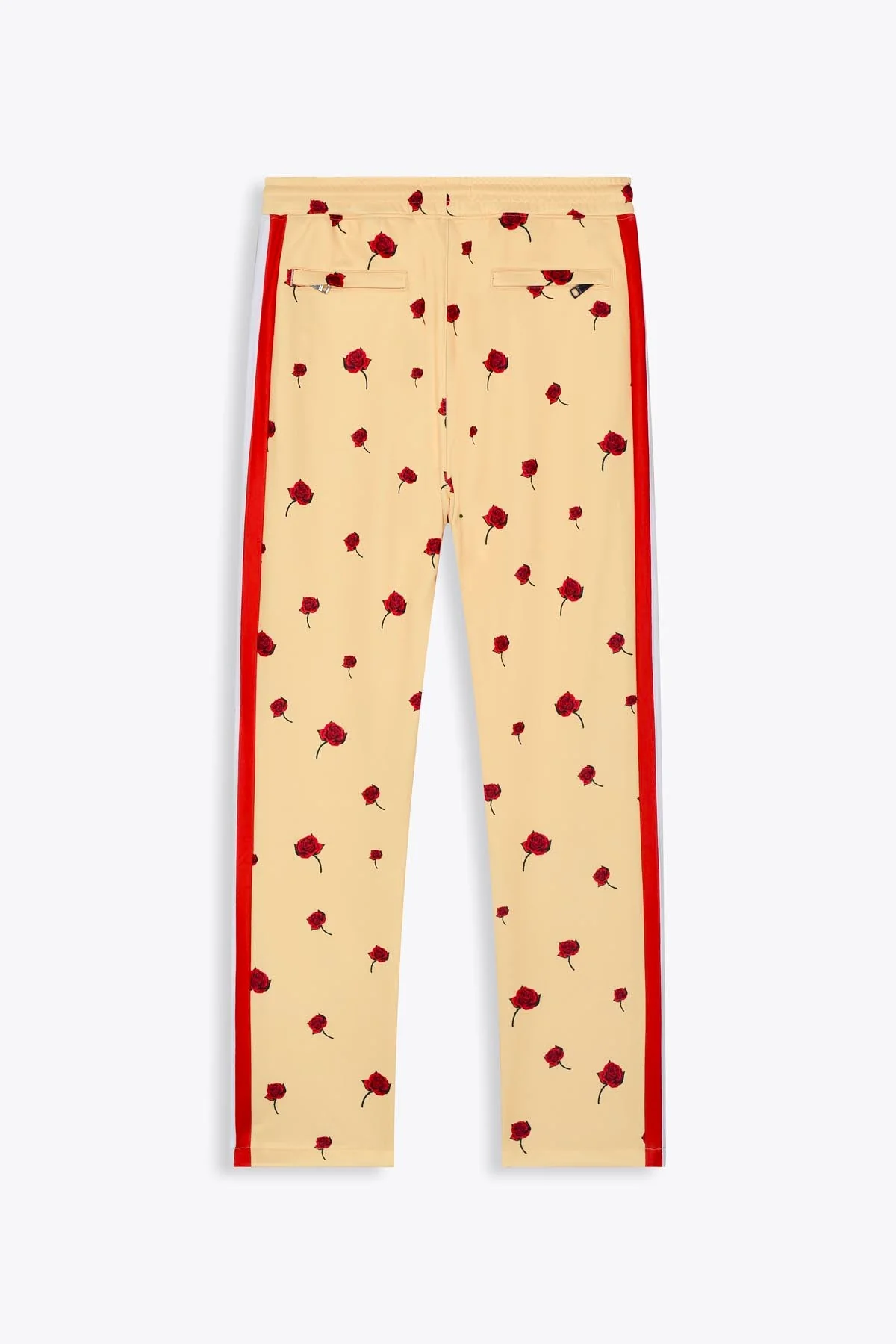 Un élégant pantalon à porter pour le sport ou pour la ville, en Nylon poly technique jaune clair. Il présente une coupe droite à plis cousus et sur le devant 2 poches latérales zippées et une taille élastiquée. Des roses rouges brodées viennent compléter le look et lui donner du caractère tandis qu’il est contrasté de rayures blanches et rouges le long des jambes et répondant au logo signature.