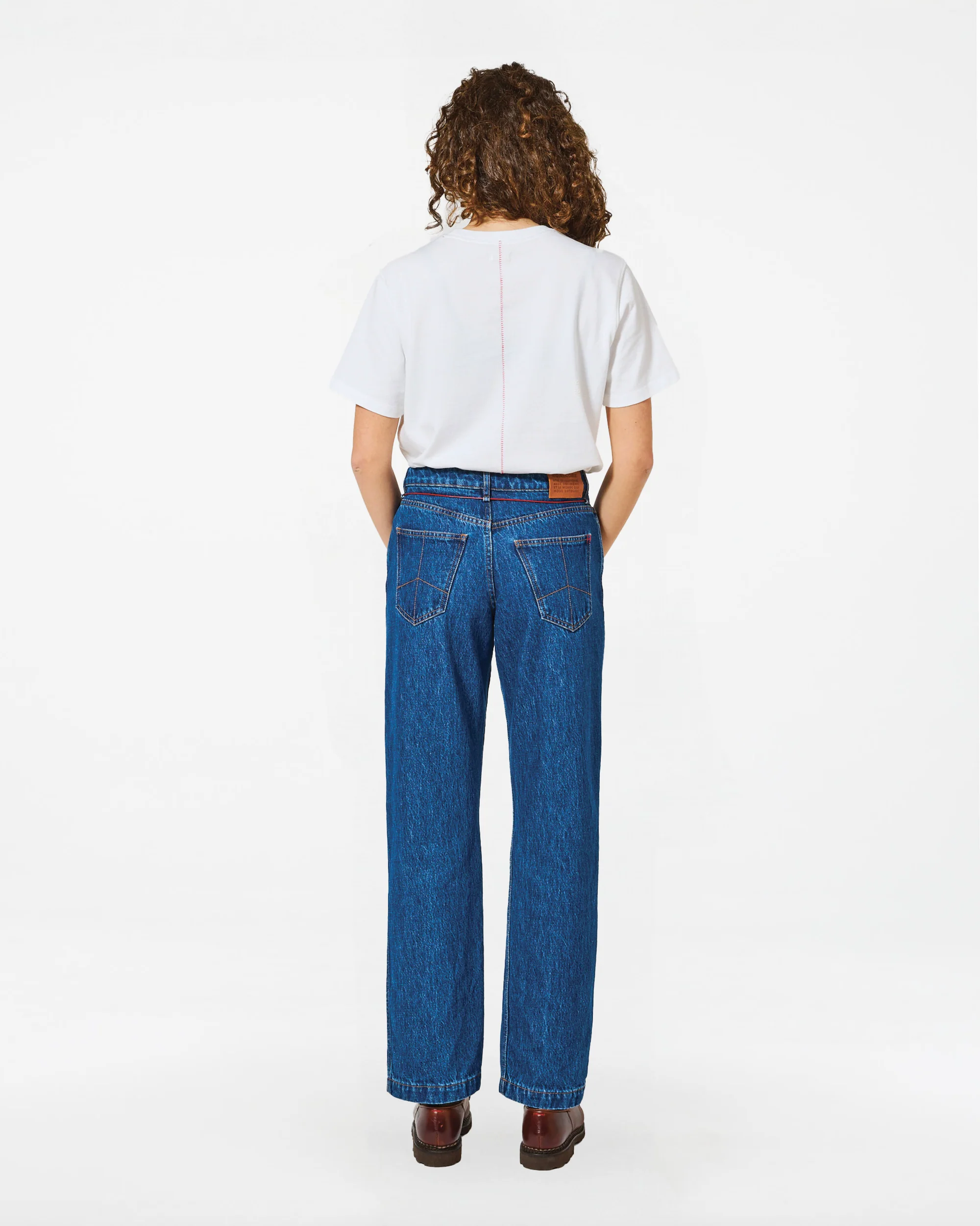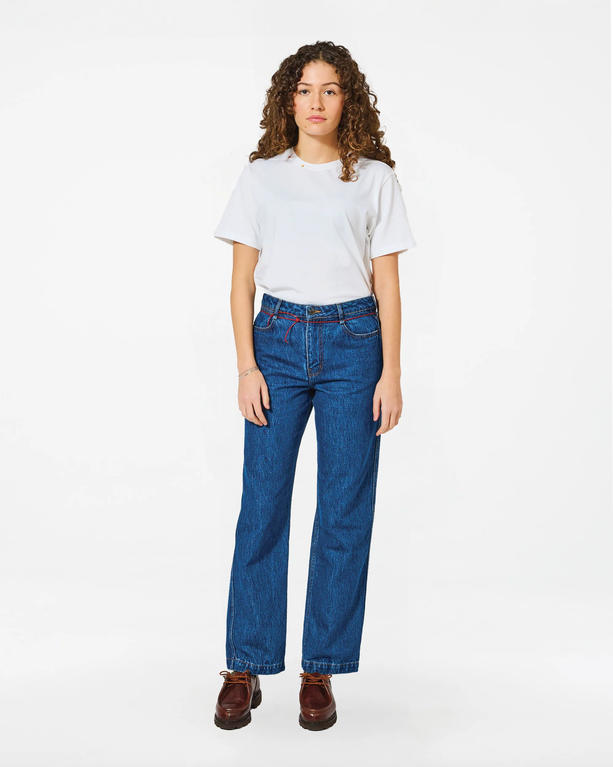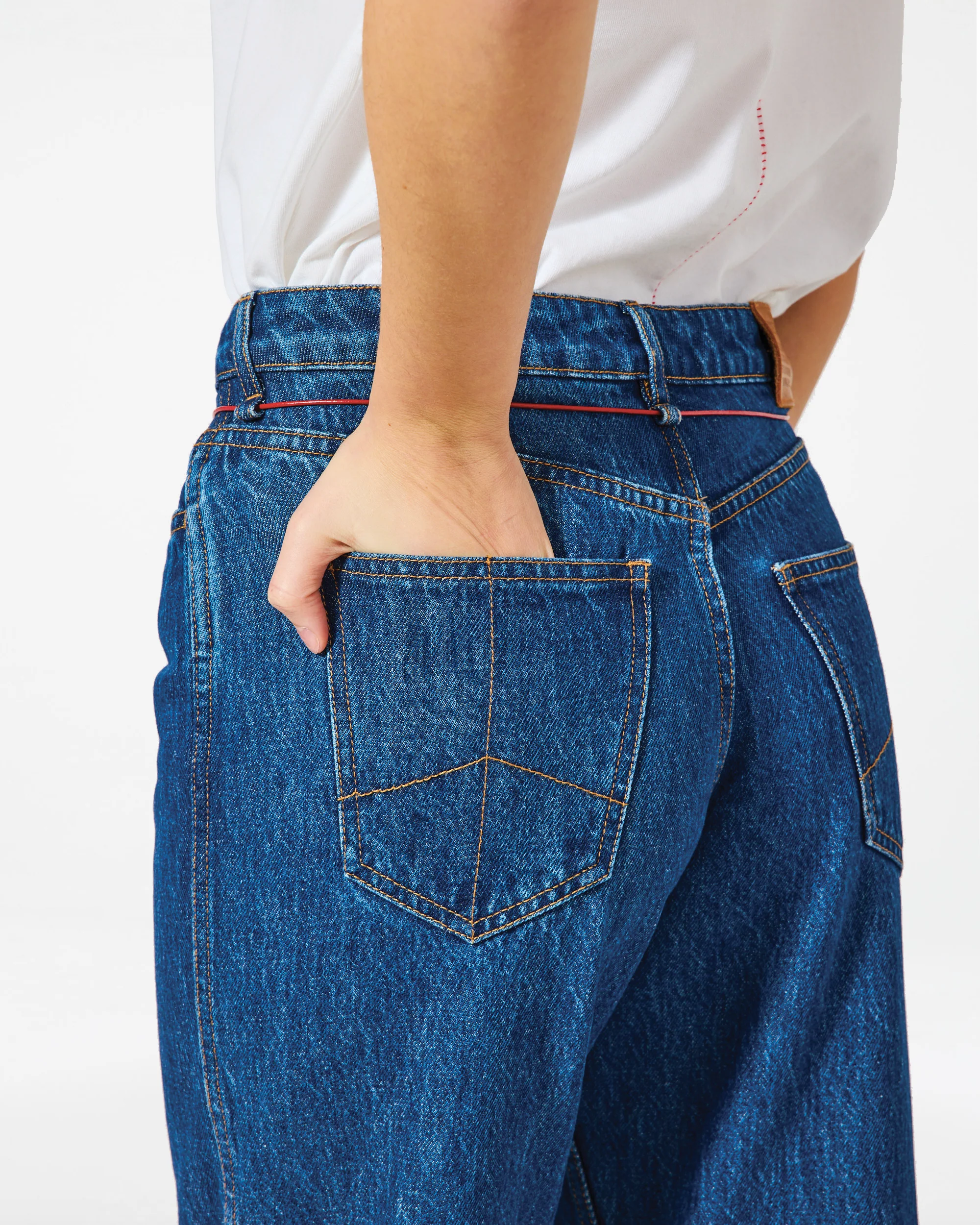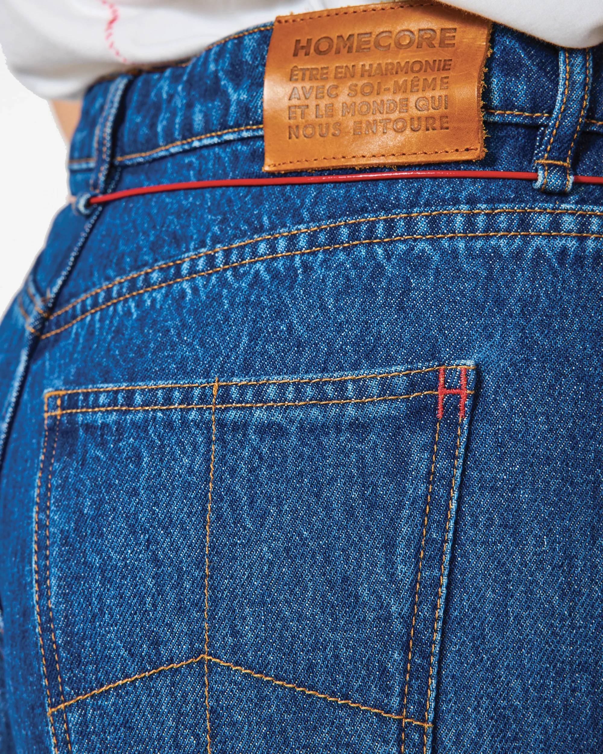 Pantalon denim avec détails de poches utilitaires, broderies décoratives et cordon rouge en cuir végétal au centre de gravité. Confort technique et style ancré.