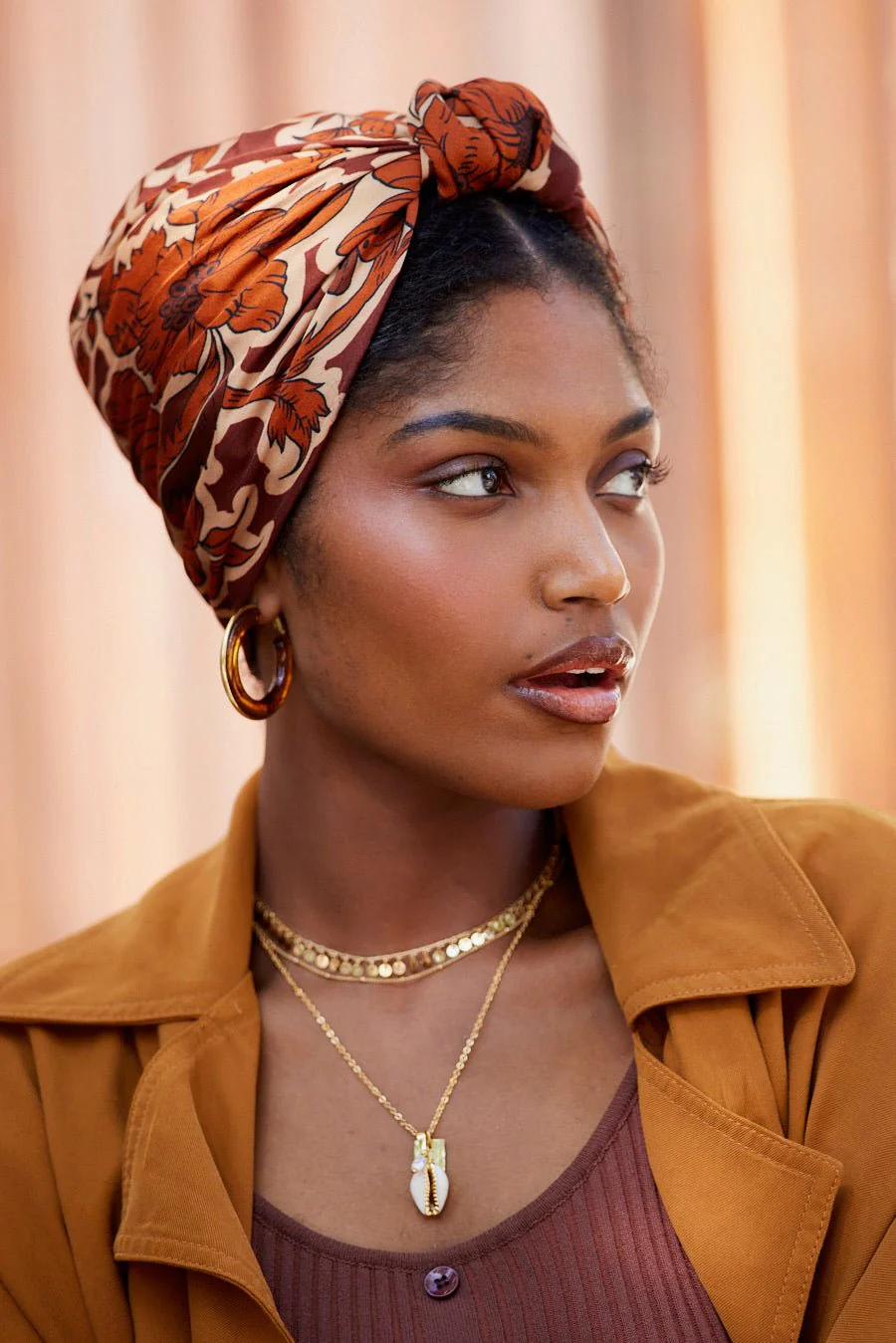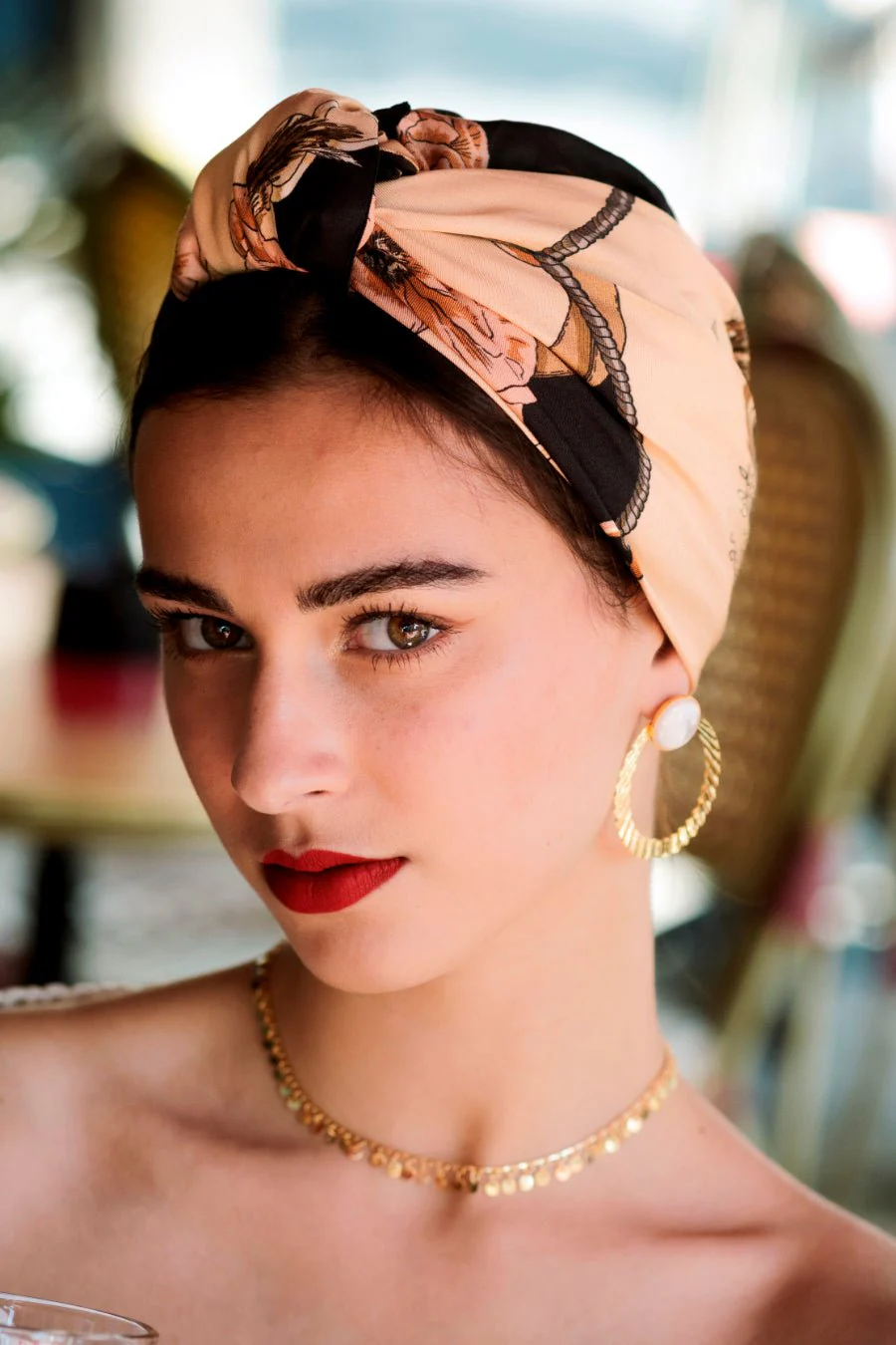 Des fleurs éclatantes sur fond rose : un turban audacieux et romantique à la fois. Il se marie aussi bien à une robe rouge qu’à un look denim.