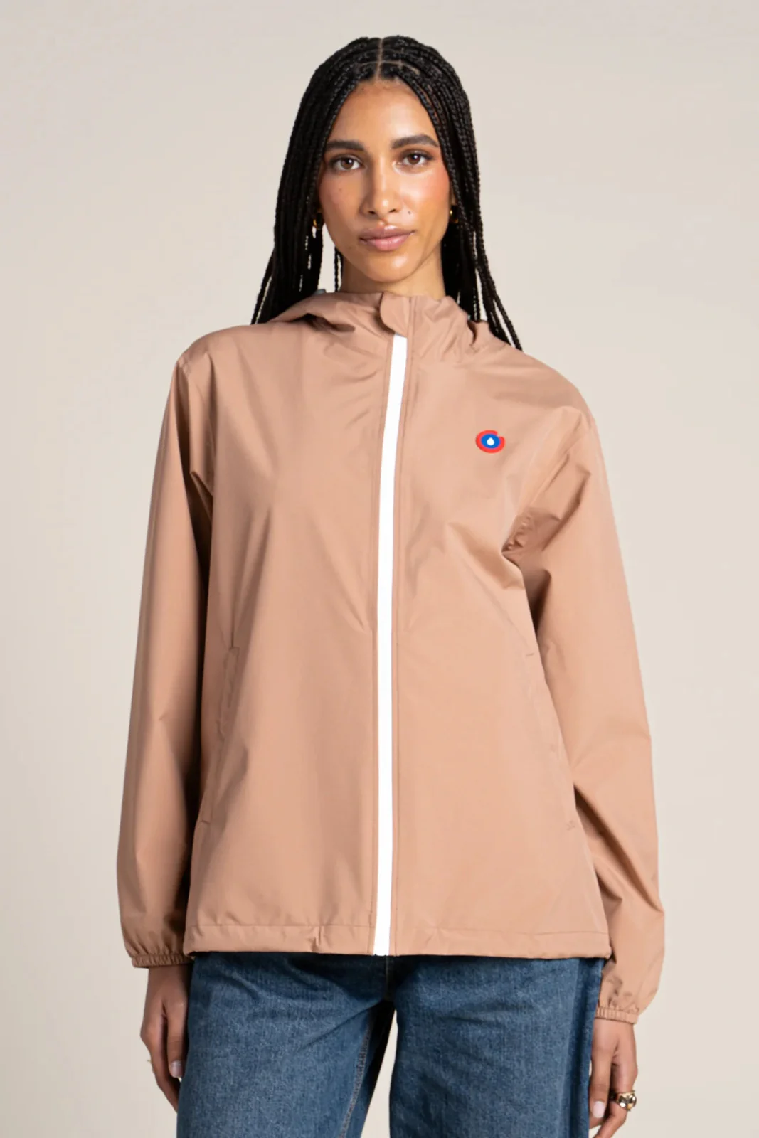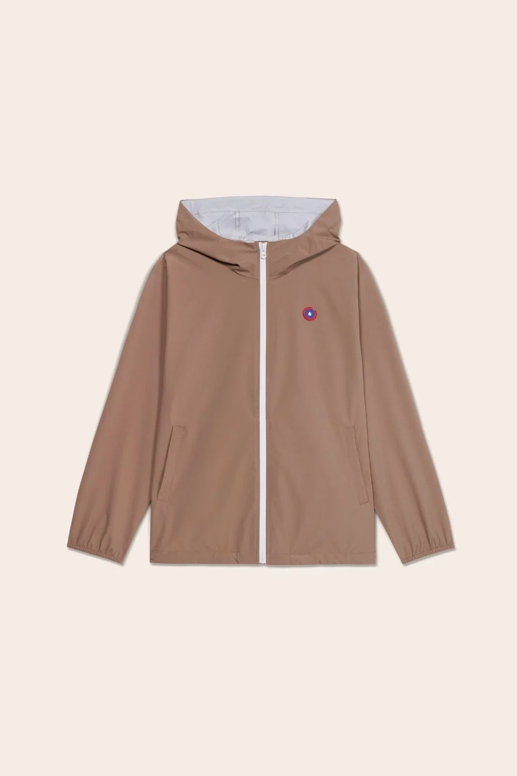 Un imperméable et coupe-vent court. Tissu en polyester recyclé, respirant et léger. Veste pratique, modulable en sac.