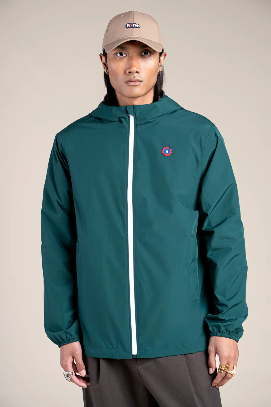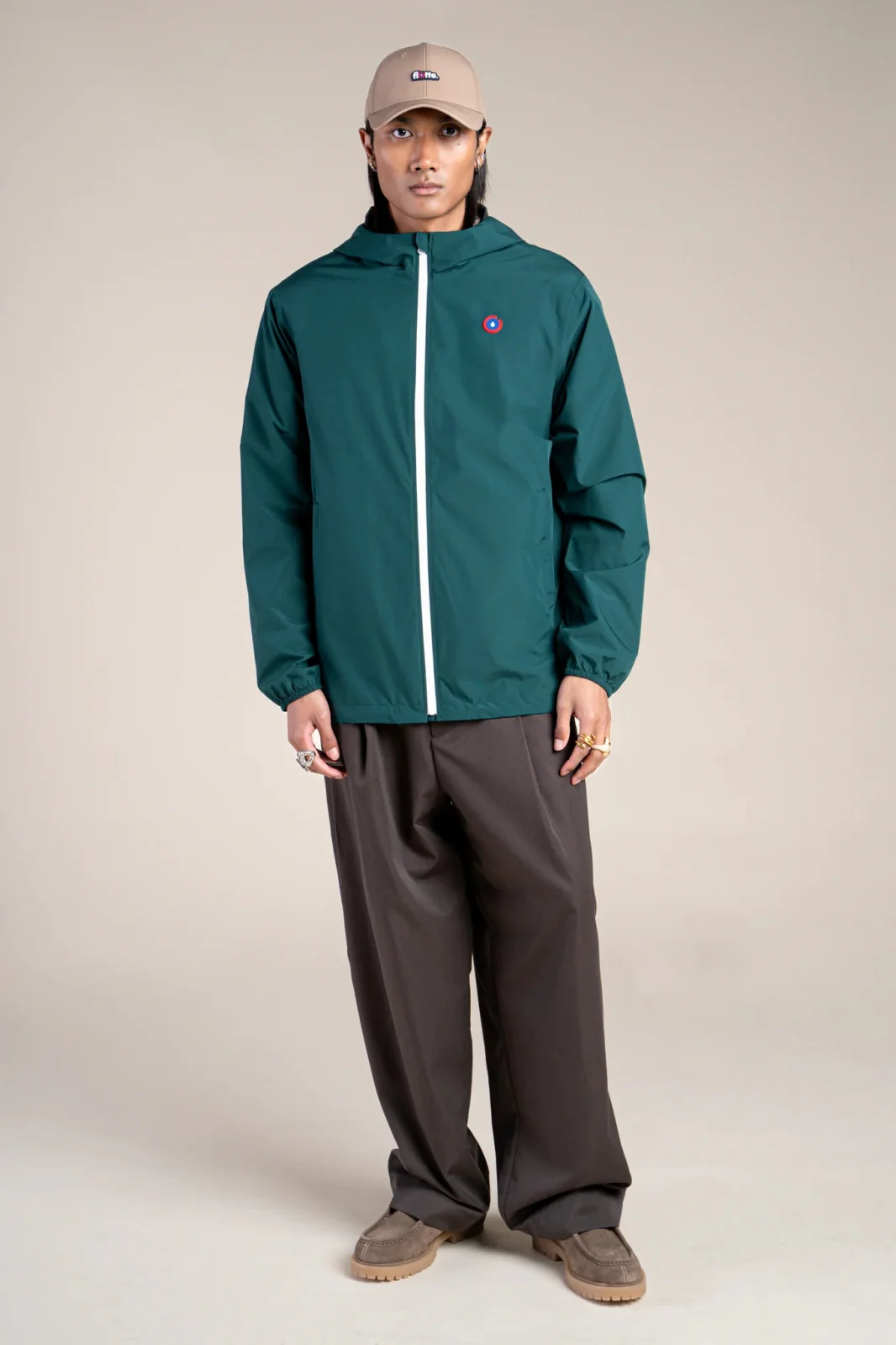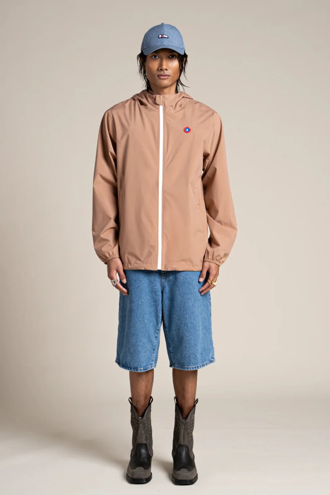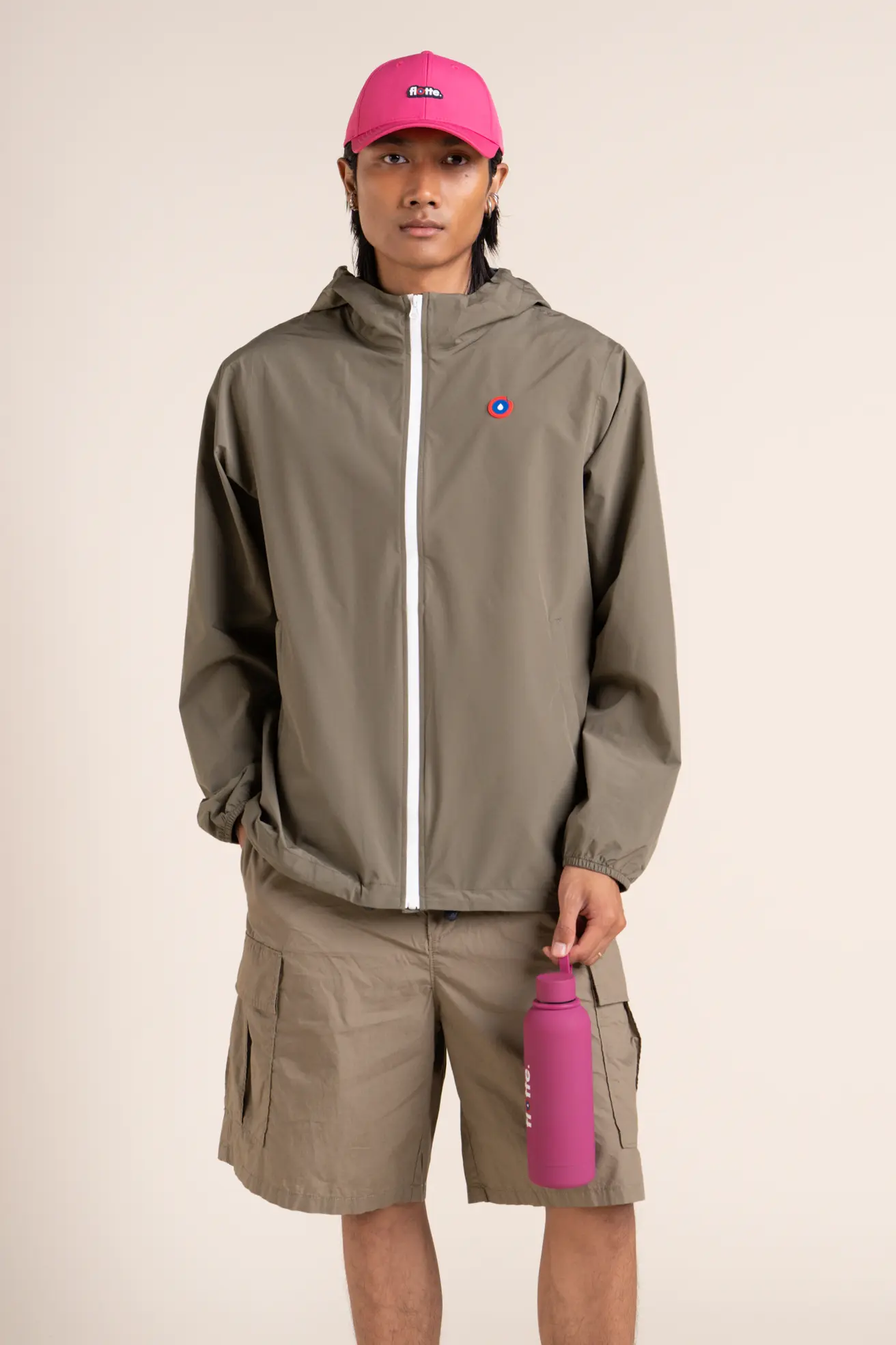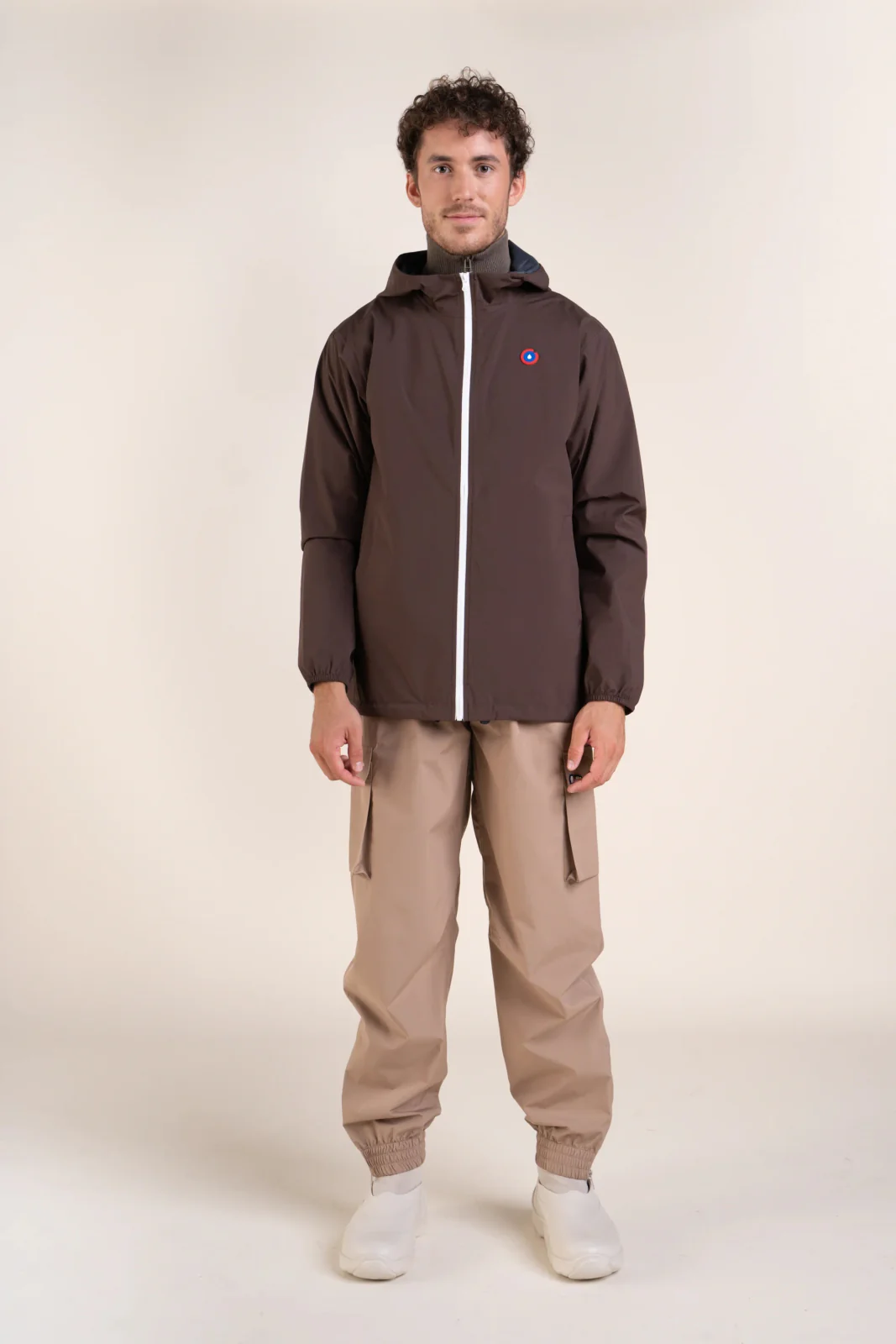 Un imperméable et coupe-vent court. Tissu en polyester recyclé, respirant et léger. Veste pratique, modulable en sac.