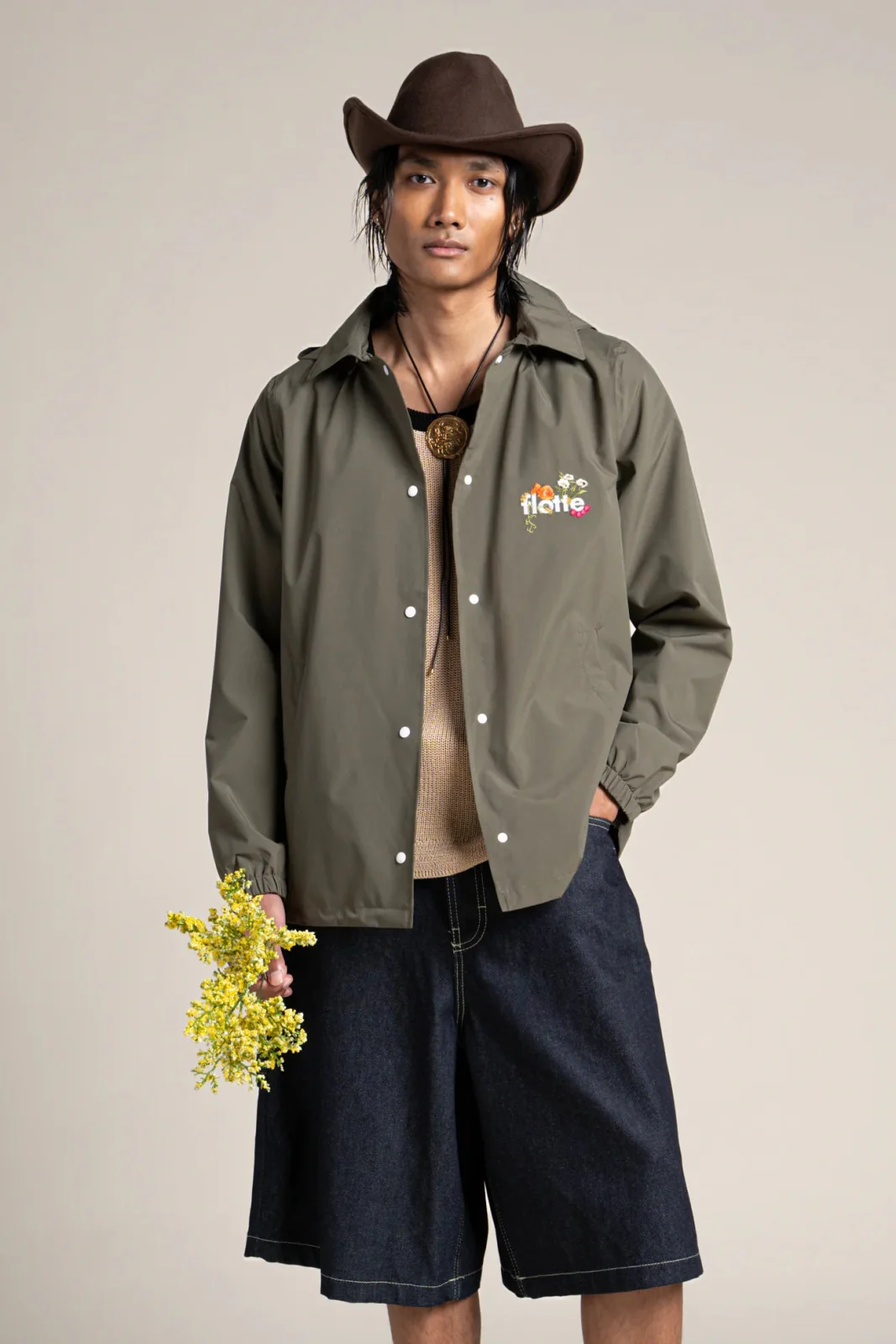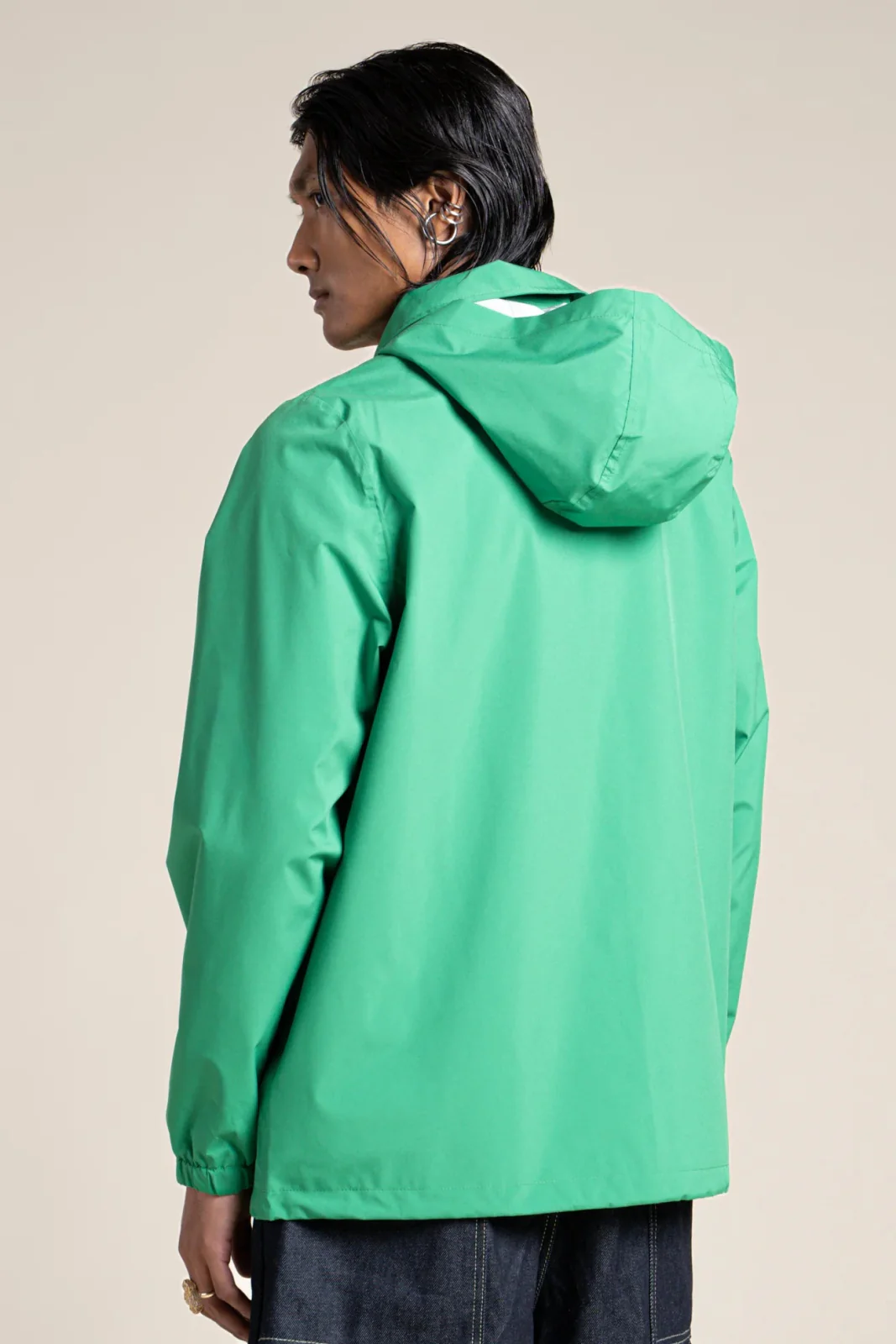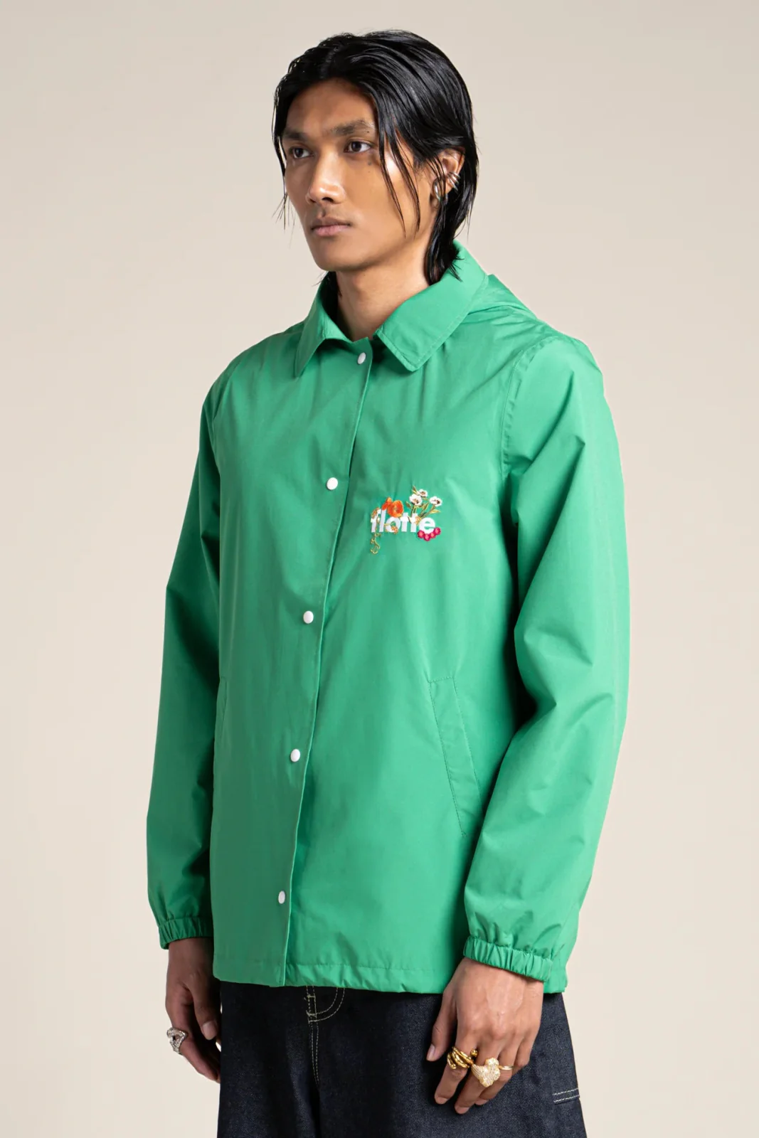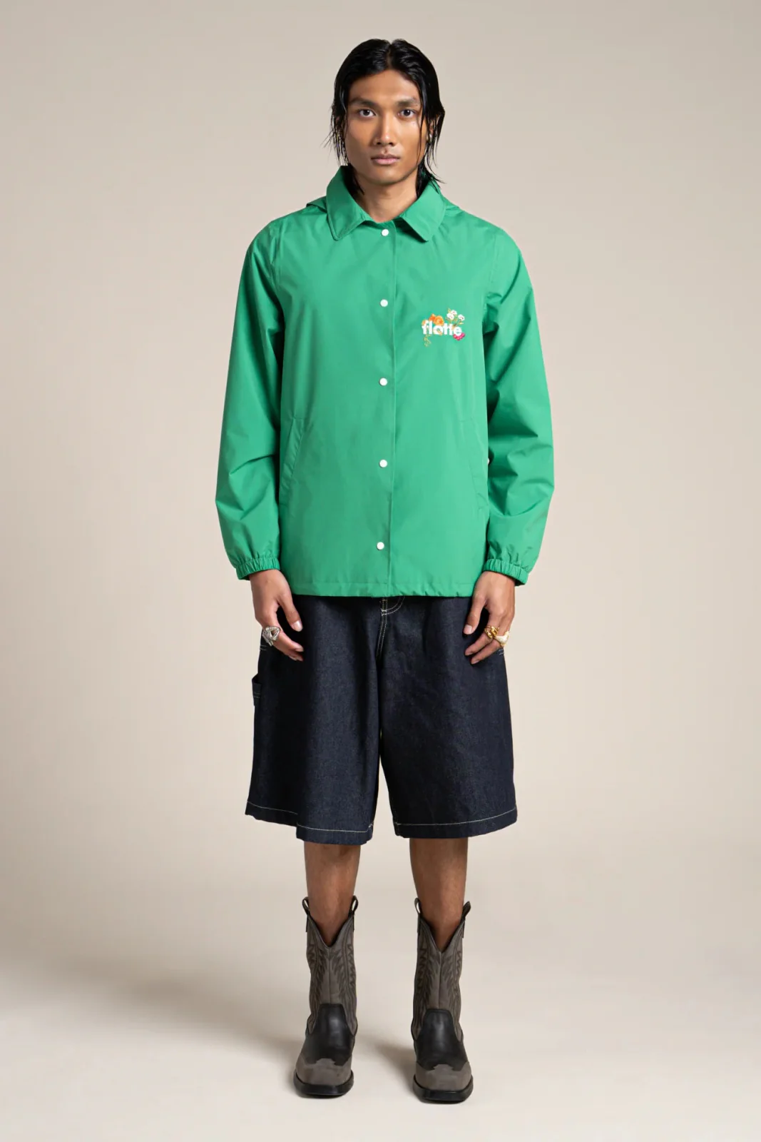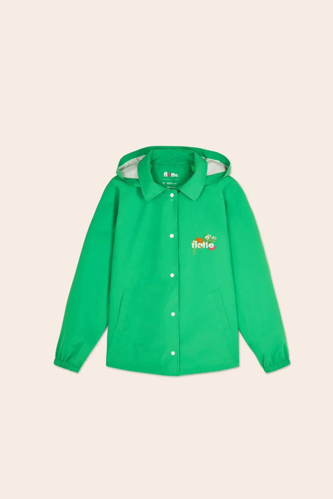 Veste courte inspirée du bleu de travail, ornée d’un patch brodé floral. Imperméable et coupe-vent. Tissu en polyester recyclé, respirant et léger. Capuche amovible.