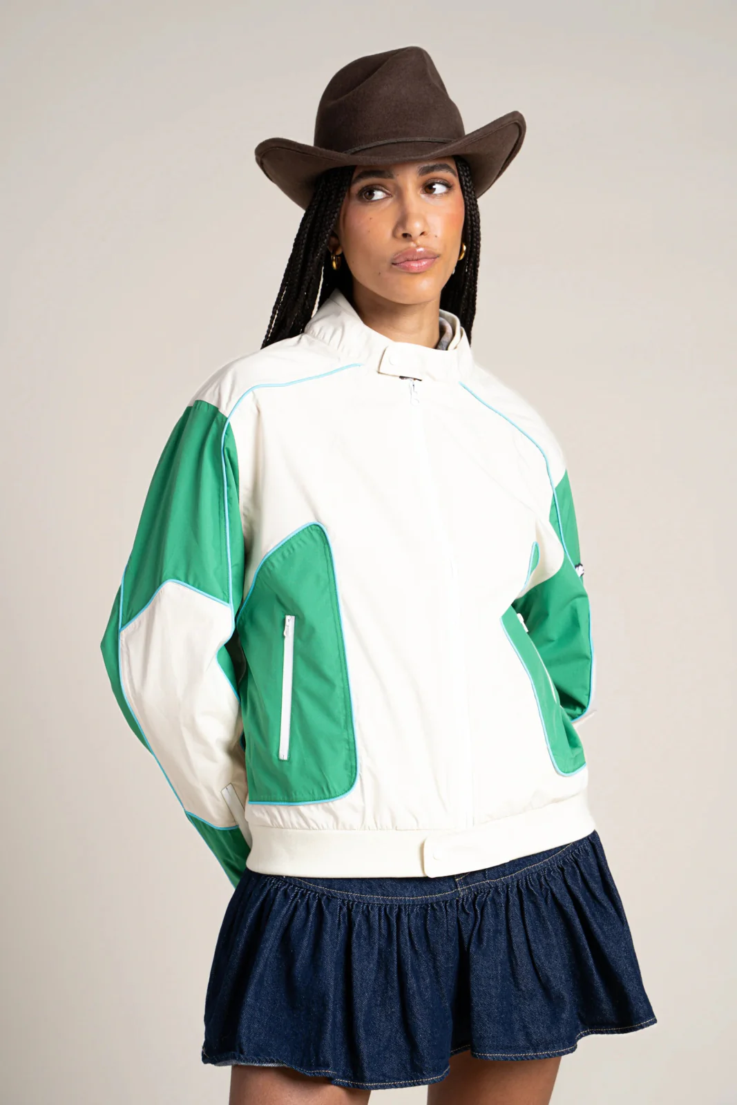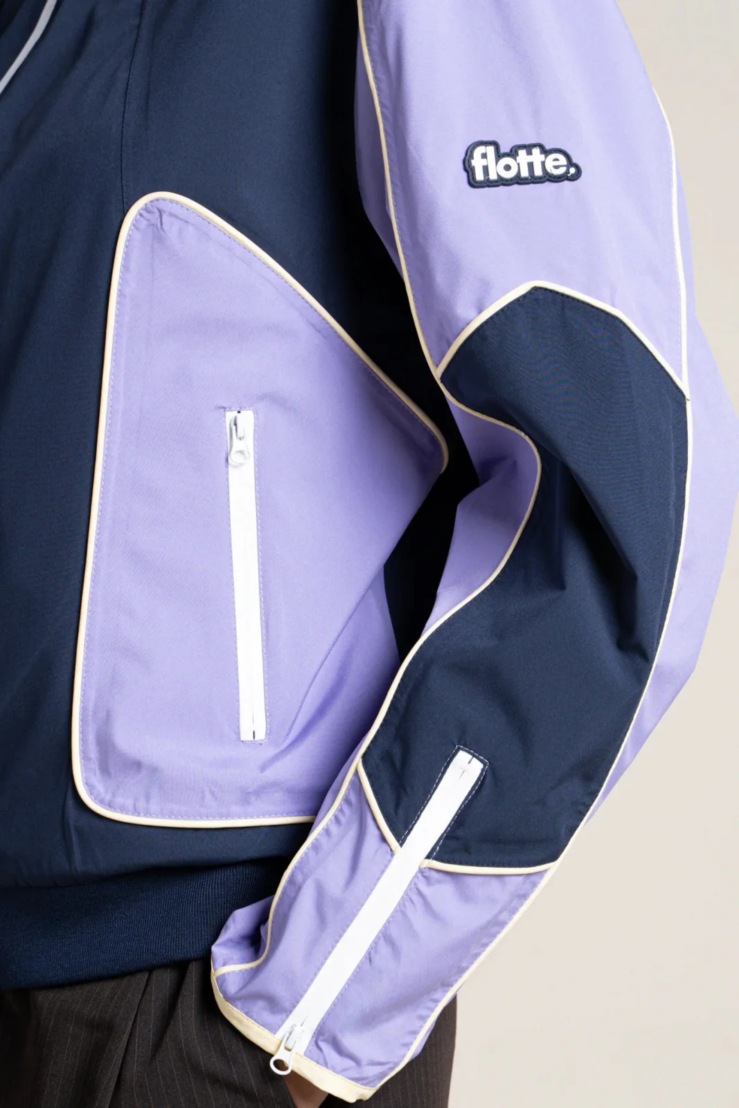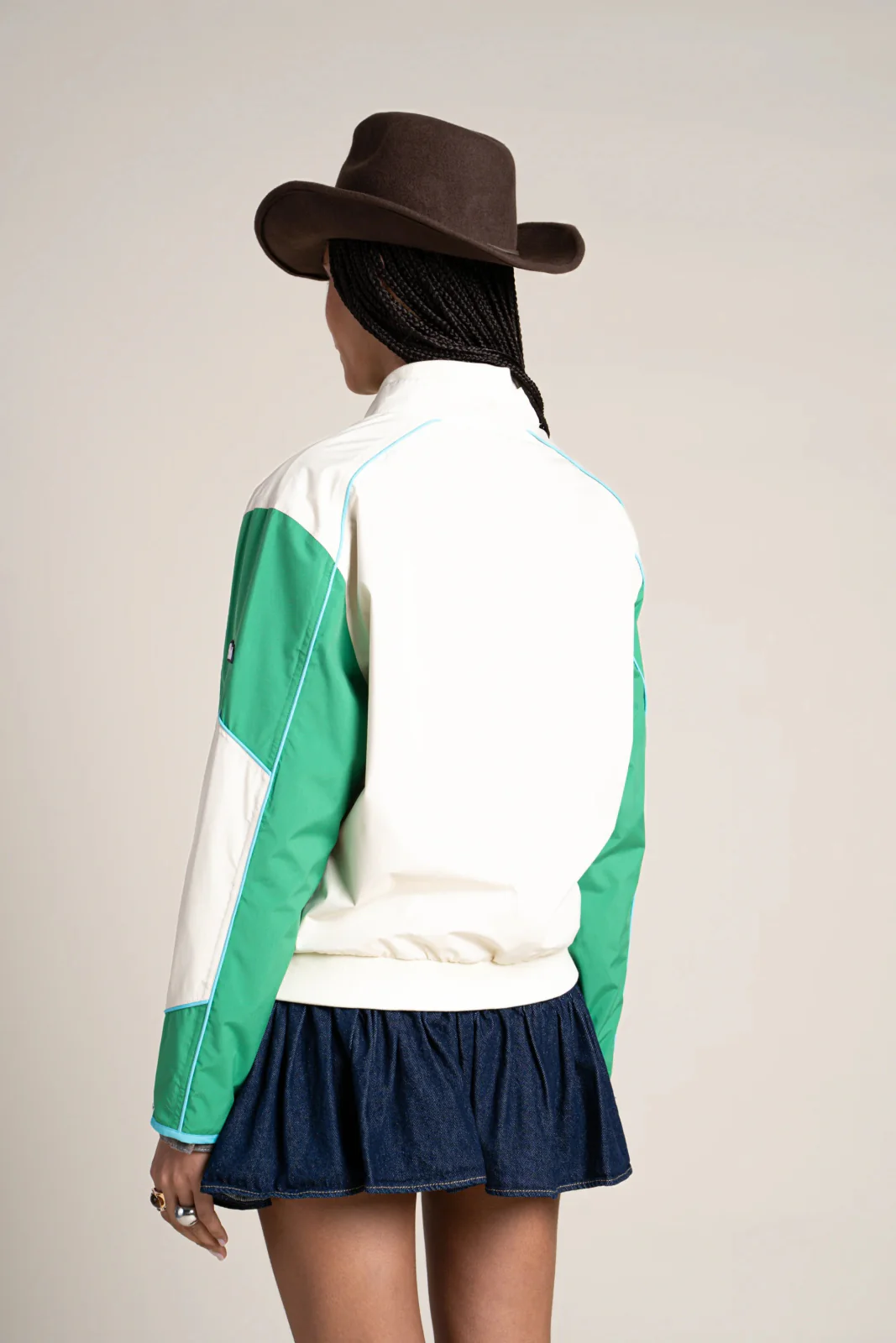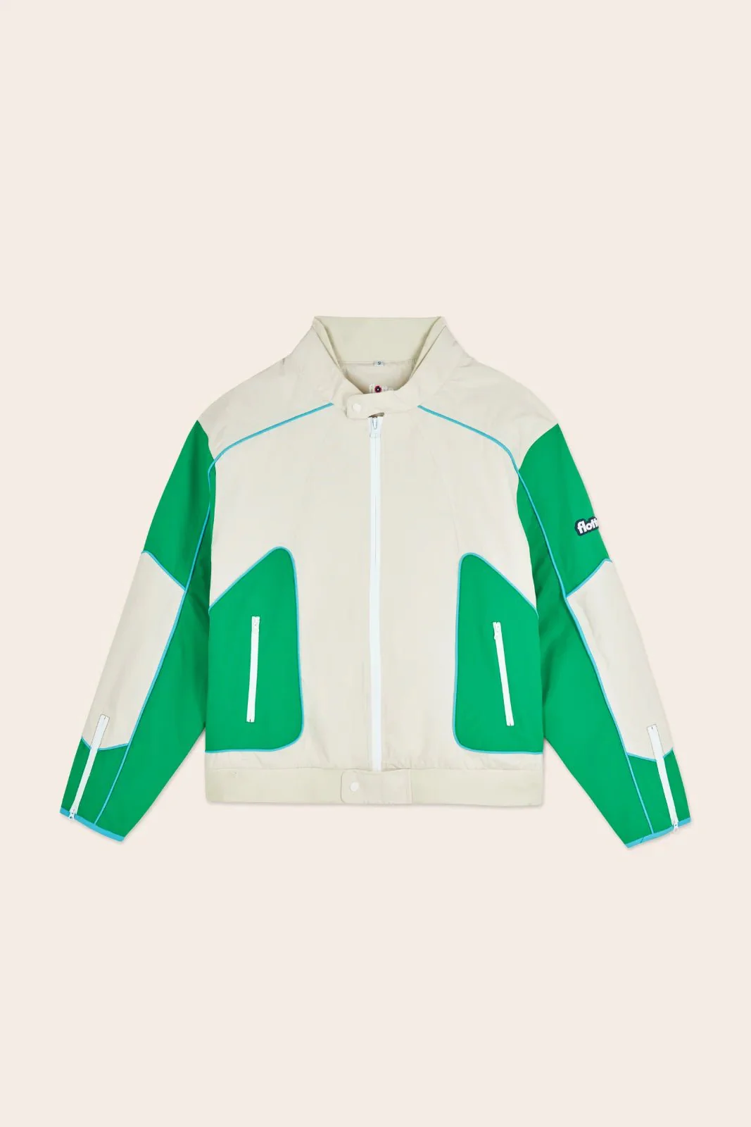 Veste courte tricolore, esprit biker. Imperméable et coupe-vent. Tissu en polyester recyclé, respirant et léger.
