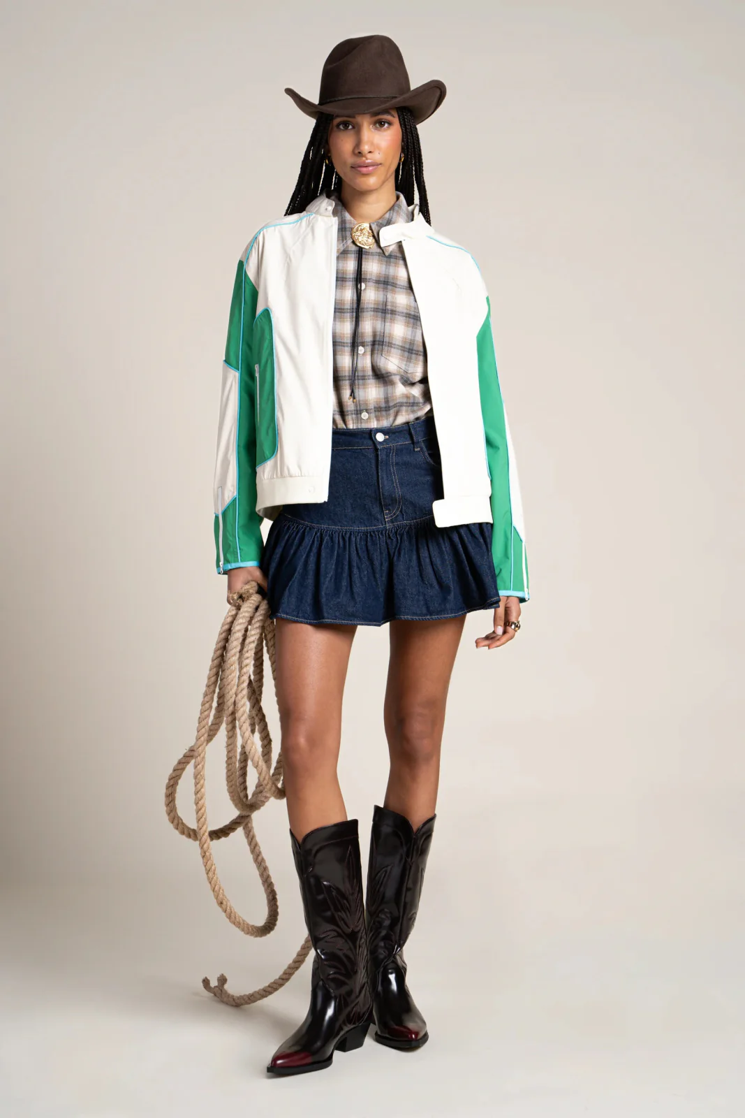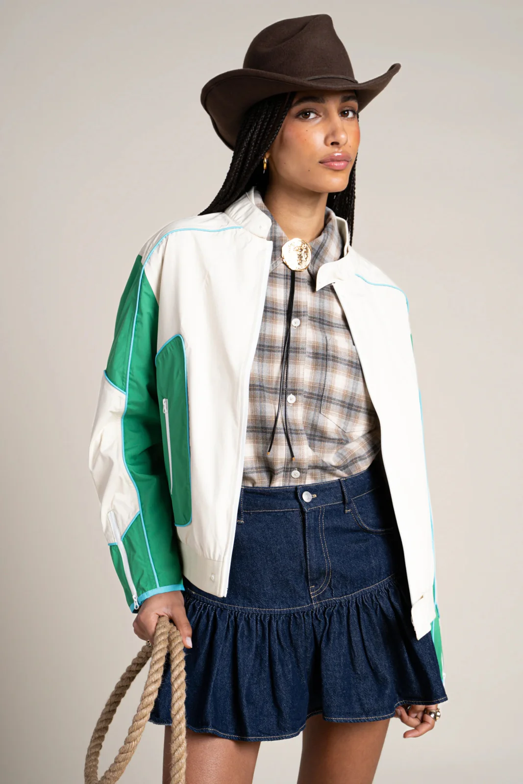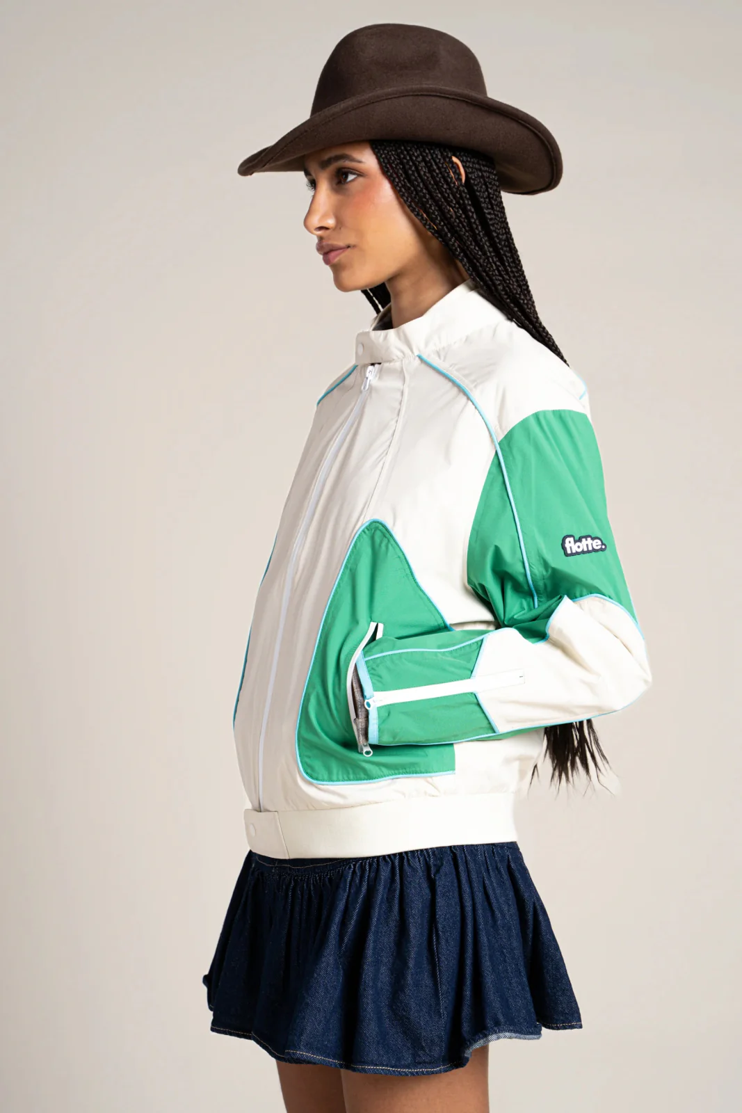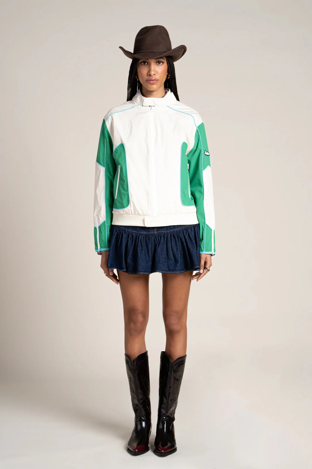 Veste courte tricolore, esprit biker. Imperméable et coupe-vent. Tissu en polyester recyclé, respirant et léger.