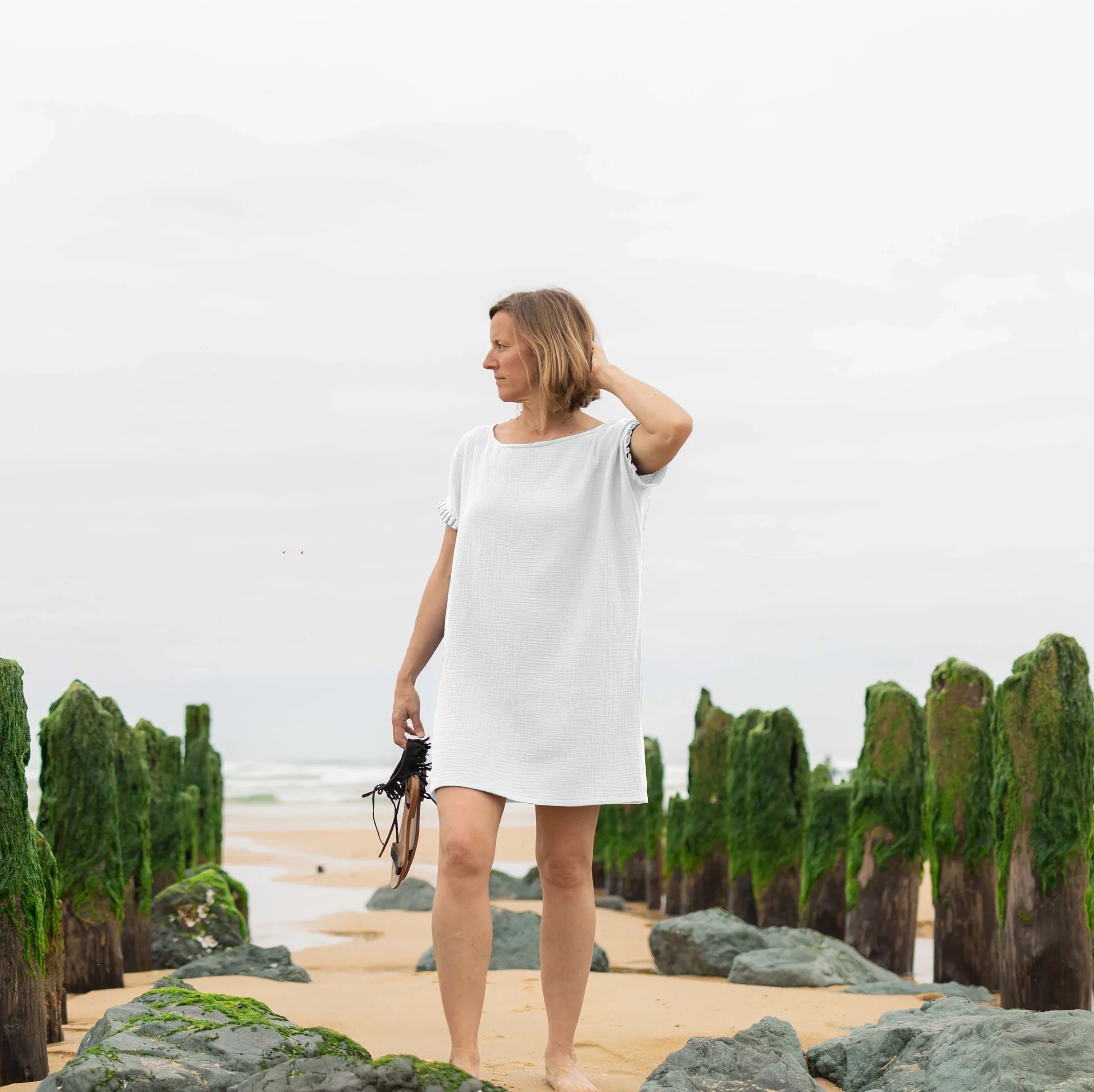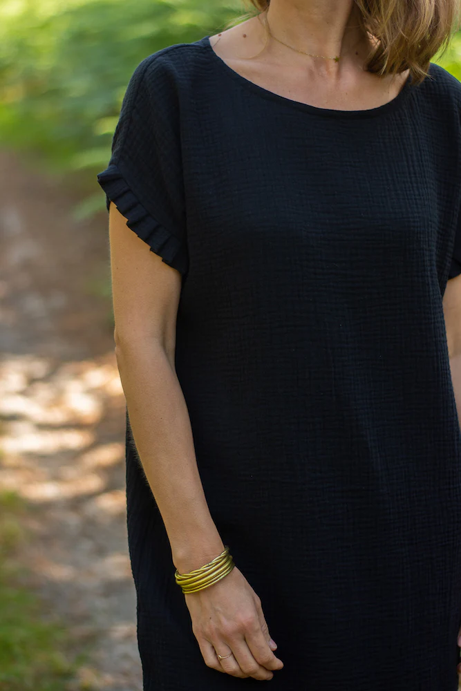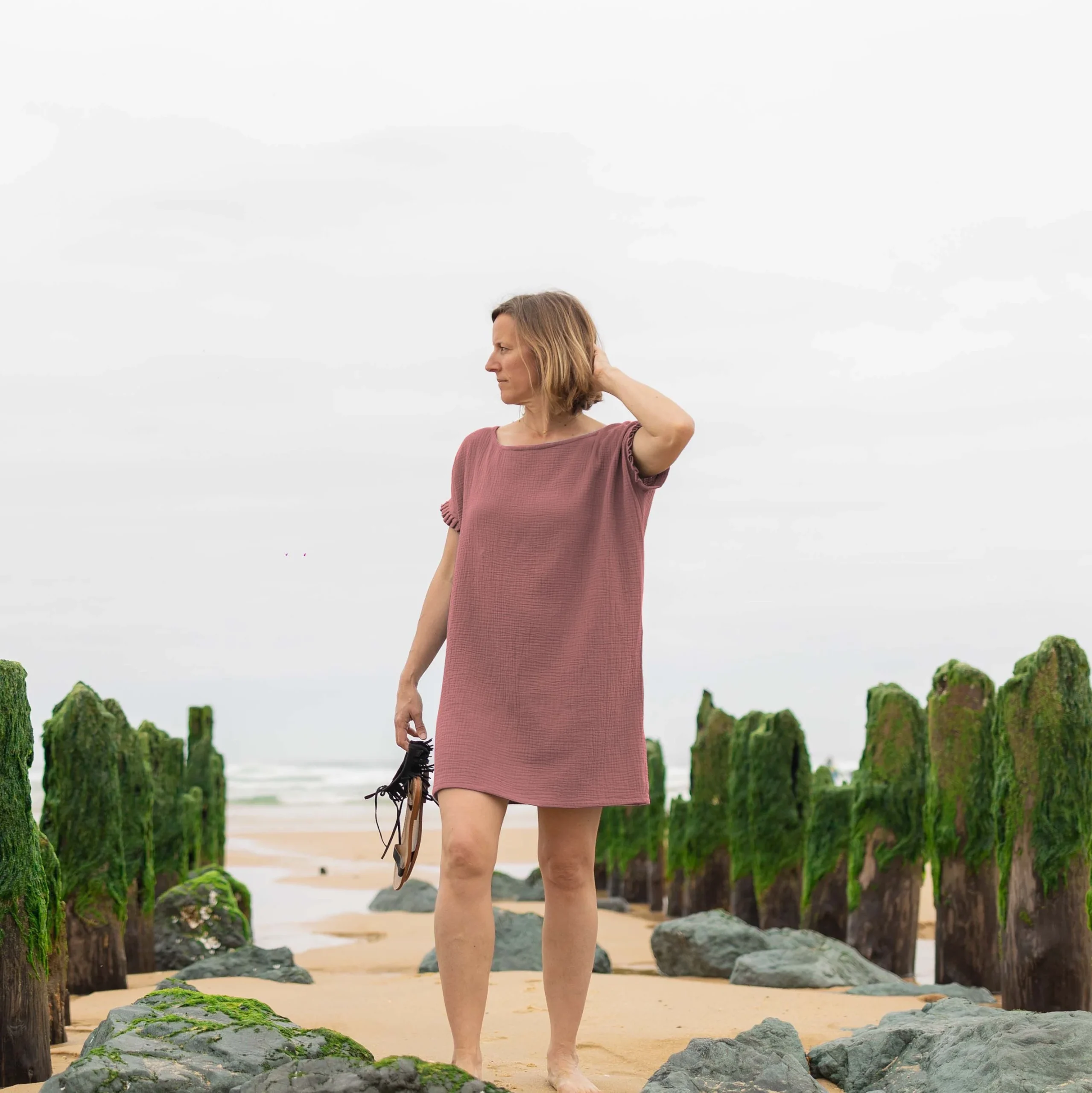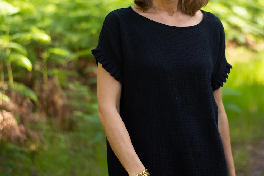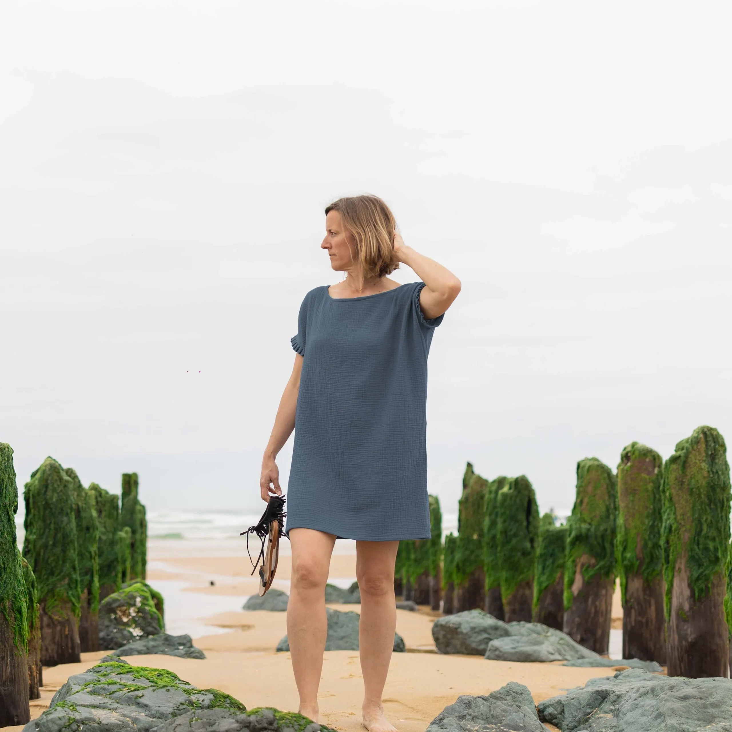 – Tissu au choix (confectionnée ici dans une double gaze bleu gris 100% coton).