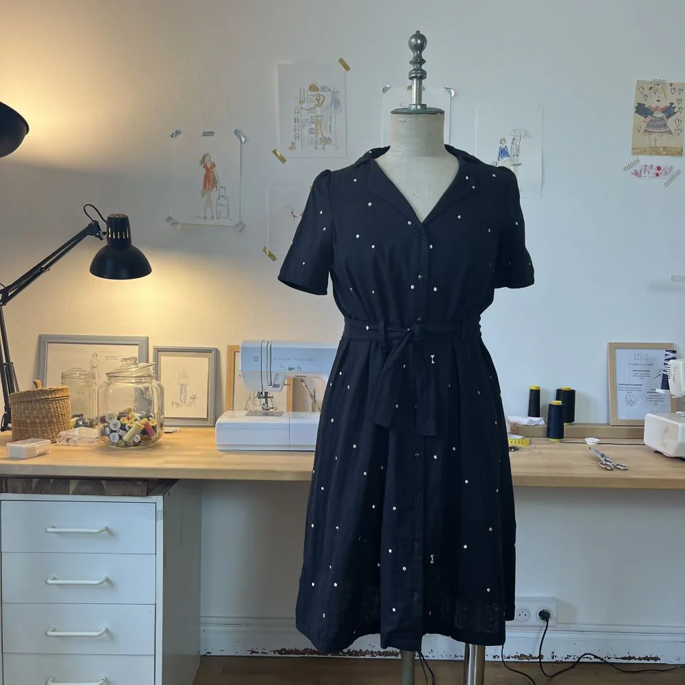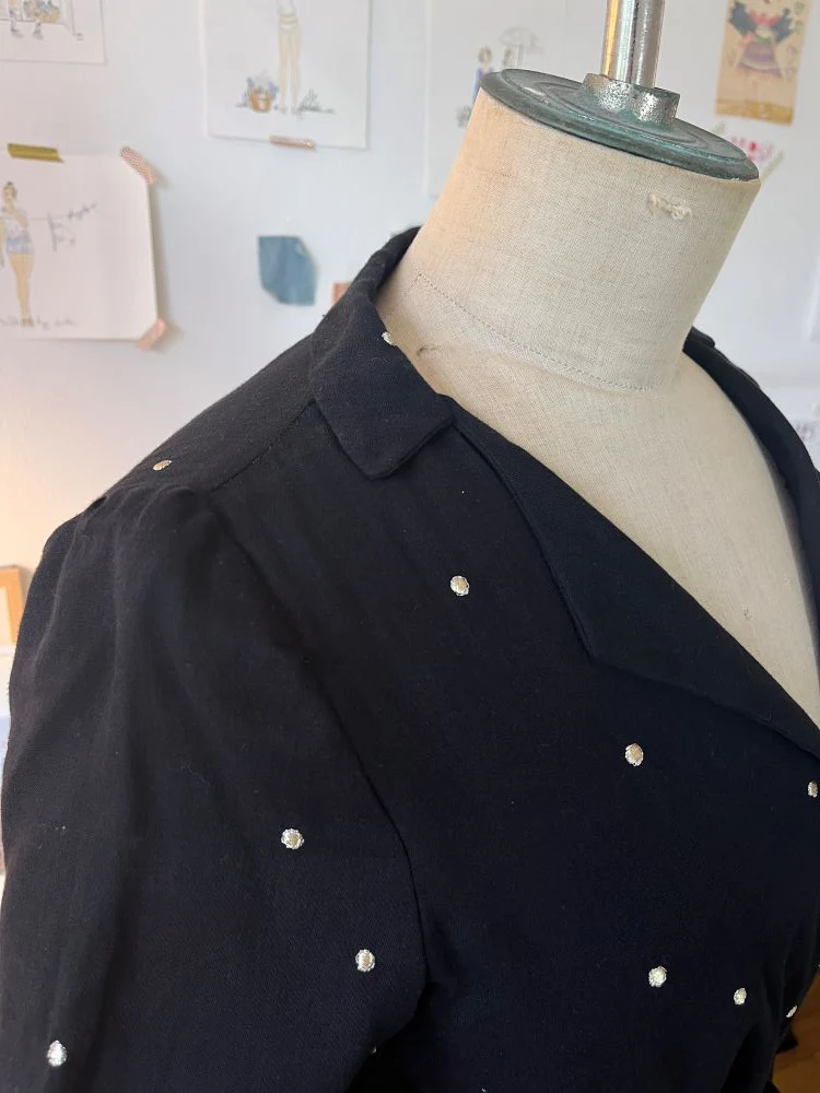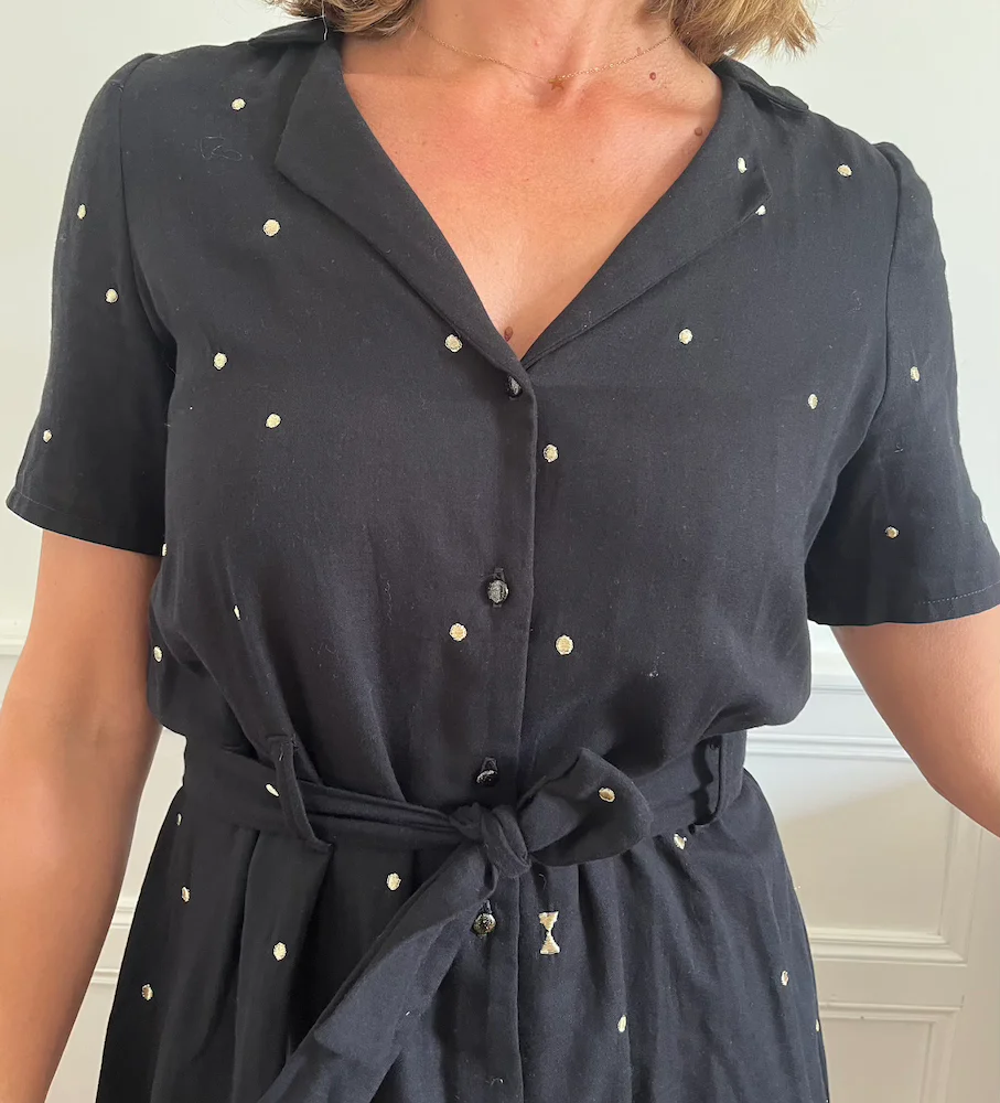 – Confectionnée en double gaze de coton noire à pois dorés.