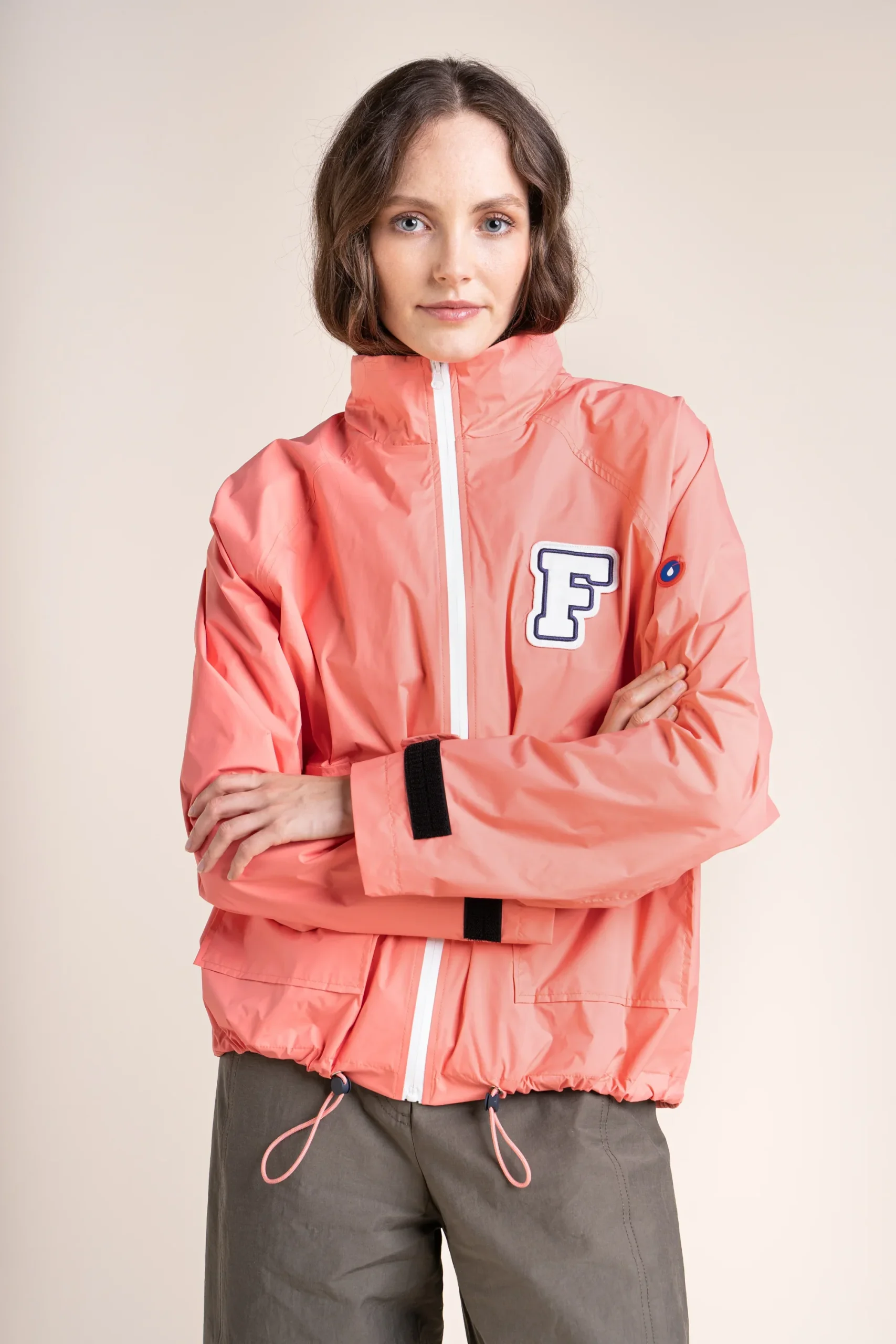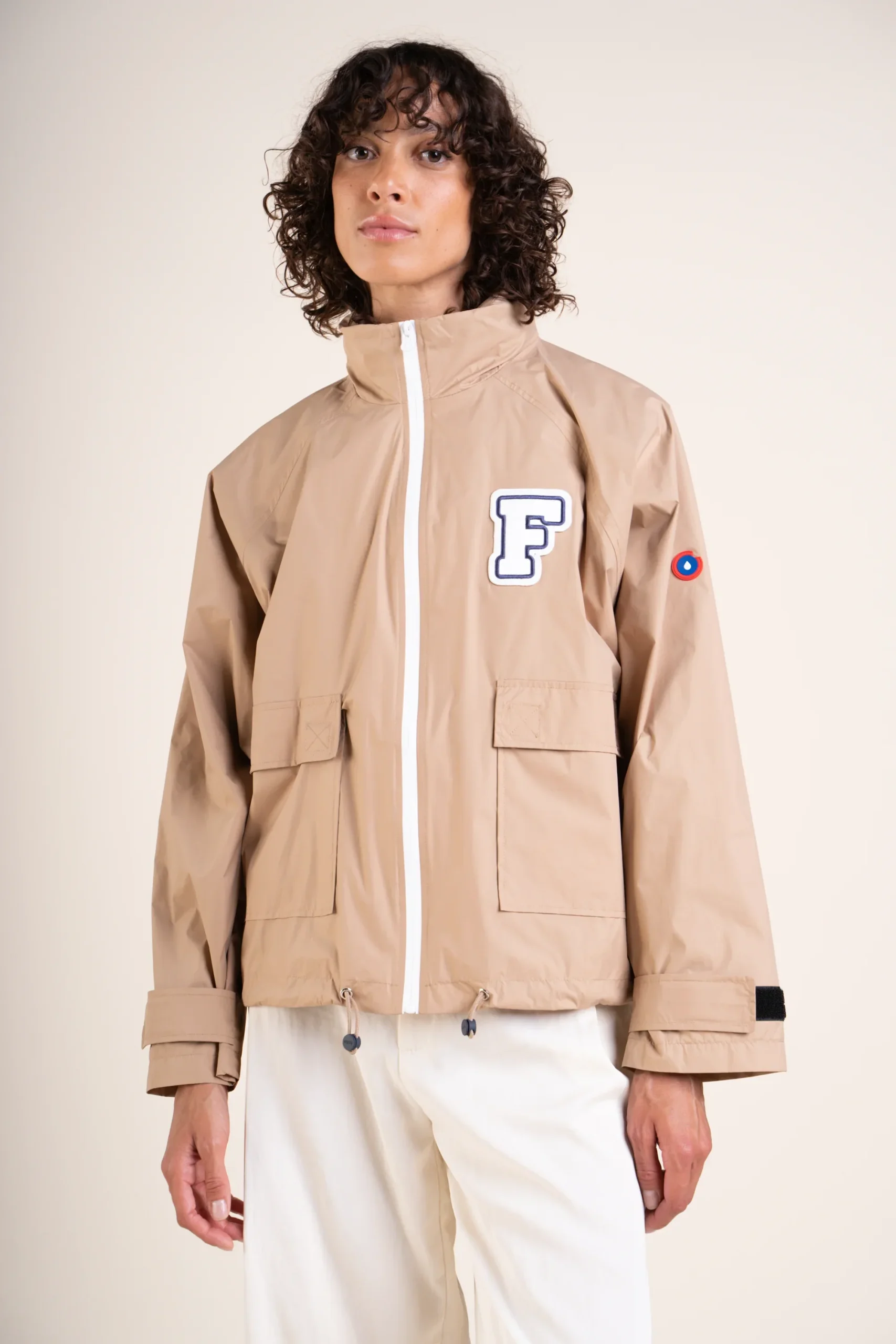 Inspirée de la varsity jacket, une veste imperméable et coupe-vent courte. Tissu en polyamide recyclé, respirant et léger. Fini brillant et patchs. Capuche cachée au col.