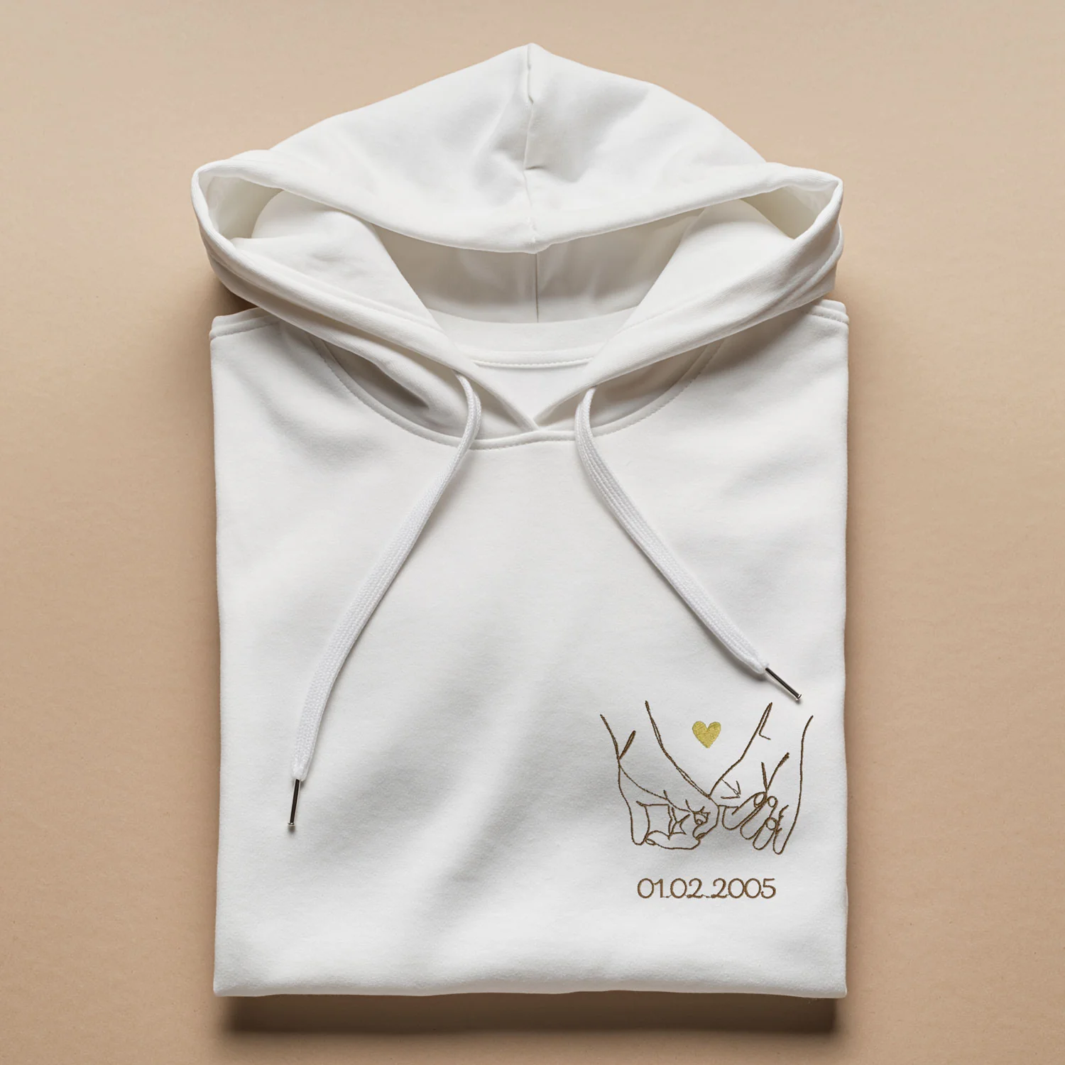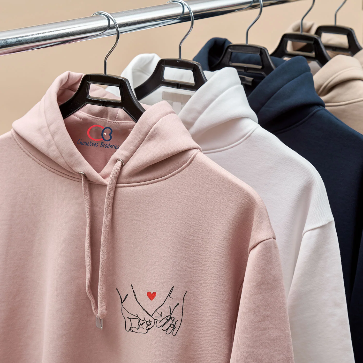 Ce sweat à capuche couple brodé met en avant un motif fort et intemporel : deux mains entrelacées, symbole d’amour, de lien et de complicité.