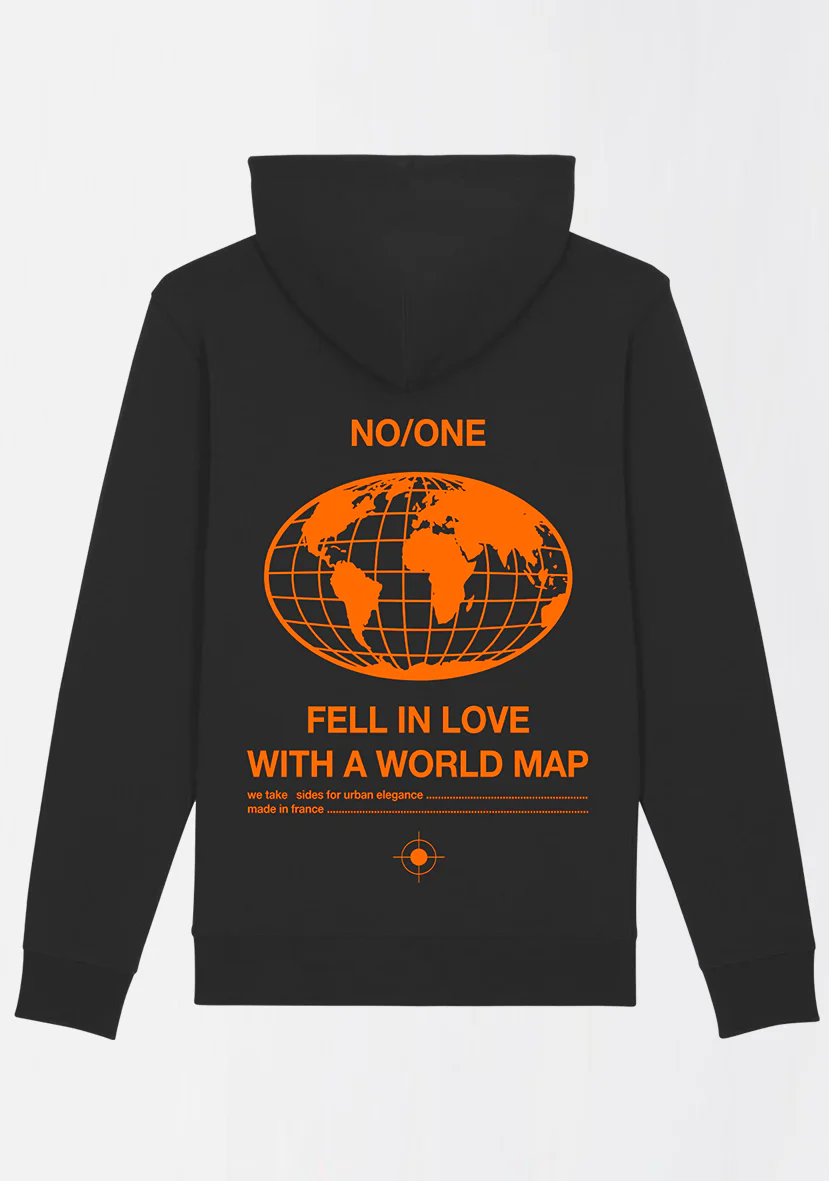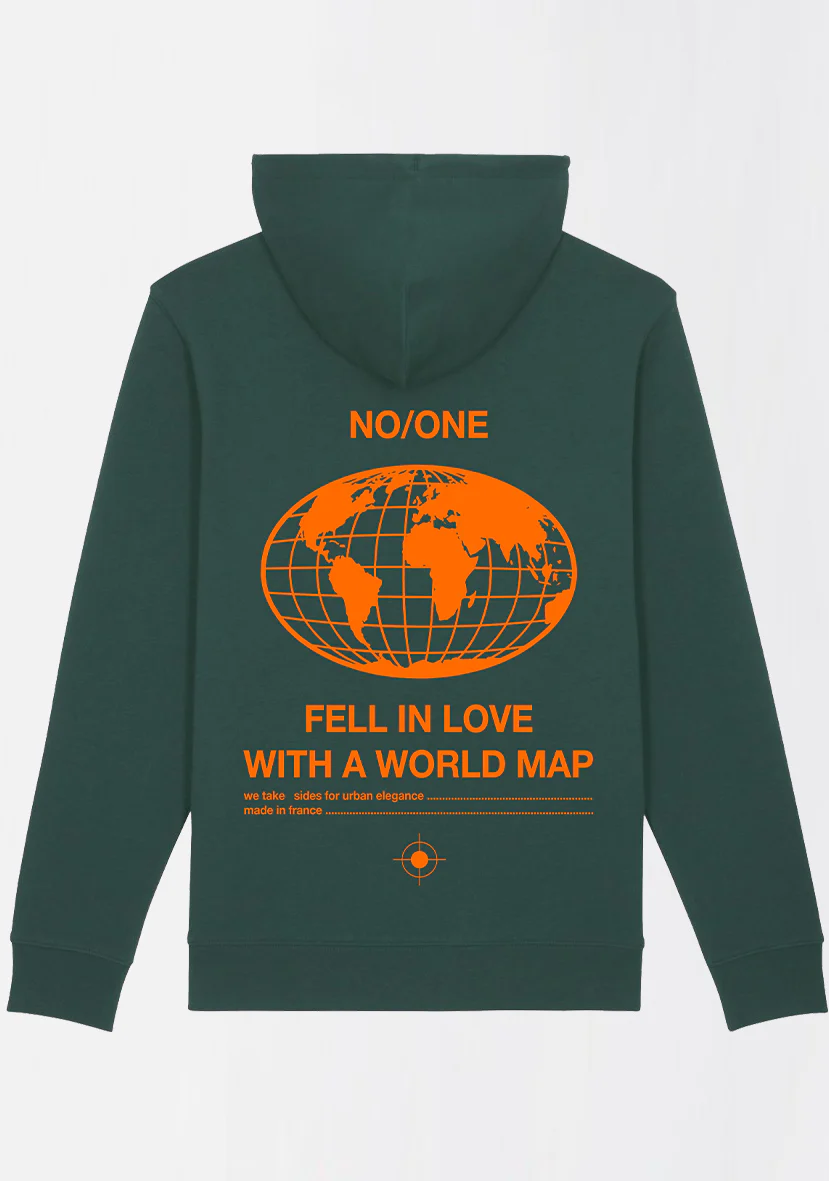 Sweat à capuche rouge unisexe en coton bio avec logo « WORLD MAP » imprimé dans le dos. l est fabriqué à partir de tissus respectueux de l’environnement pour un mode de vie durable, tandis que son design unique lui confère un style personnel audacieux.