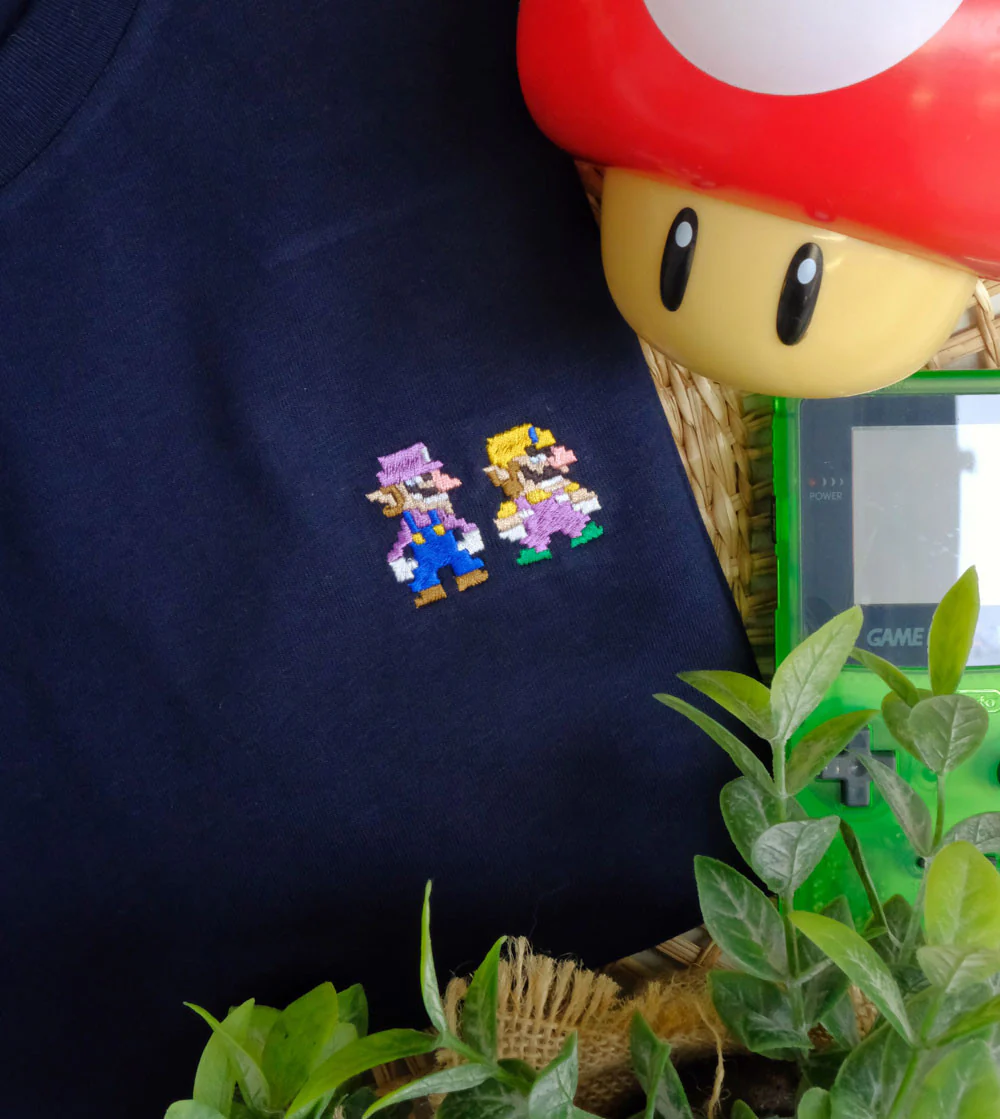 Wario et Waluigi brodés sur un t-shirt pour les fans de l’univers Super Mario et de ces méchants !