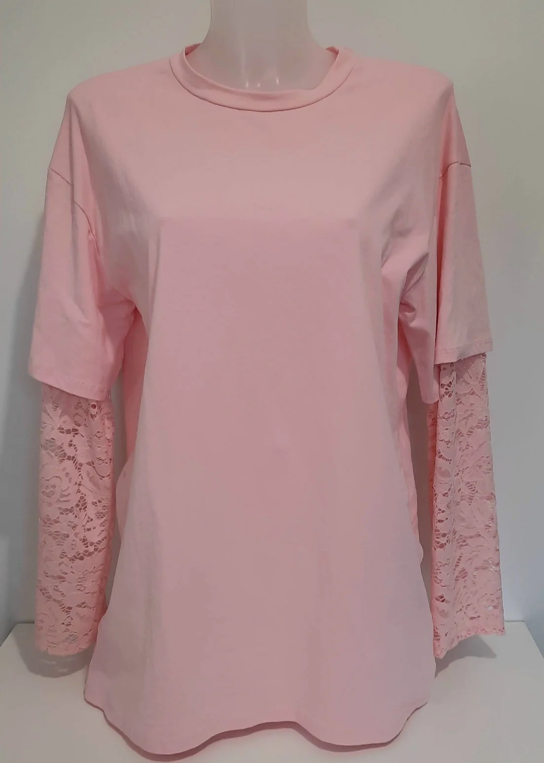 Apportez une touche d’élégance à votre dressing avec notre t-shirt rose aux manches longues en dentelle.