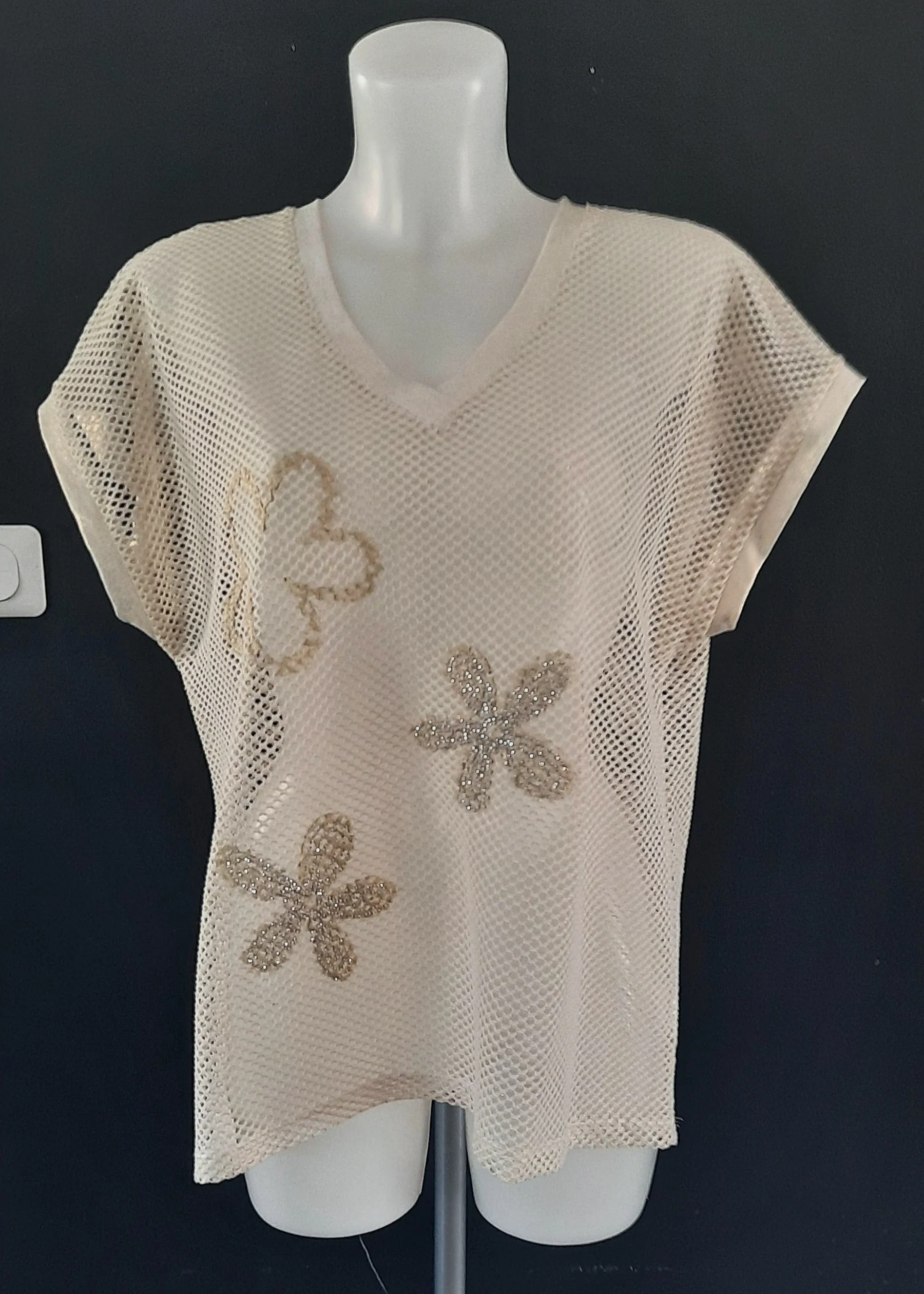 Envie d’une pièce aérienne et stylée ? Ce haut en résille beige est fait pour vous. Sa coupe fluide, son col en V et ses fleurs brodées en fil doré apportent une touche bohème chic parfaite pour l’été.