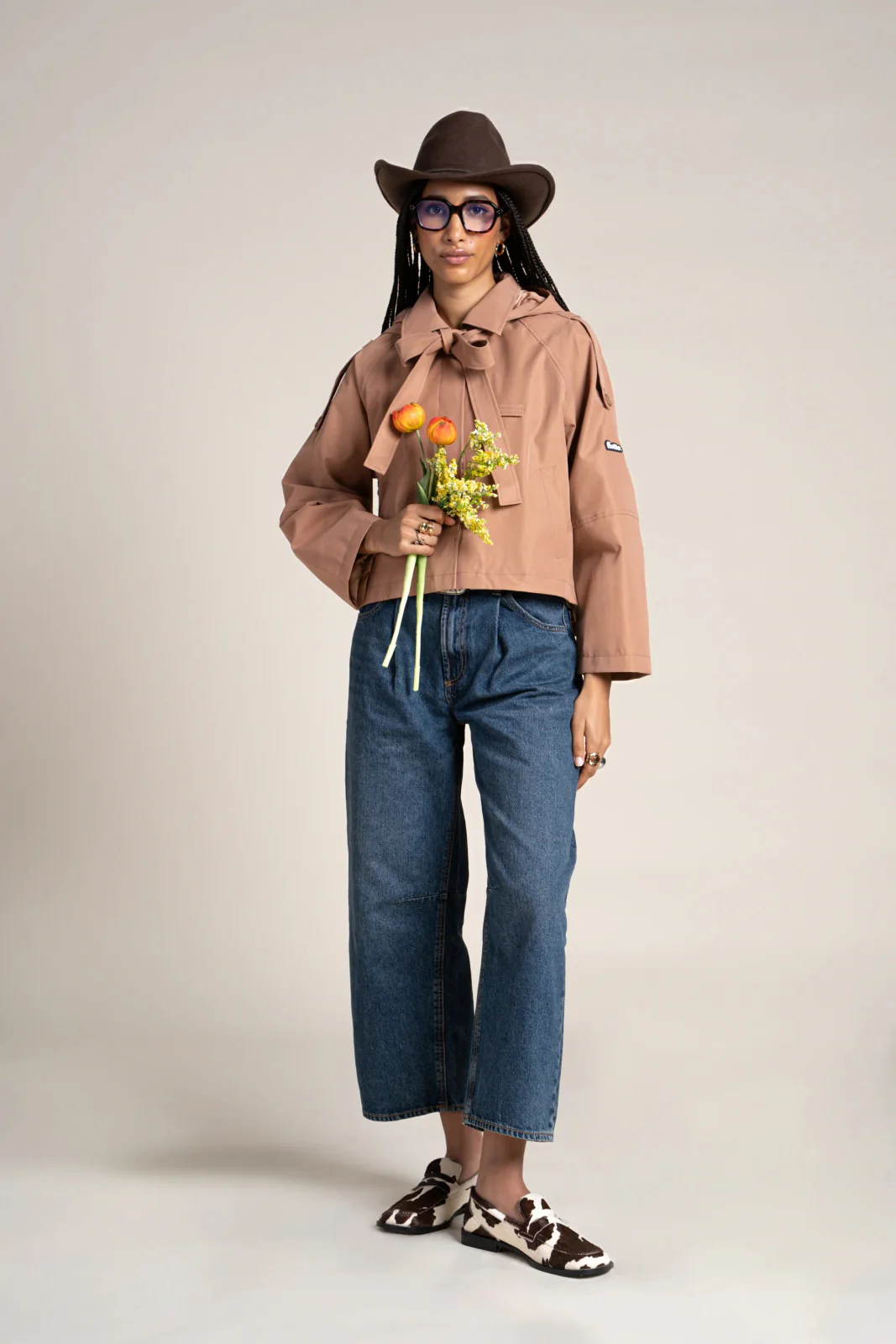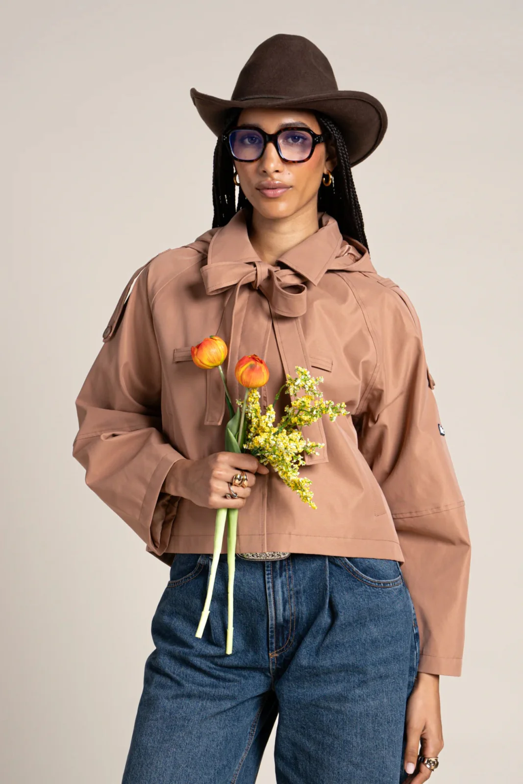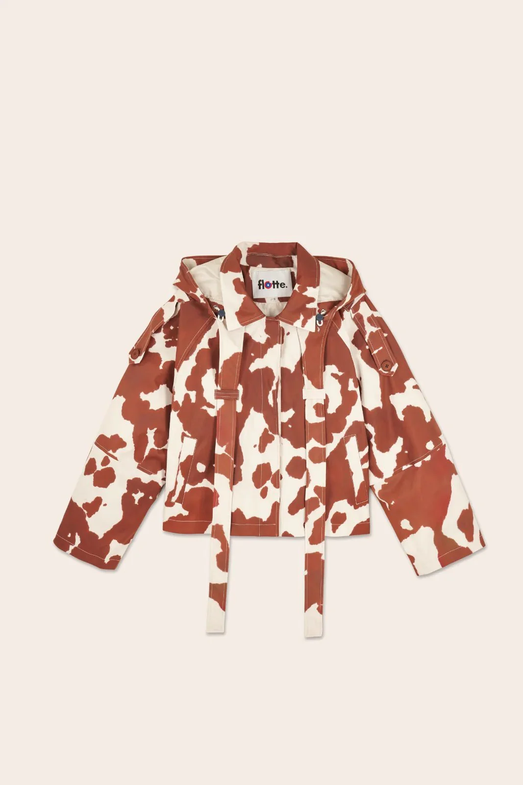 Inspirée du trench-coat. Imperméable et coupe-vent. Tissu en polyester recyclé, respirant et léger. Capuche amovible, à nouer autour du cou ou à porter en cravate.