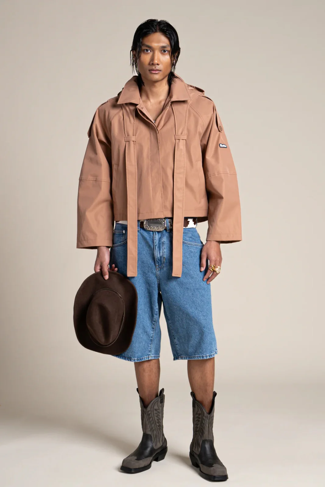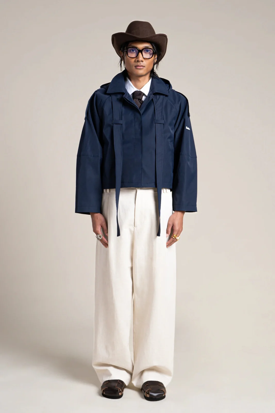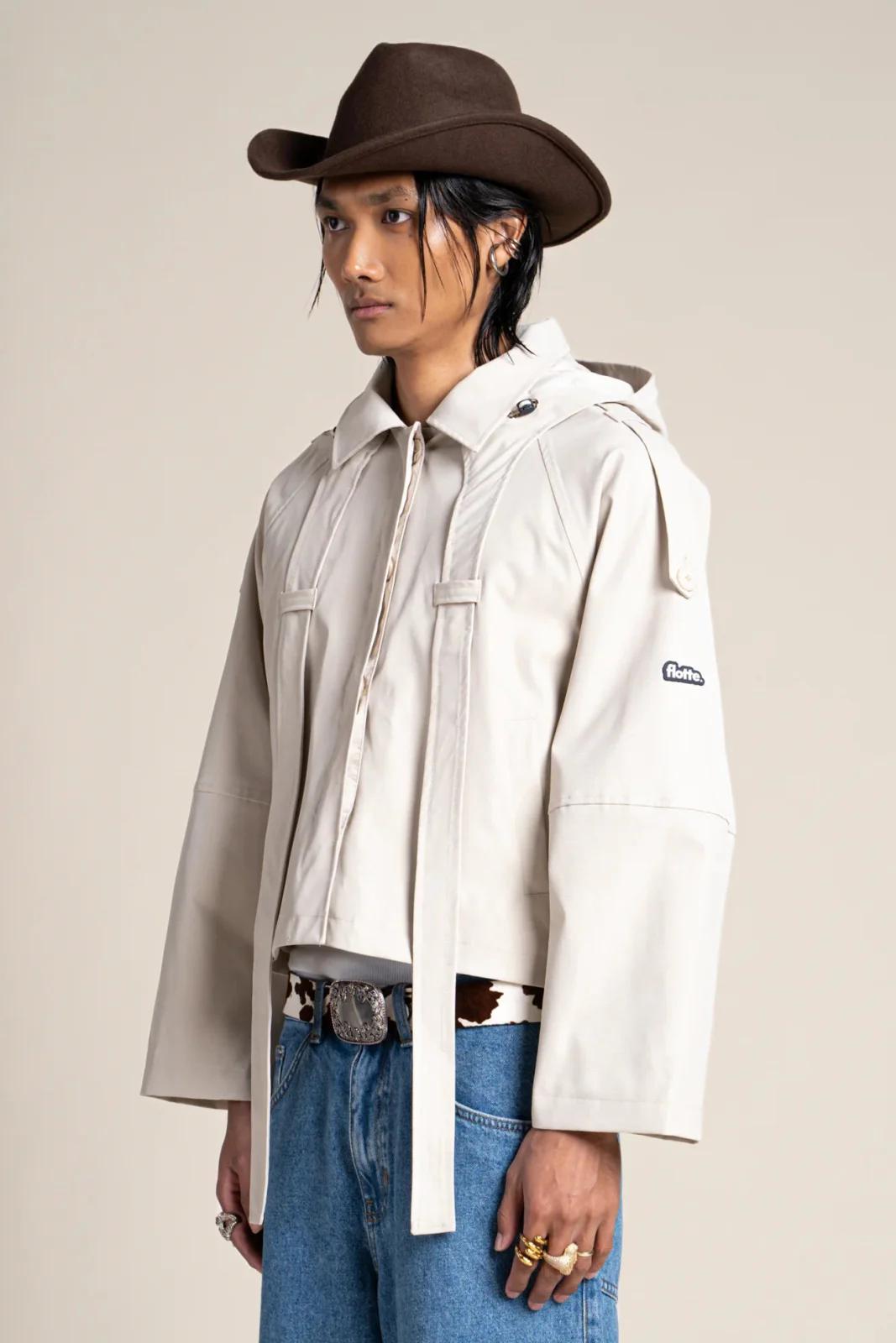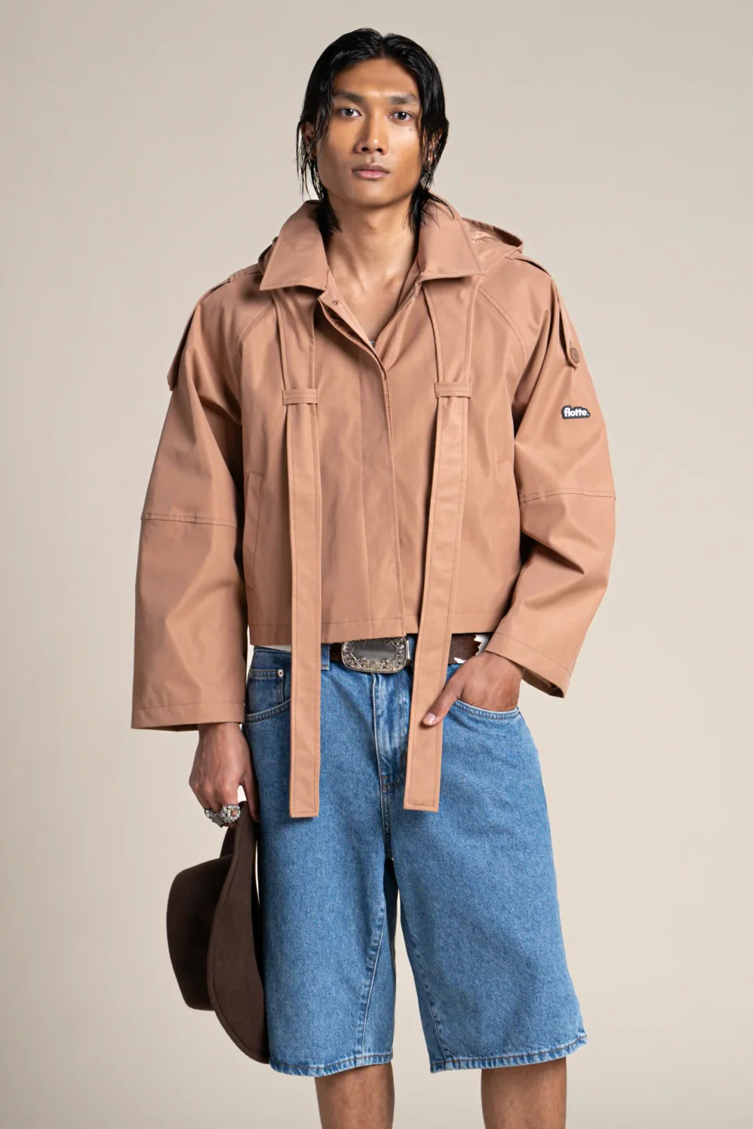 Inspirée du trench-coat. Imperméable et coupe-vent. Tissu en polyester recyclé, respirant et léger. Capuche amovible, à nouer autour du cou ou à porter en cravate.
