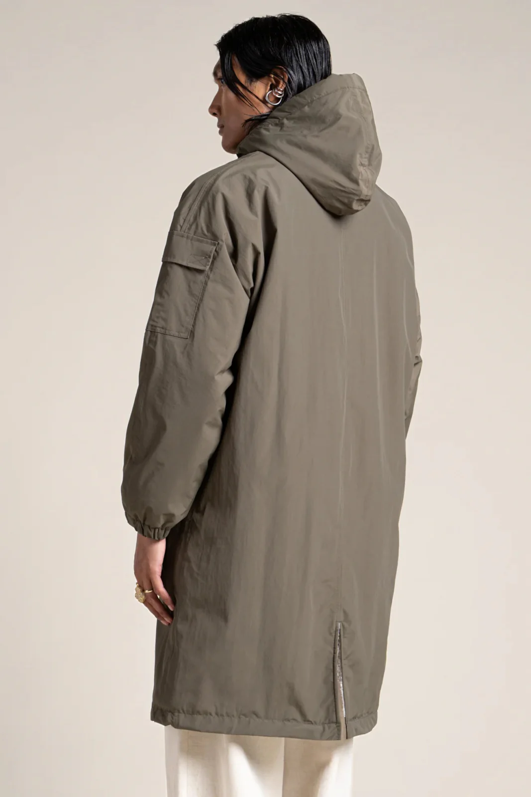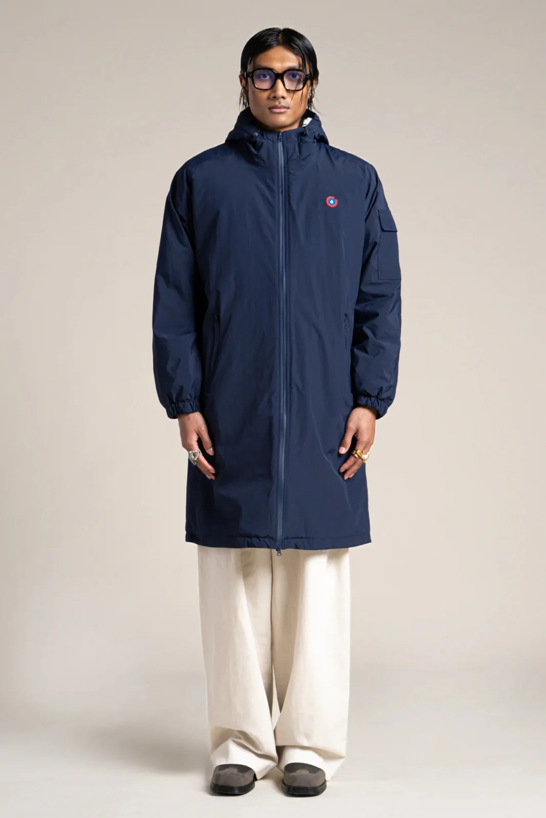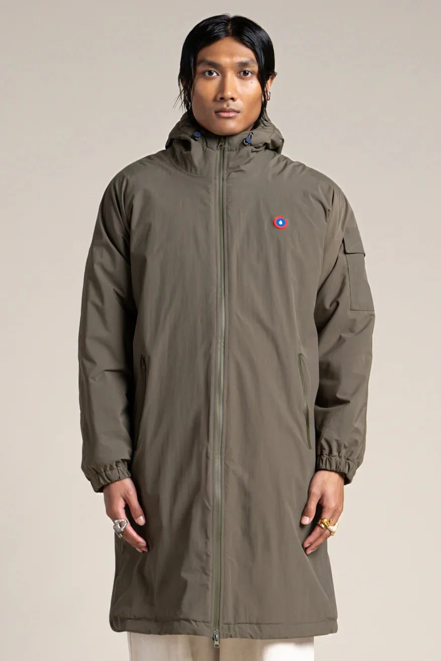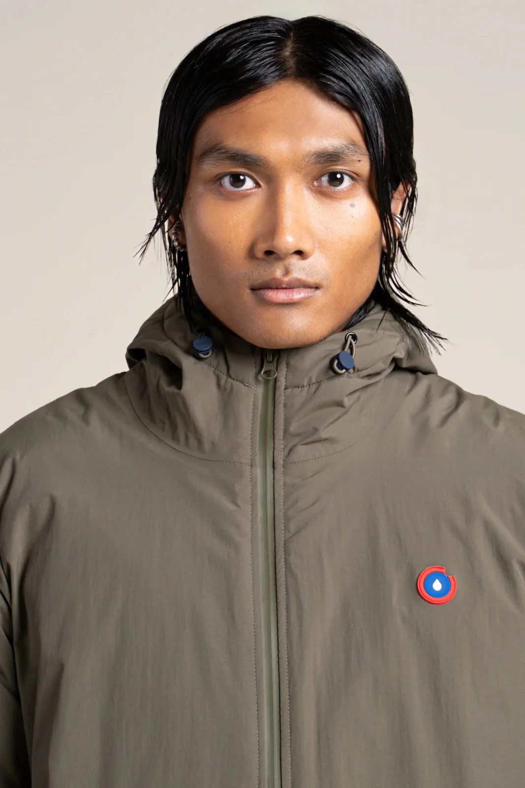Une parka longue, imperméable et doublée en polaire. Tissu en polyamide recyclé. Capuche doublée et col montant.