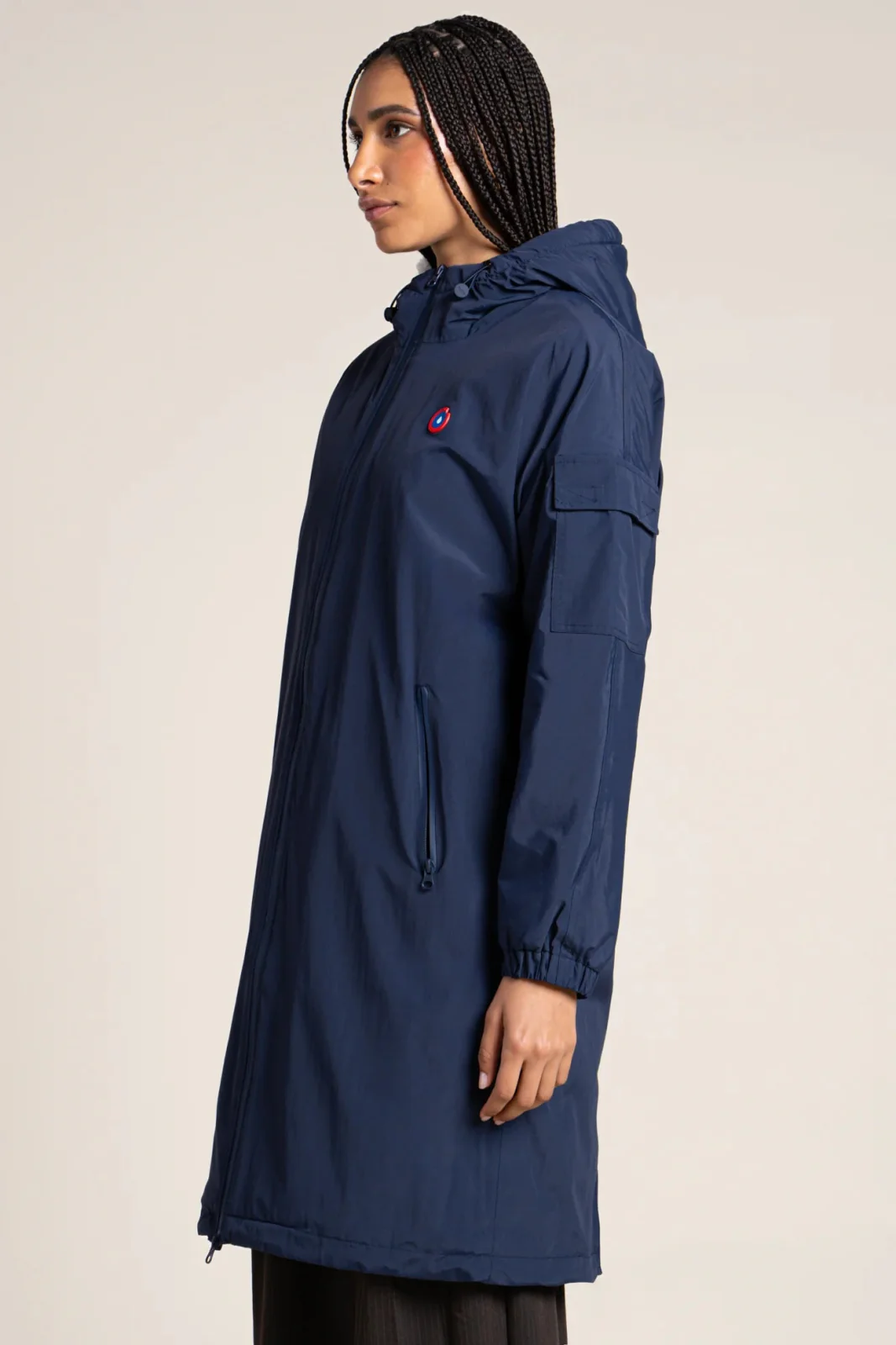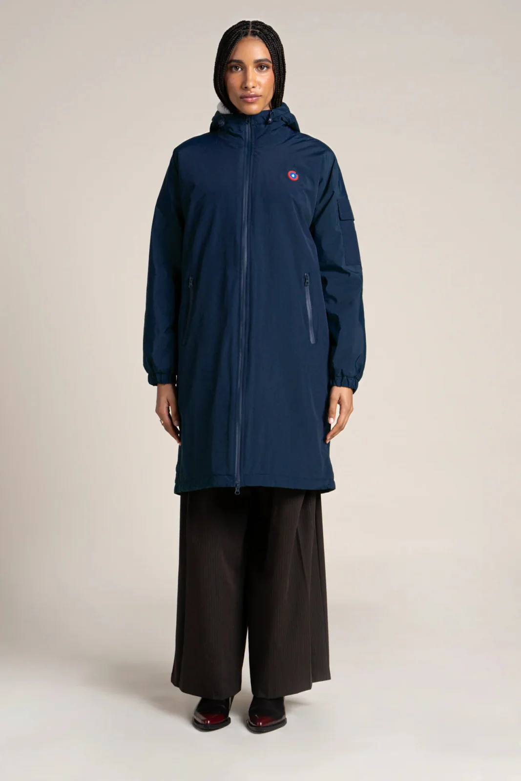 Une parka longue, imperméable et doublée en polaire. Tissu en polyamide recyclé. Capuche doublée et col montant.