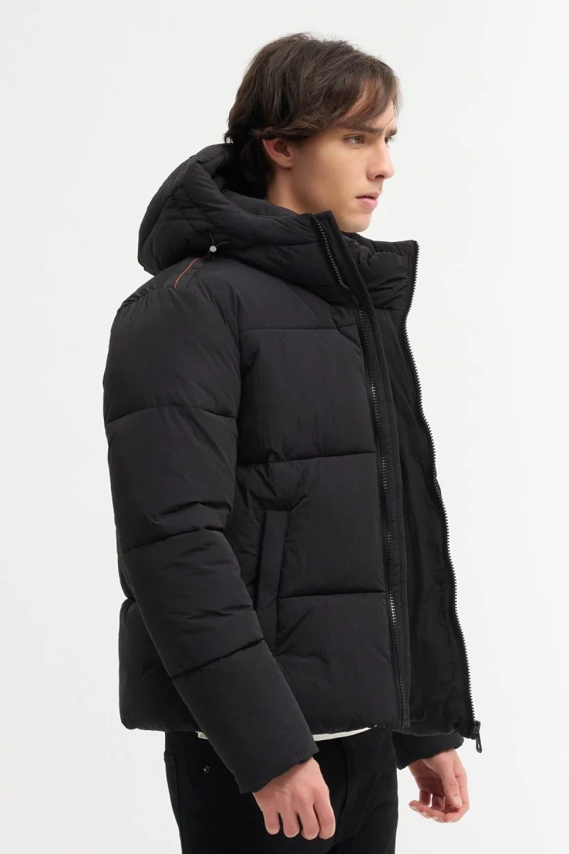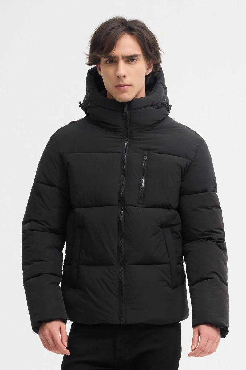 Veste matelassée à capuche avec fermeture zippée contrastée et poches fonctionnelles. Dotée d’une poche poitrine verticale et de bandes décoratives aux épaules pour un style technique et moderne. Confort thermique optimal grâce à son rembourrage épais et sa coupe ajustée.