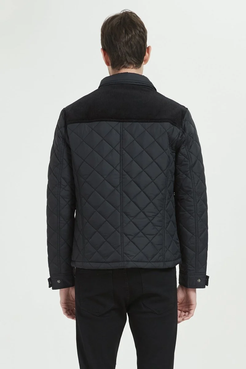 Veste légère coupe droite. Tissu matelassé piqué en losanges. Modèle bimatière coupe courte. Plastron velours devant et dans le dos. Petit col chemise. 2 poches plaquées à pressions. Patte pressionnée pour ajuster les poignets. Fermeture à glissière zippée. Une poche intérieur.