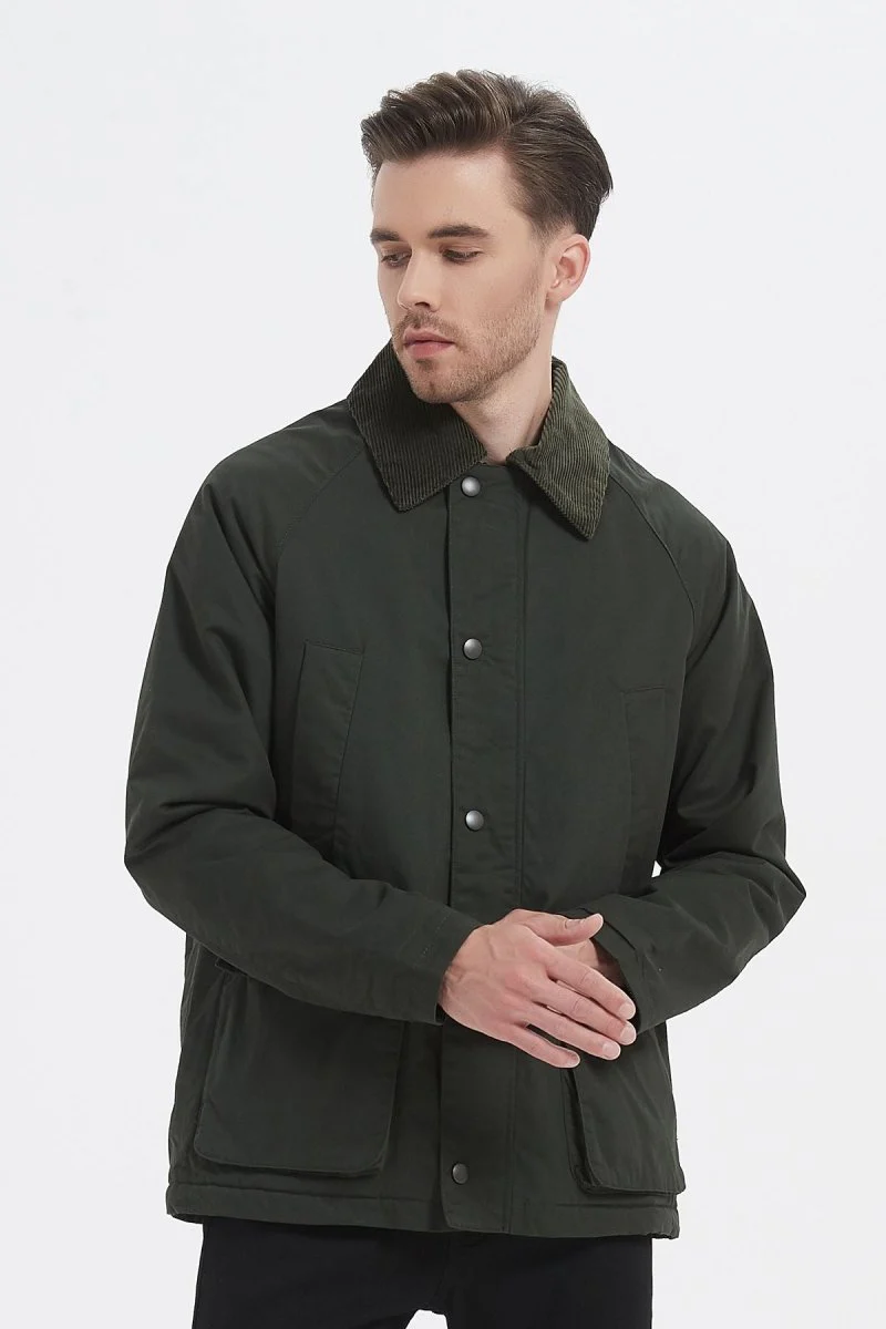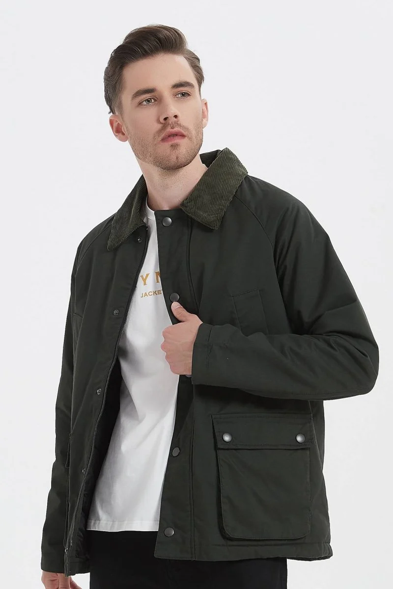 Veste de mi-saison à la coupe droite , Col chemise en velours côtelé , Fermeture par zip sous patte pressionnée , 2 poches raglan sur le torse , 2 poches soufflées plaquées sur les côtés , Disponible en 3 coloris.