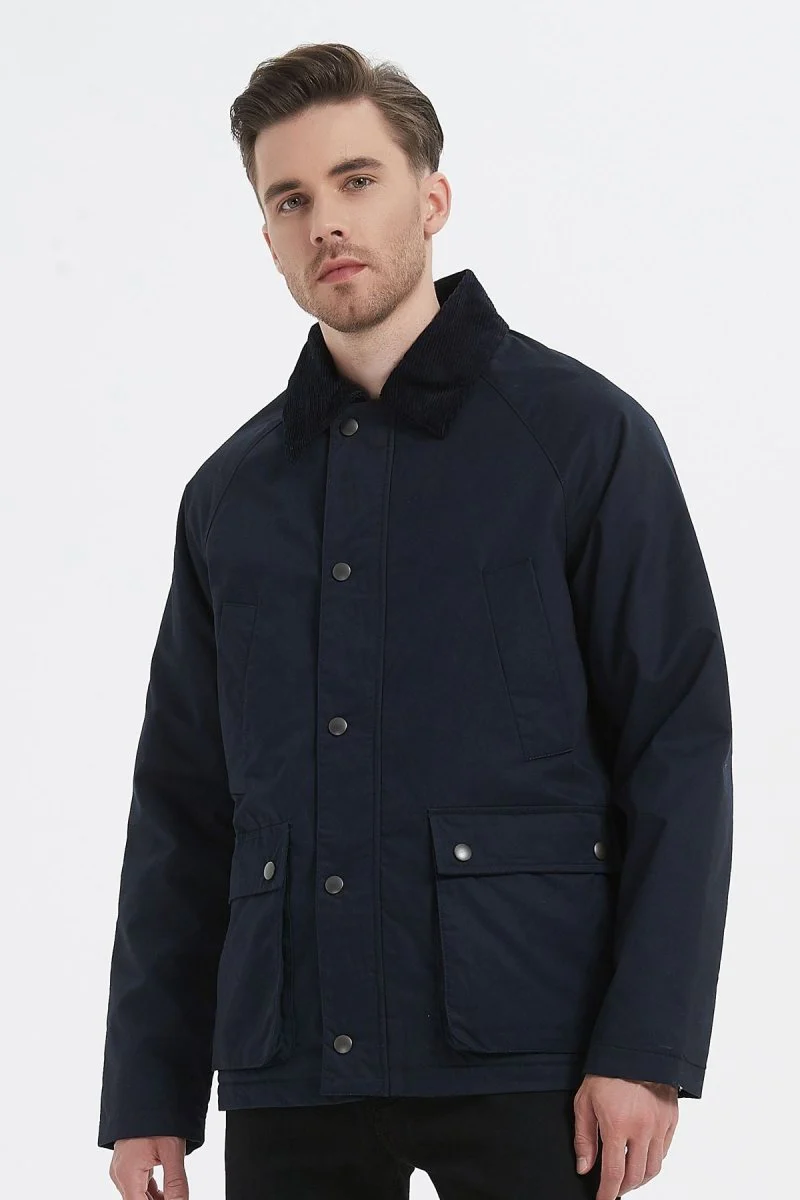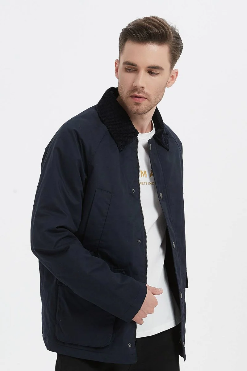 Veste de mi-saison à la coupe droite , Col chemise en velours côtelé , Fermeture par zip sous patte pressionnée , 2 poches raglan sur le torse , 2 poches soufflées plaquées sur les côtés , Disponible en 3 coloris.
