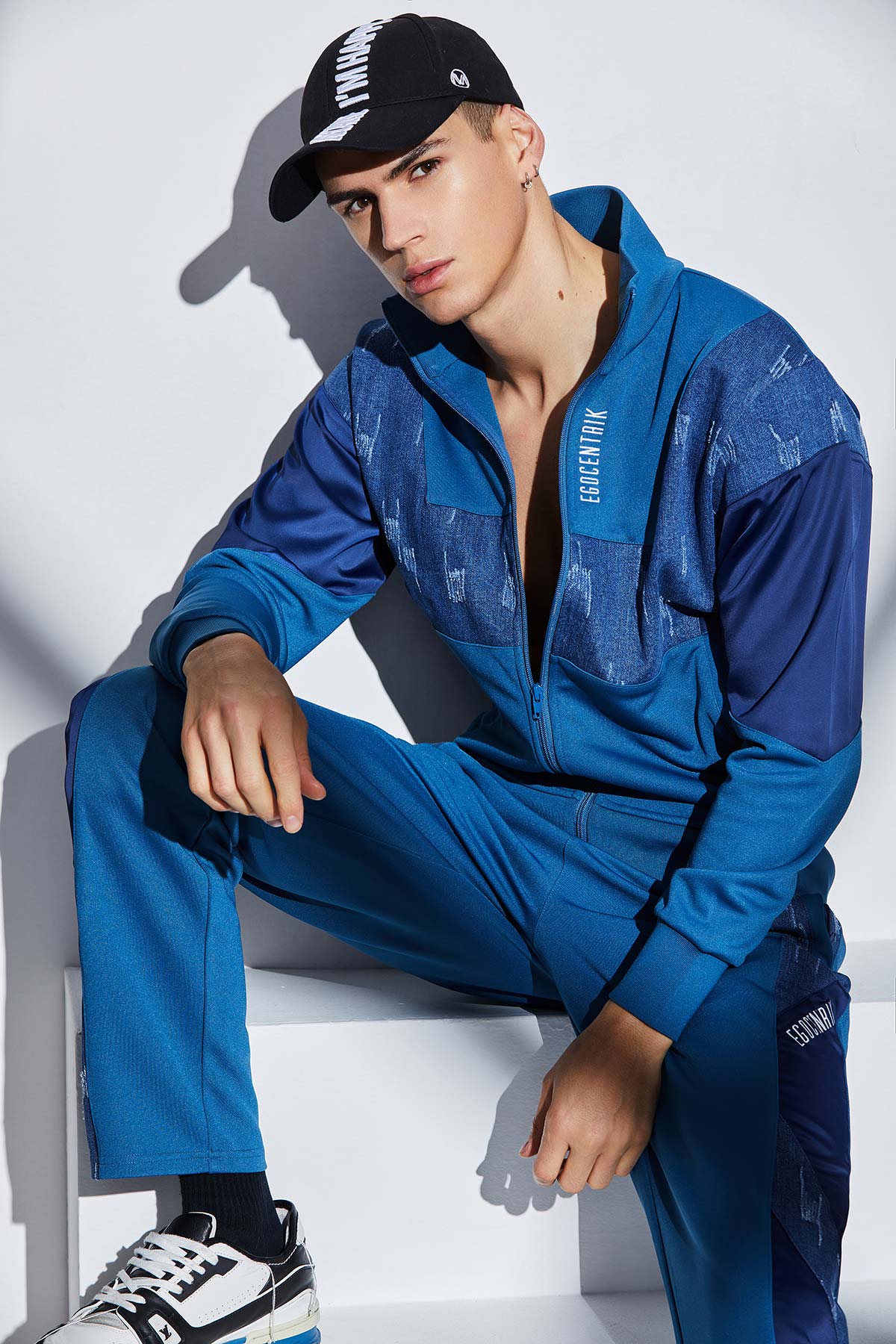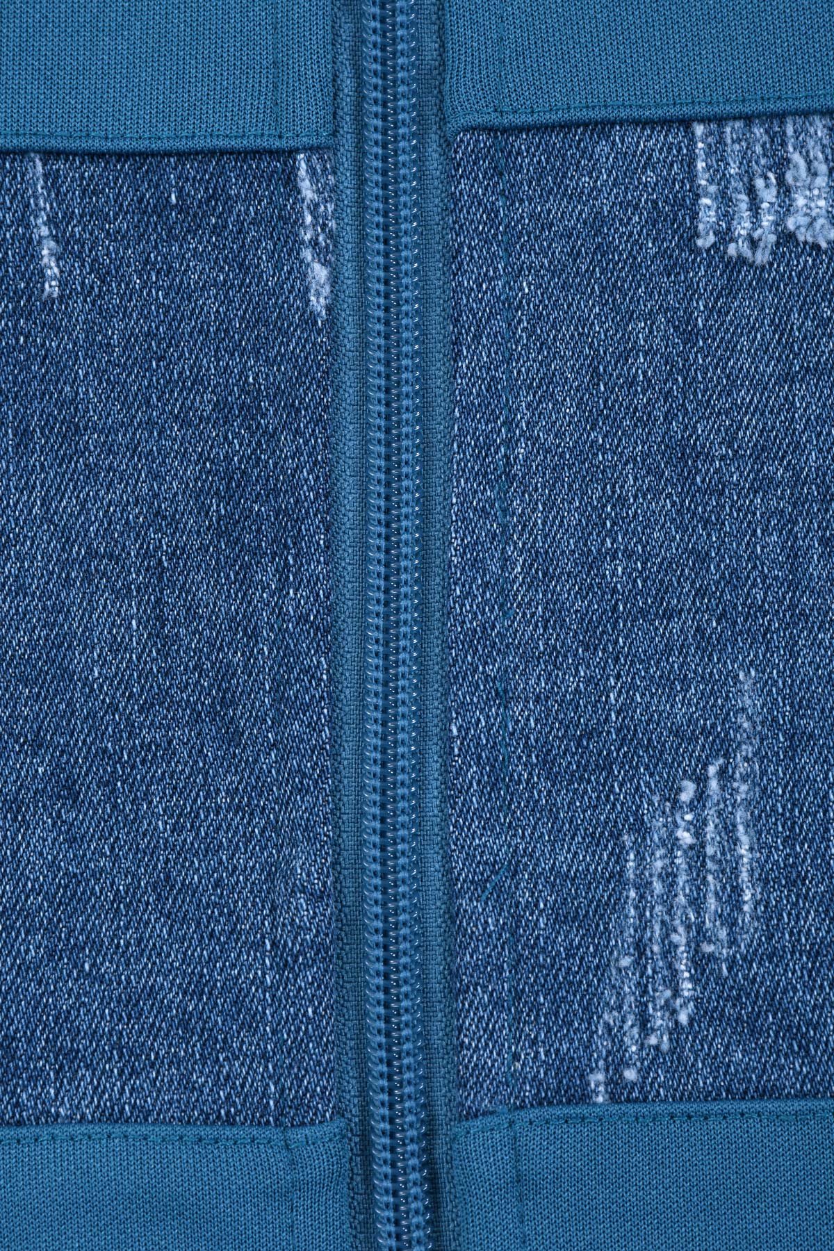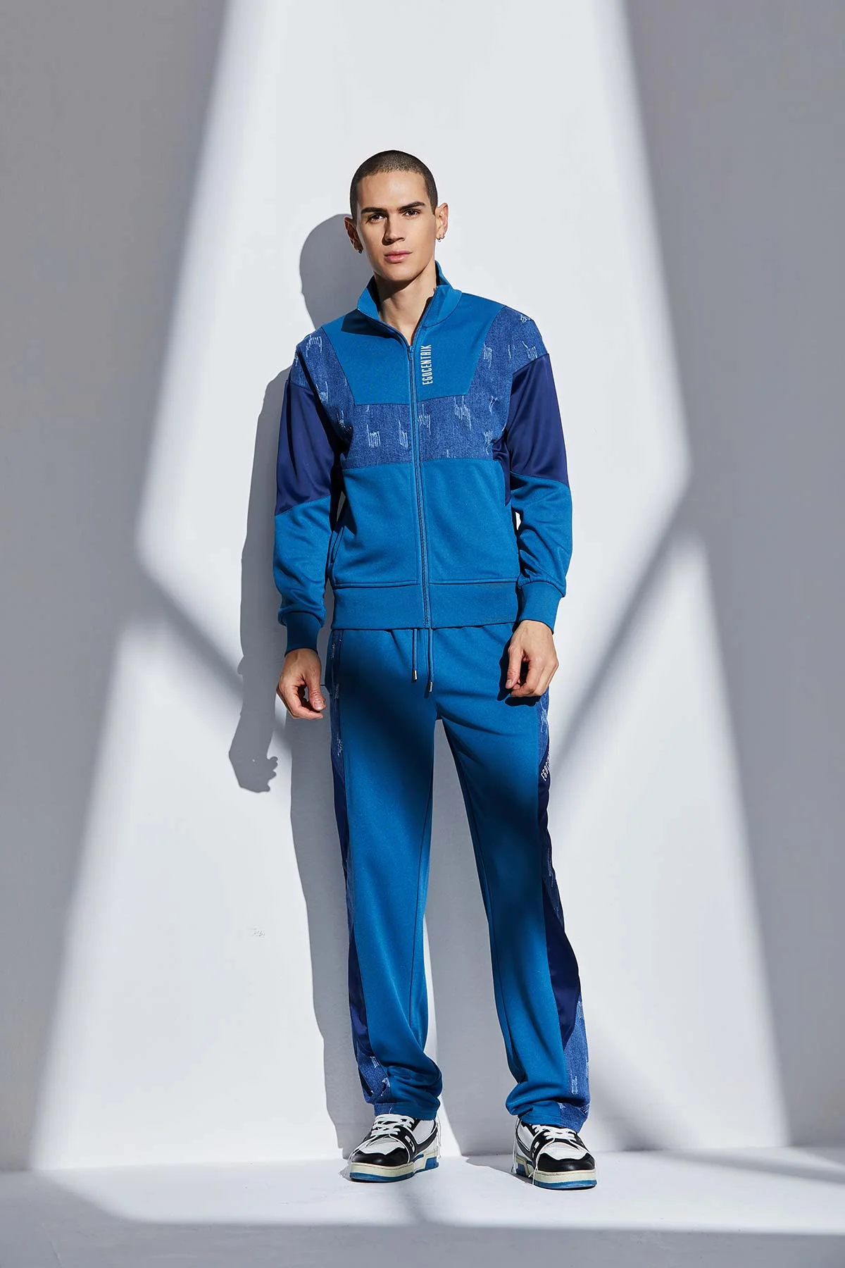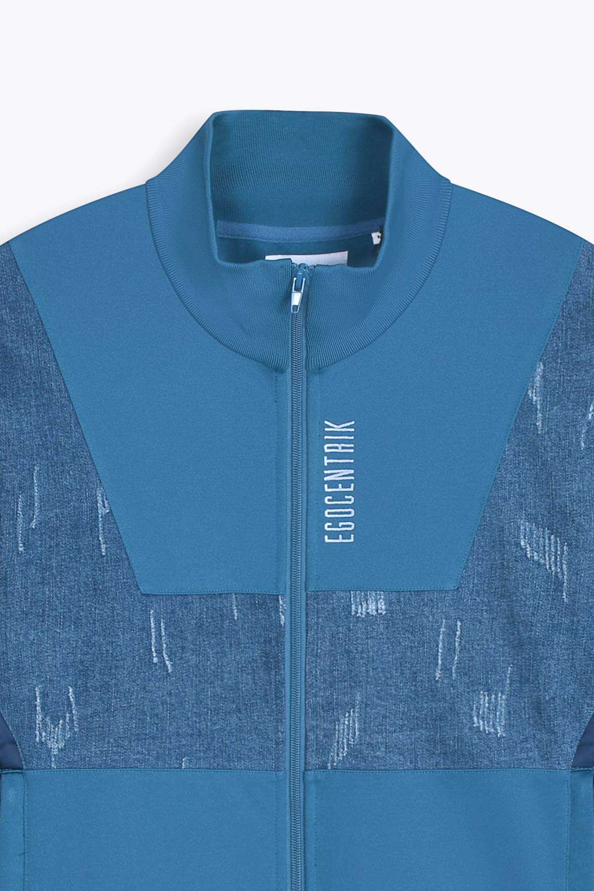 La veste de survêtement bi-matière est réalisée en nylon (Jersey) avec des empiècements en jean délavé.