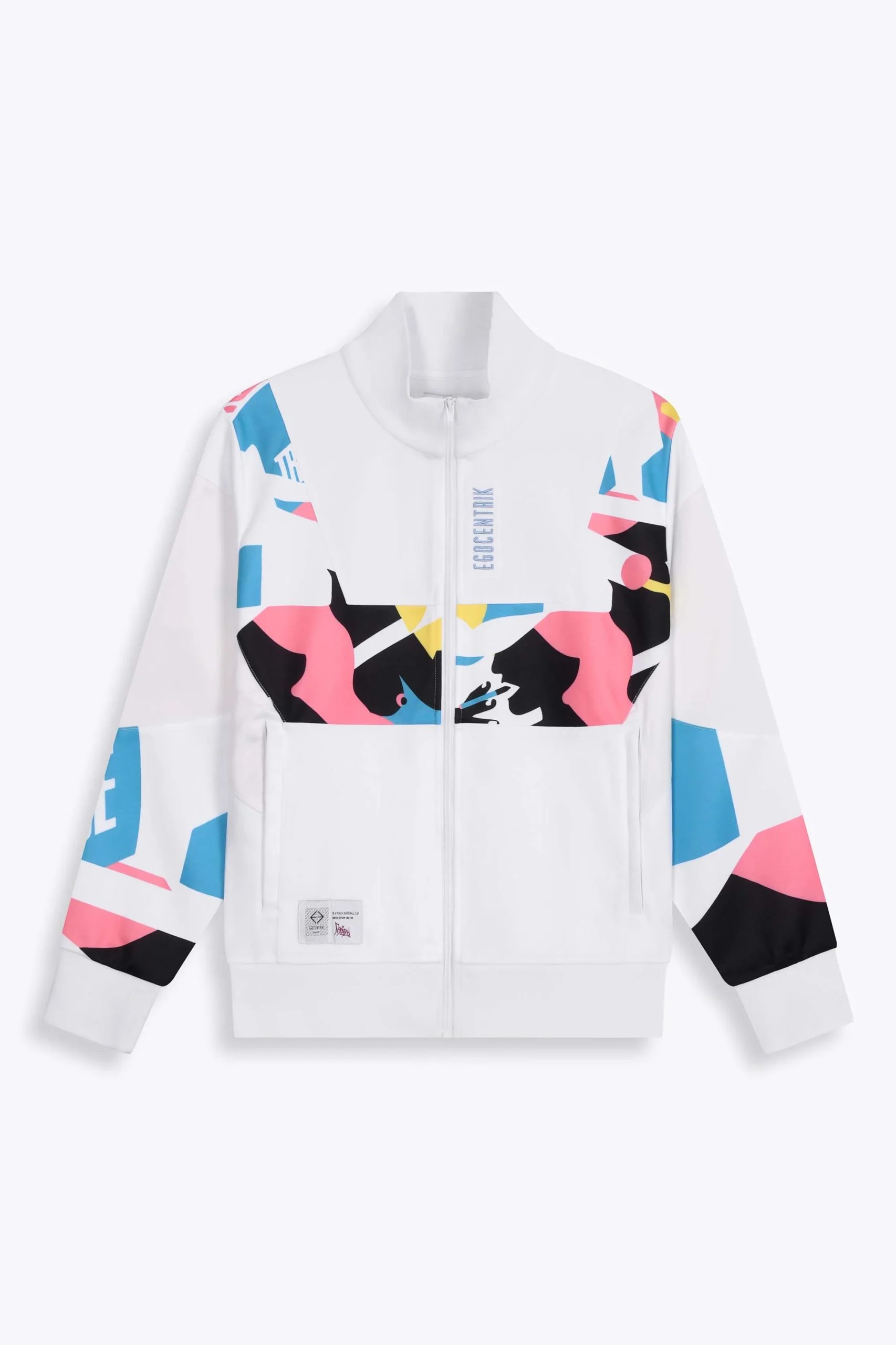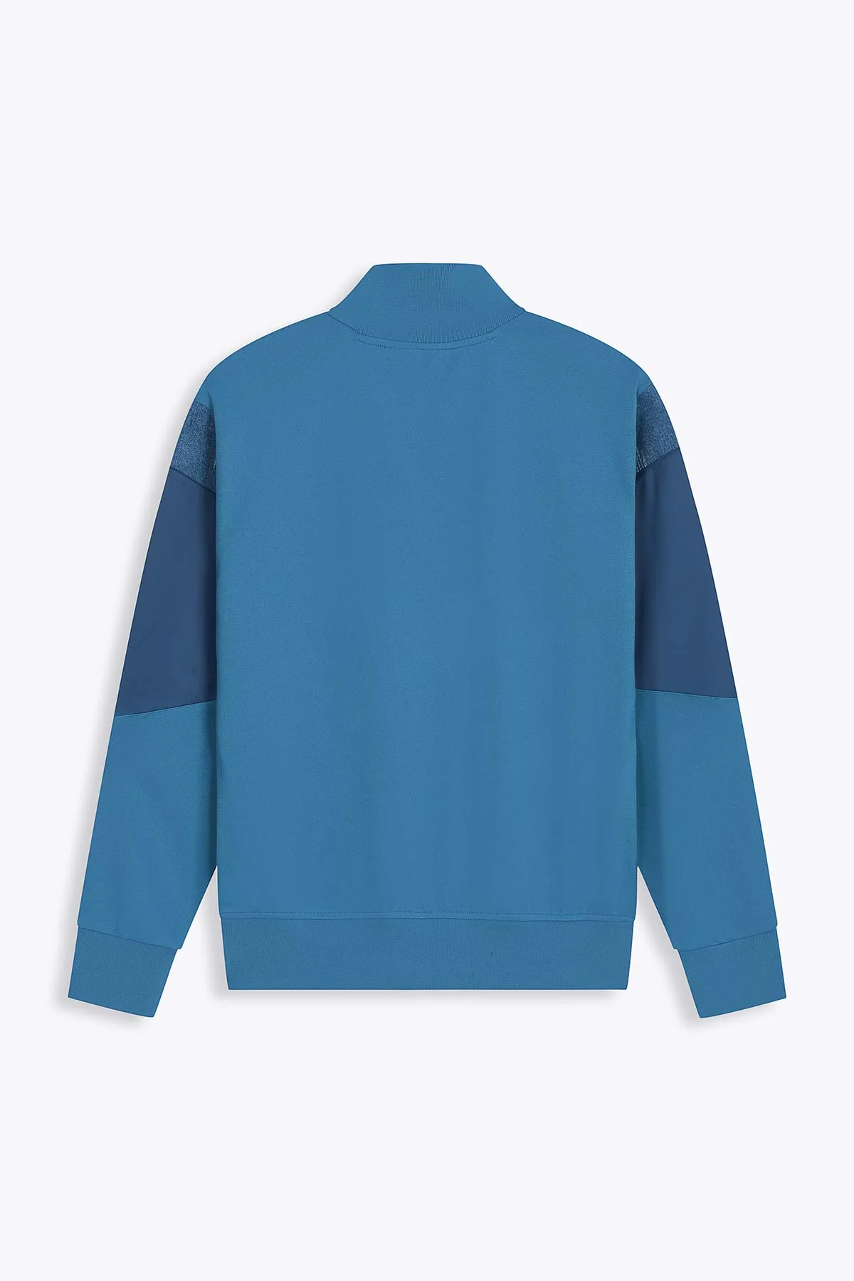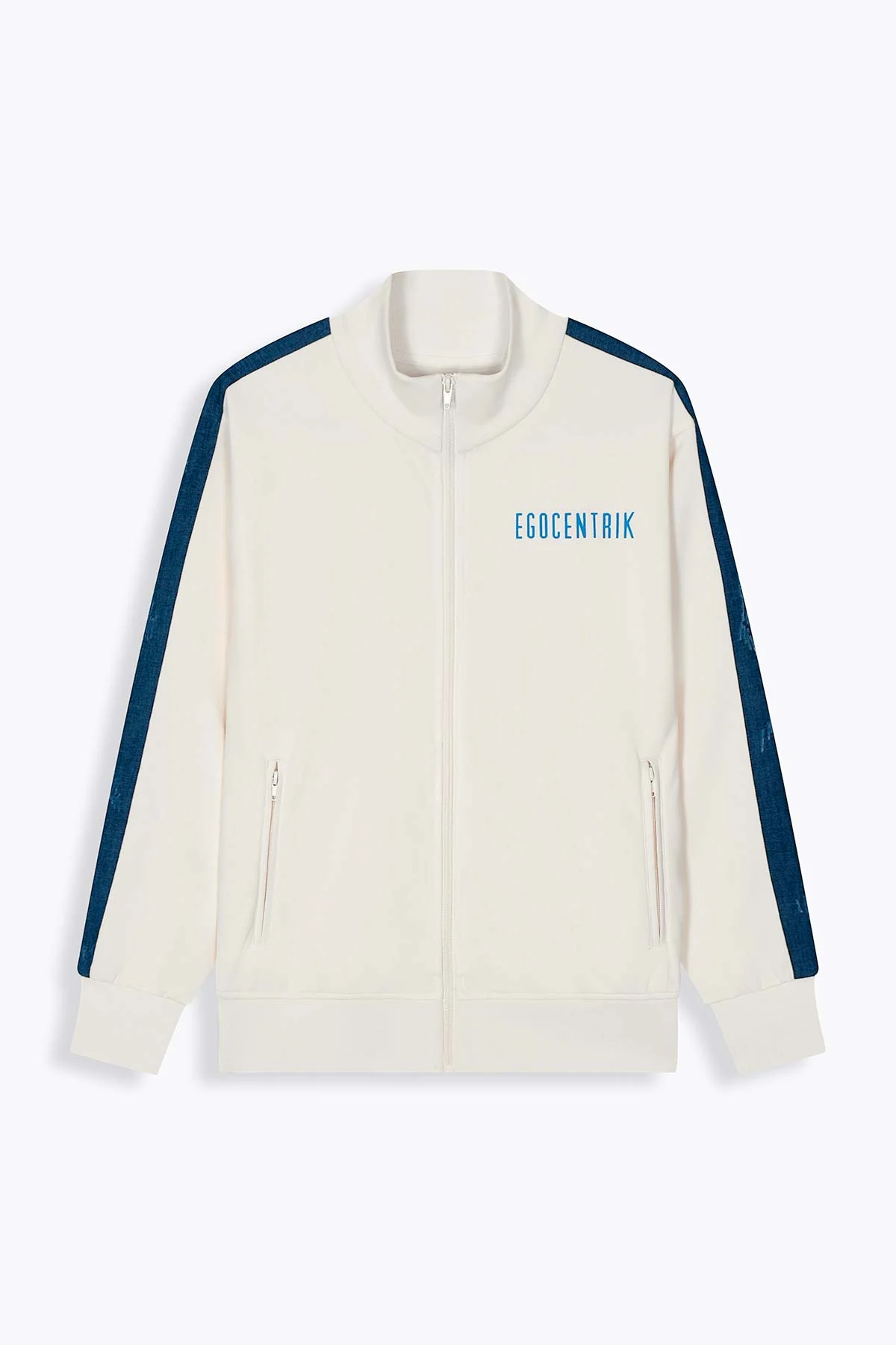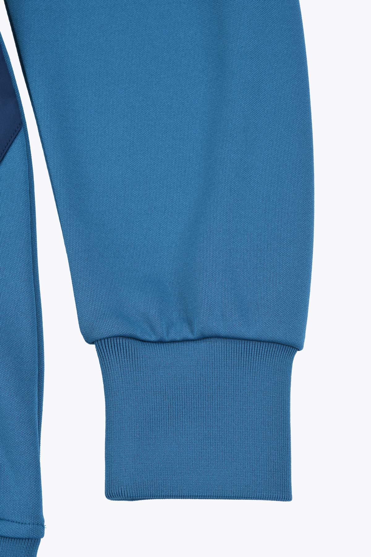 La veste de survêtement bi-matière est réalisée en nylon (Jersey) avec des empiècements en jean délavé.