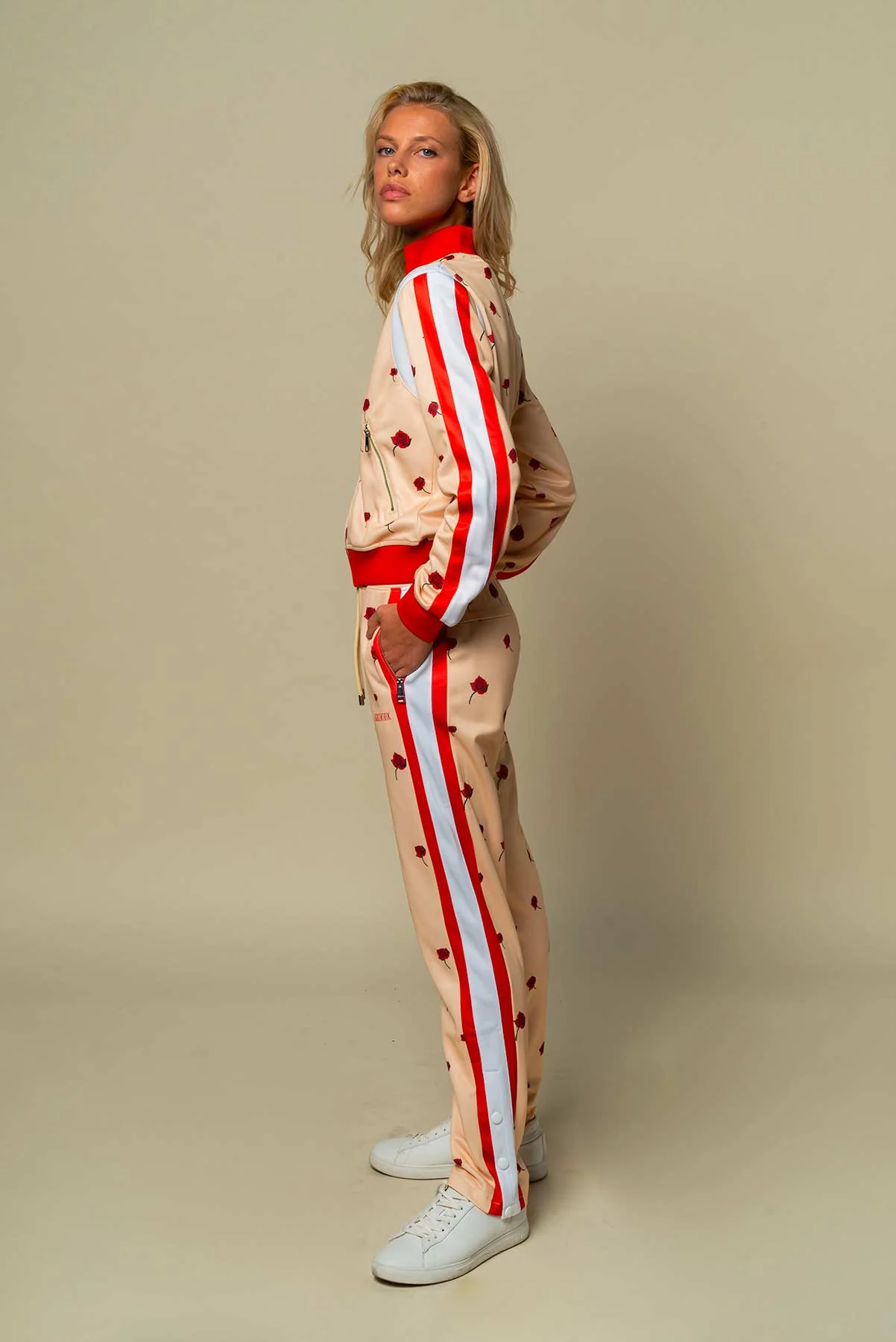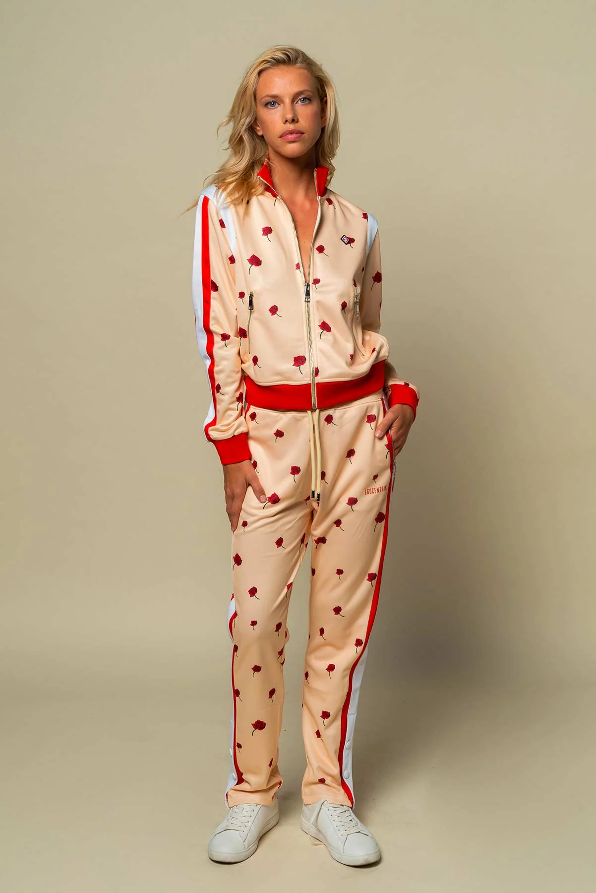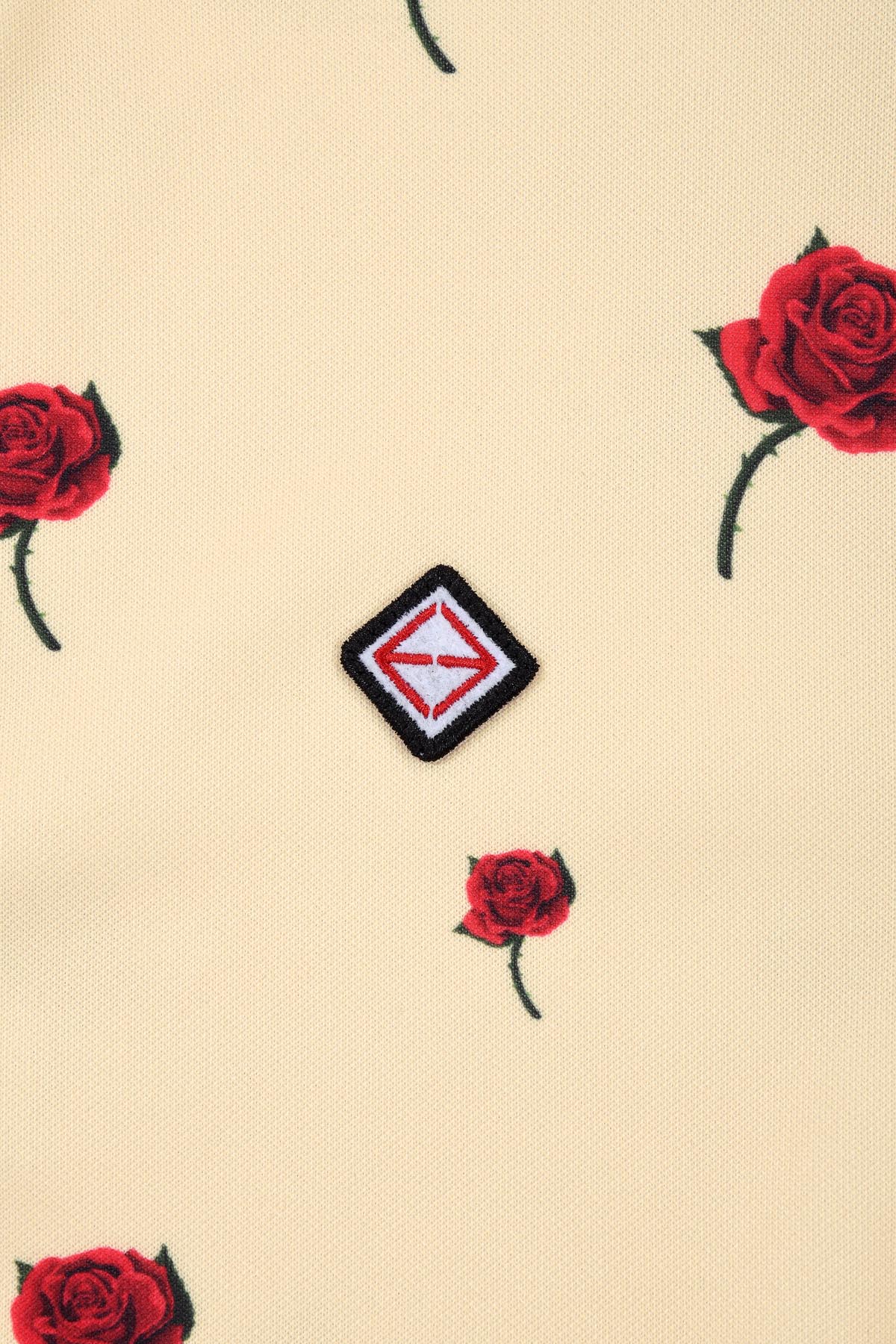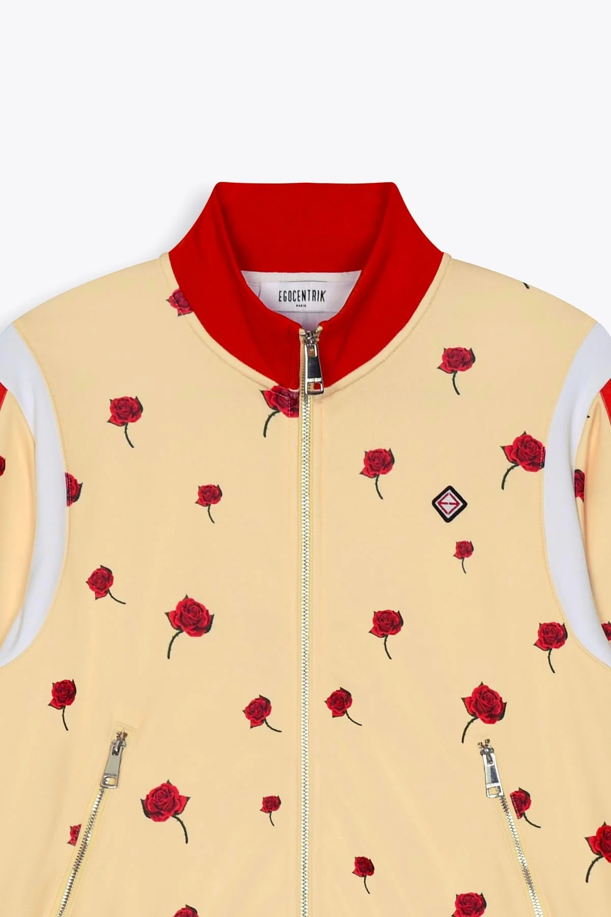 Réalisée en nylon poly de couleur jaune clair aux finitions rouges et aux multiples roses brodées élégamment, on retrouve brodée sur le coeur, une puce avec le logo Egocentrik. Cette veste possède 2 poches latérales zippées et des finitions élastiques.