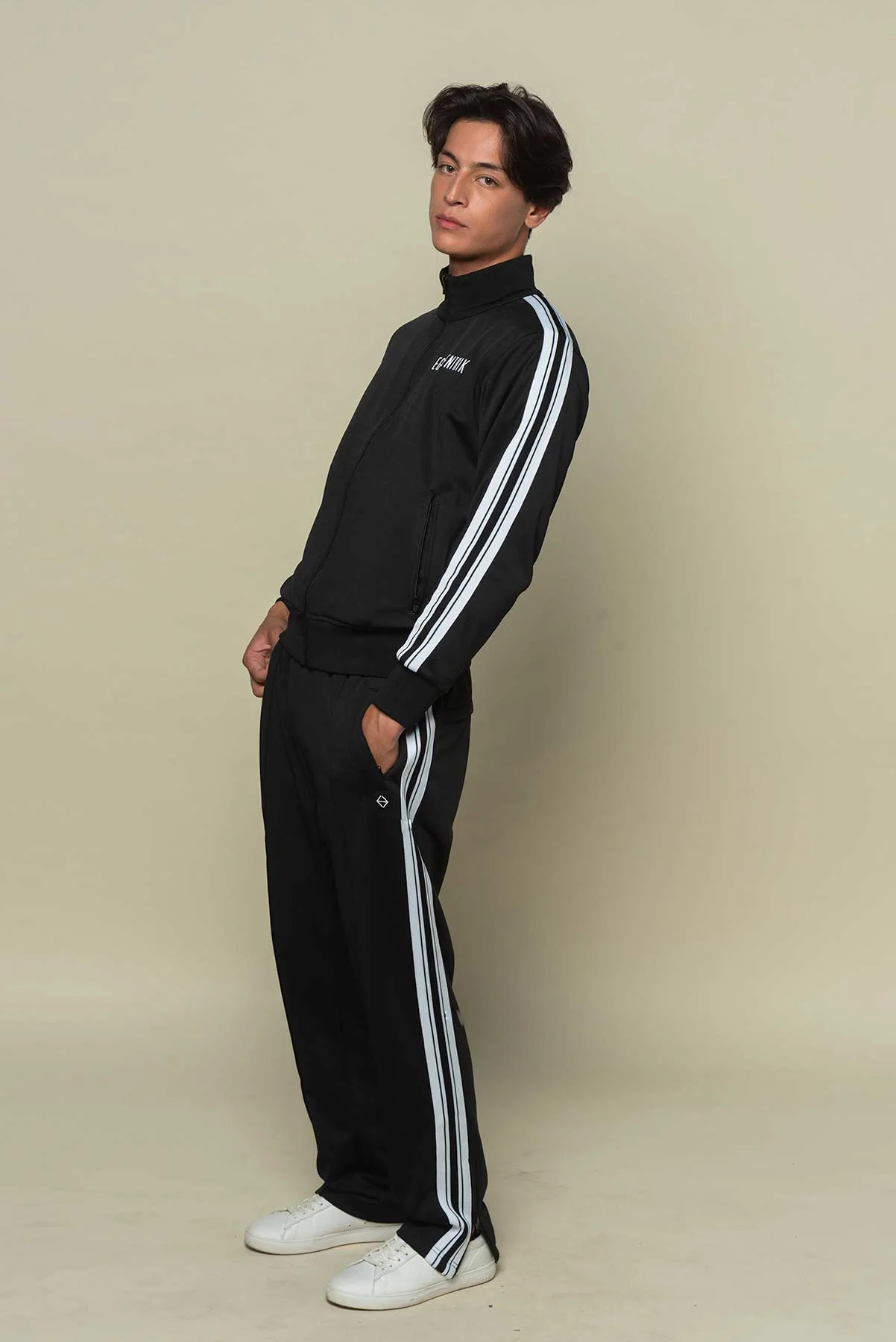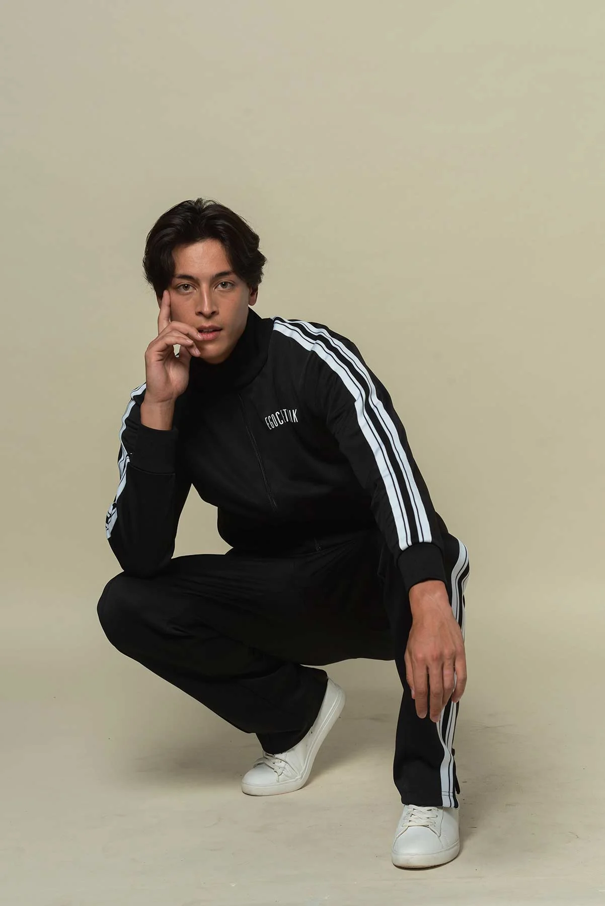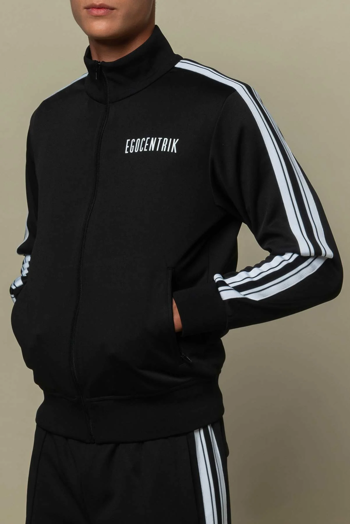 Réalisée en nylon (Jersey) de couleur noire, elle est contrastée de rayures latérales blanches sur les manches, répondant à sa fermeture zippée et au lettrage signature d’EGOCENTRIK. Elle possède 2 poches latérales zippées et des finitions élastiques.