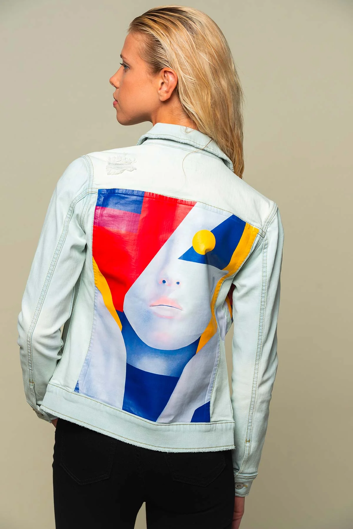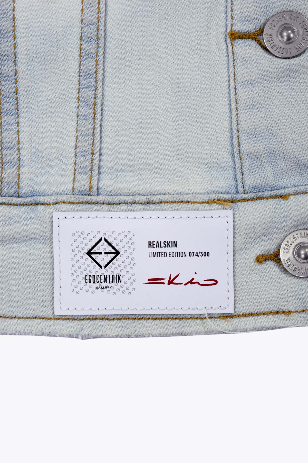 Cette veste en jean bleu clair, used et délavé pour un style très urbain et à la coupe actuelle, est sublimée par un empiècement dordal en Spandex imprimé de l’œuvre « REAL SKIN » de l’artiste Français SKIO. Ses boutons logotés et son logo EGOCENTRIK sur le coeur cousu sur une pièce de cuir lui apportent encore plus de style.