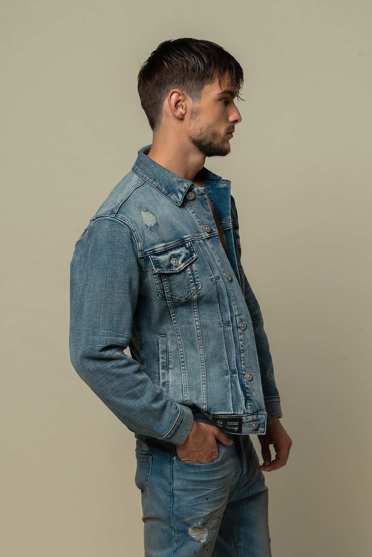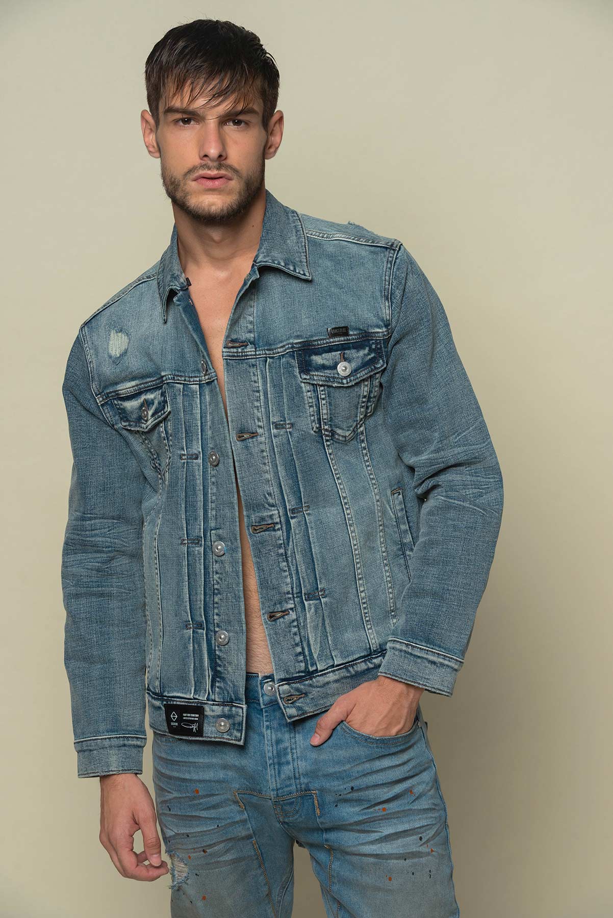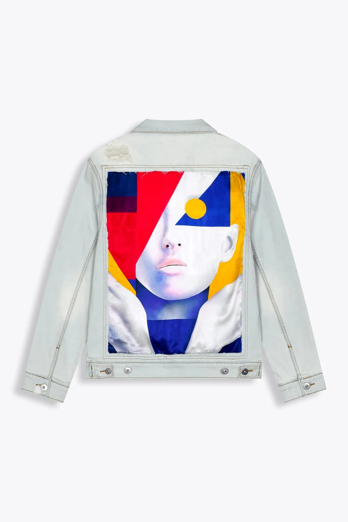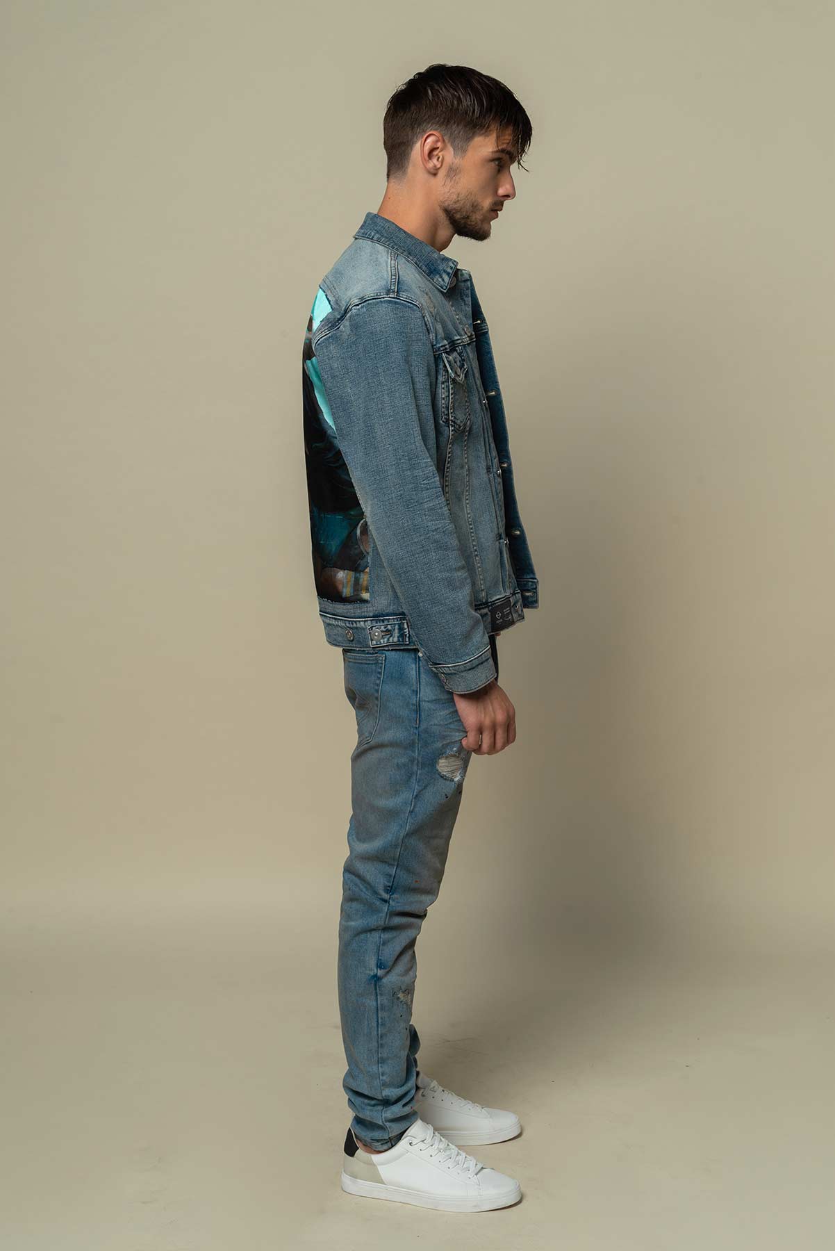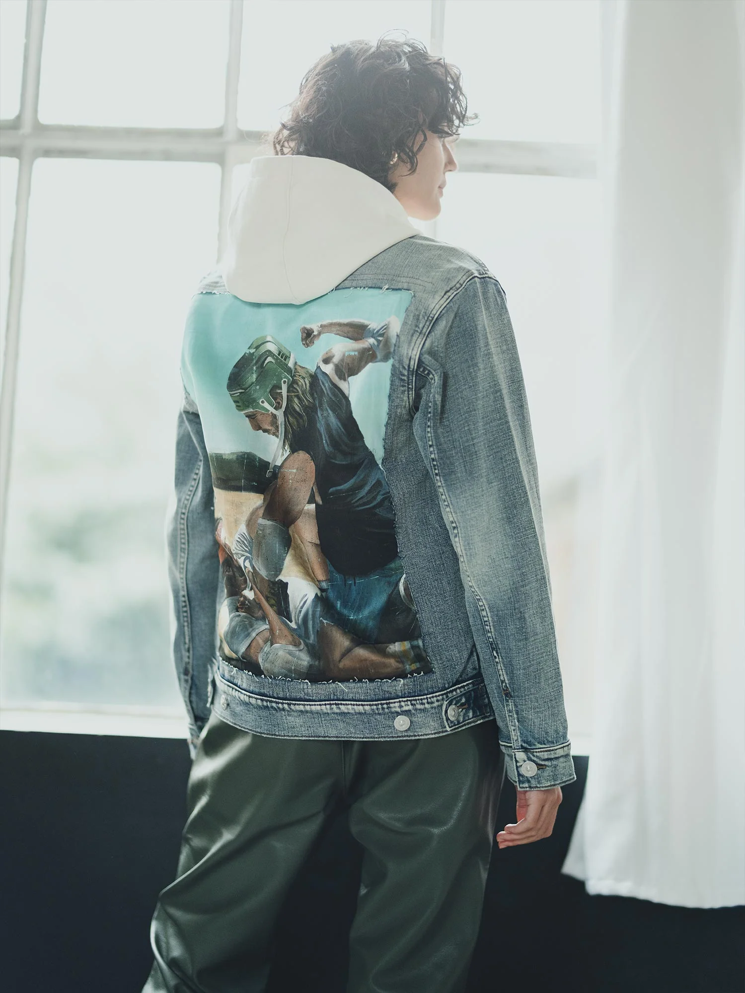 Cette veste Unisexe en jean brut used et délavé par endroits, est sublimée par un empiècement dorsal imprimé de l’œuvre « Fight For Territory » de l’artiste MATHIEU QUESTEL.