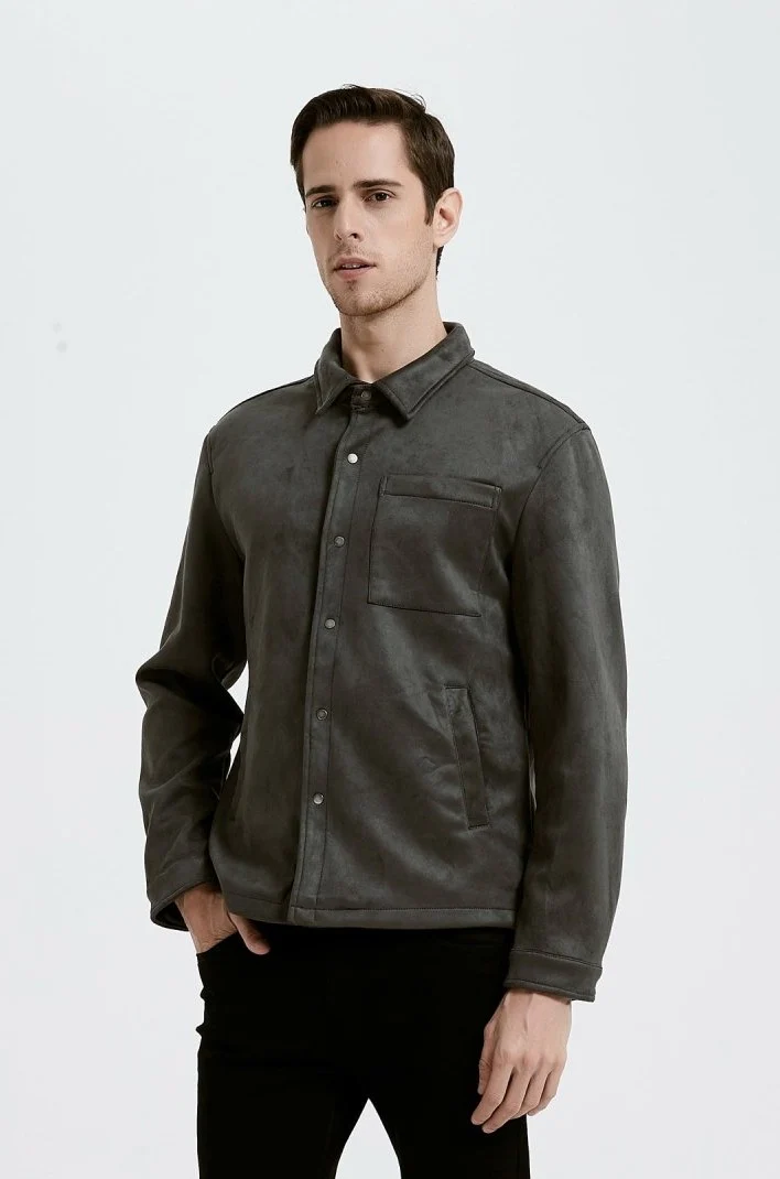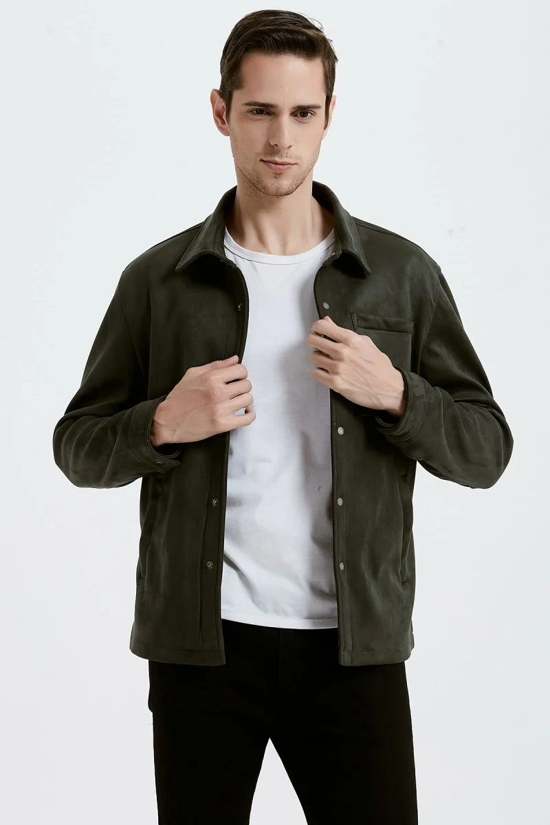 Veste légère coupe droite. Tissu doux en suédine. Col chemise avec pression métallisée. Fermeture à pressions assorties. 1 poche plaquée à pression sur le torse. 2 poches classiques à pressions sur les côtés. Manche avec ouverture à pression sur les poignets. Doublure synthétique avec poche intérieure.