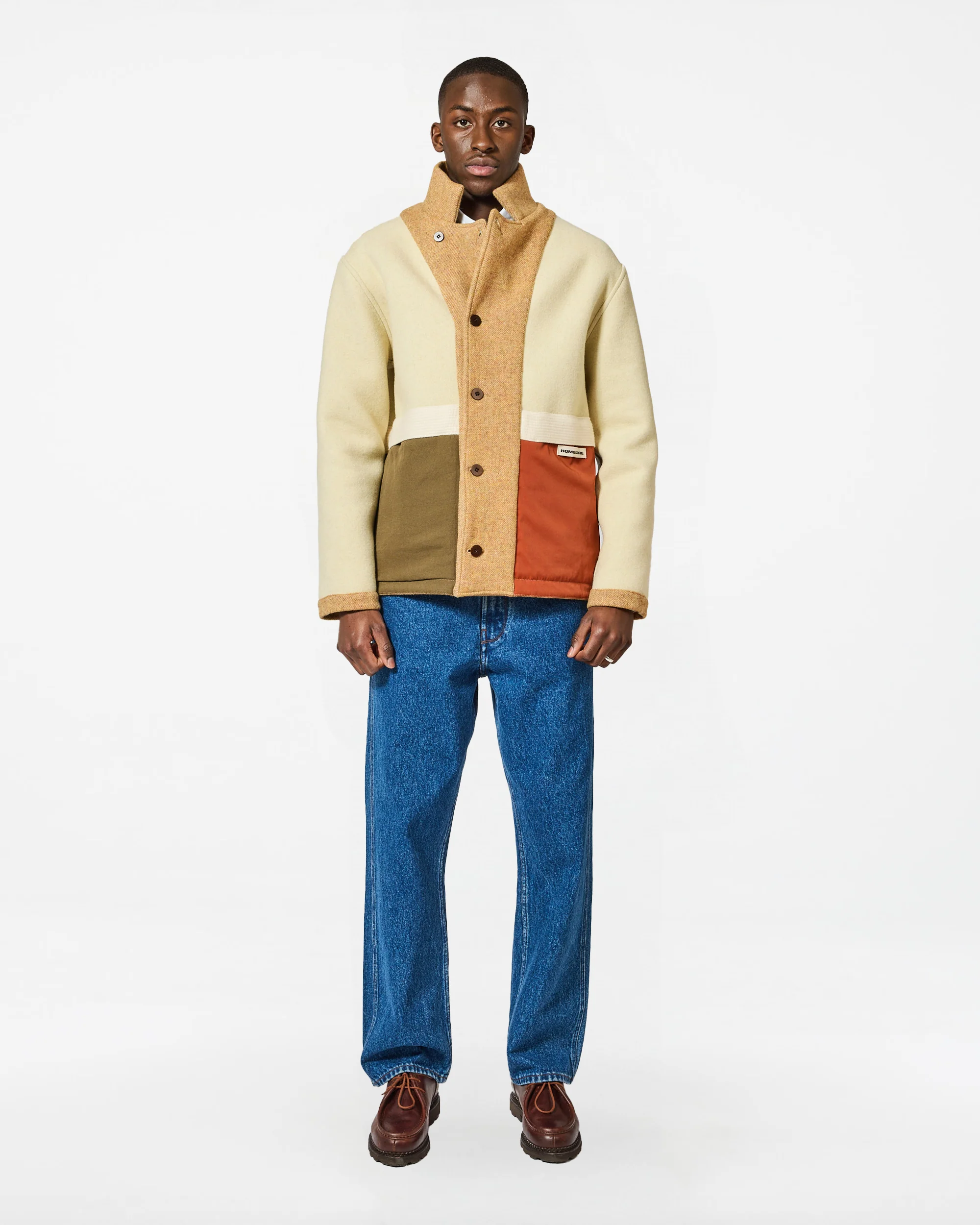Pensée pour une allure sobre et fonctionnelle, cette veste réversible à coupe droite joue sur les contrastes entre intérieur et extérieur. Sa bande décorative en chevron placée à la taille intérieure ajoute une touche de raffinement discrète. Dotée de grandes poches plaquées des deux côtés, elle allie style utilitaire et engagement durable grâce à l’utilisation de tissus upcyclés.