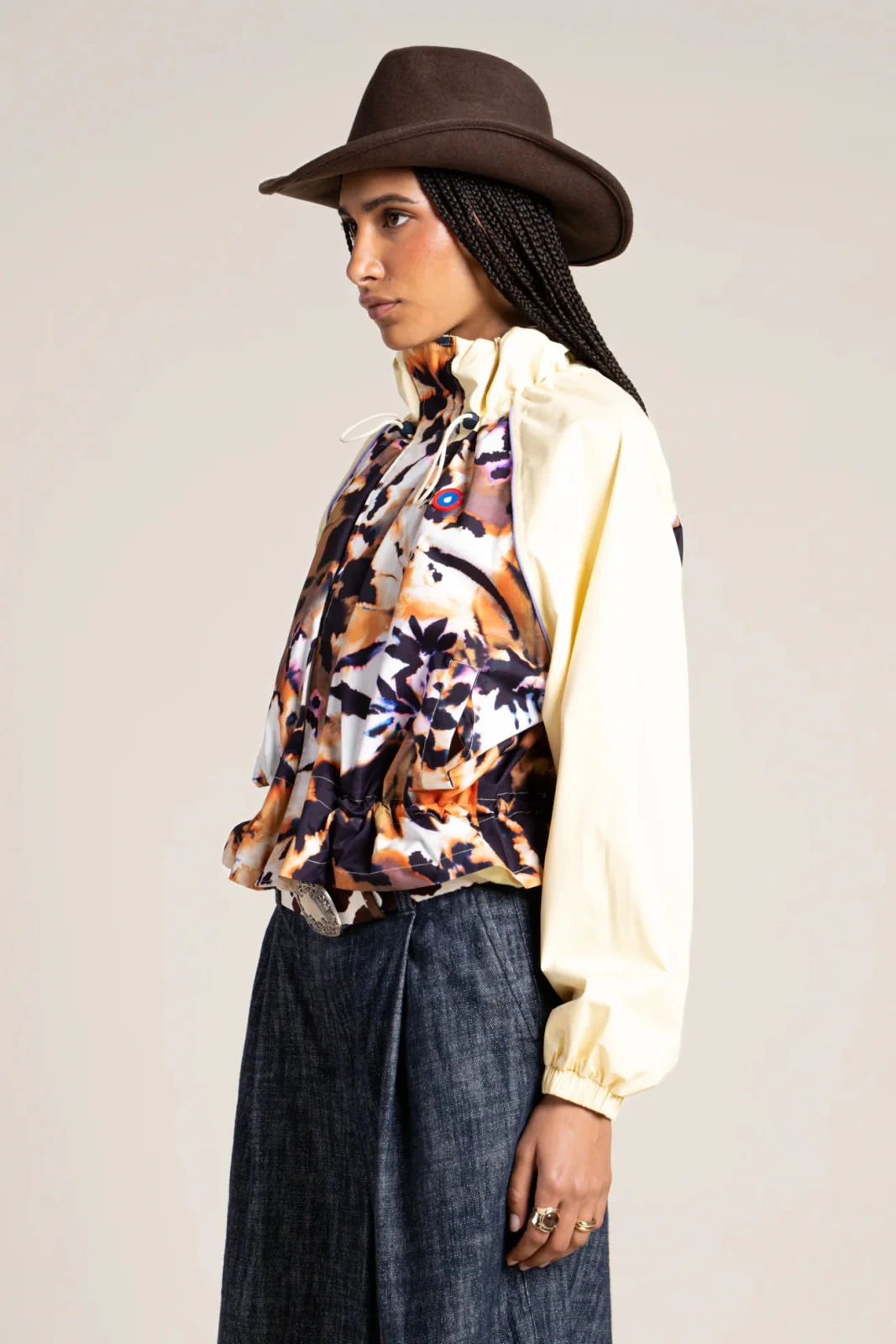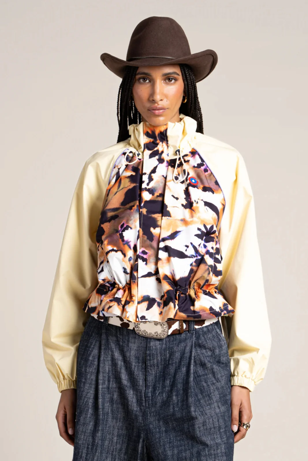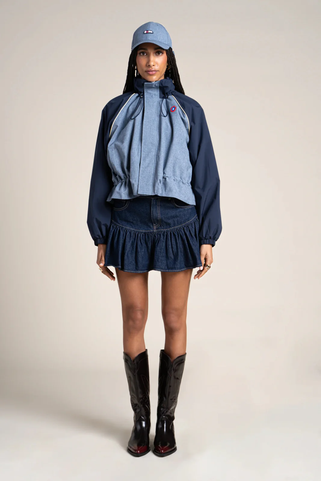 Veste courte effet crop-top. Imperméable et coupe-vent. Tissu en polyester recyclé, respirant et léger. Resserrée à la taille et au col.
