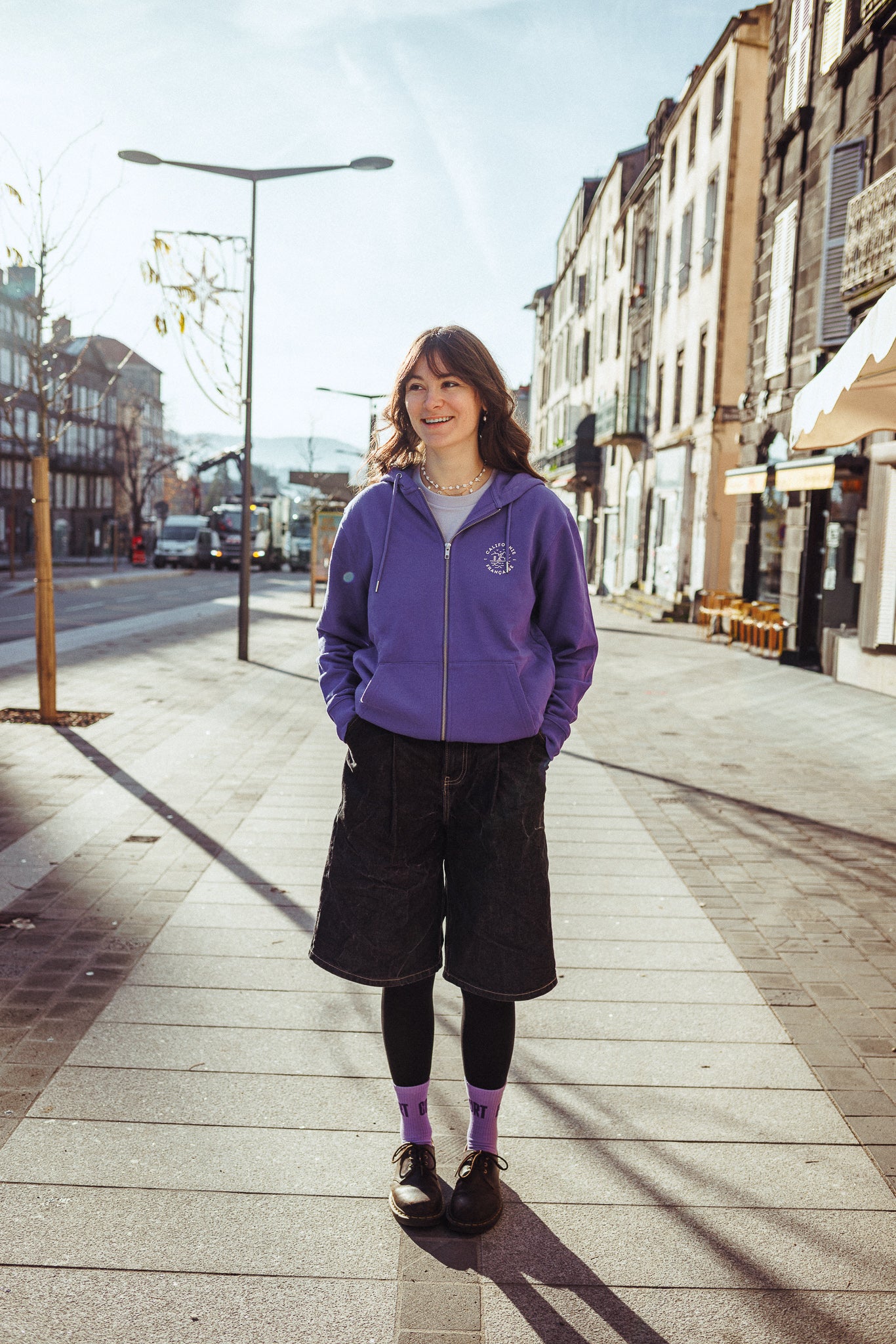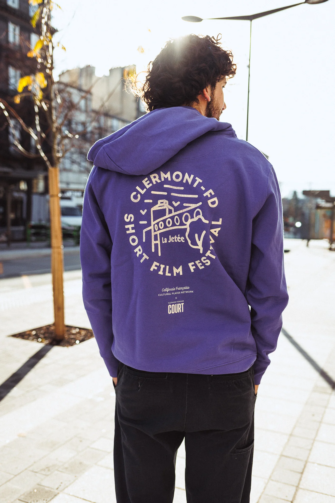 Cette année, le hoodie officiel du Festival International du Court-Métrage de Clermont-Ferrand se pare d’un puissant violet en hommage au navire et à la silhouette iconique de la cathédrale à l’affiche de cette 48ème édition. Rendez-vous du 30 janvier au 7 février 2026 !